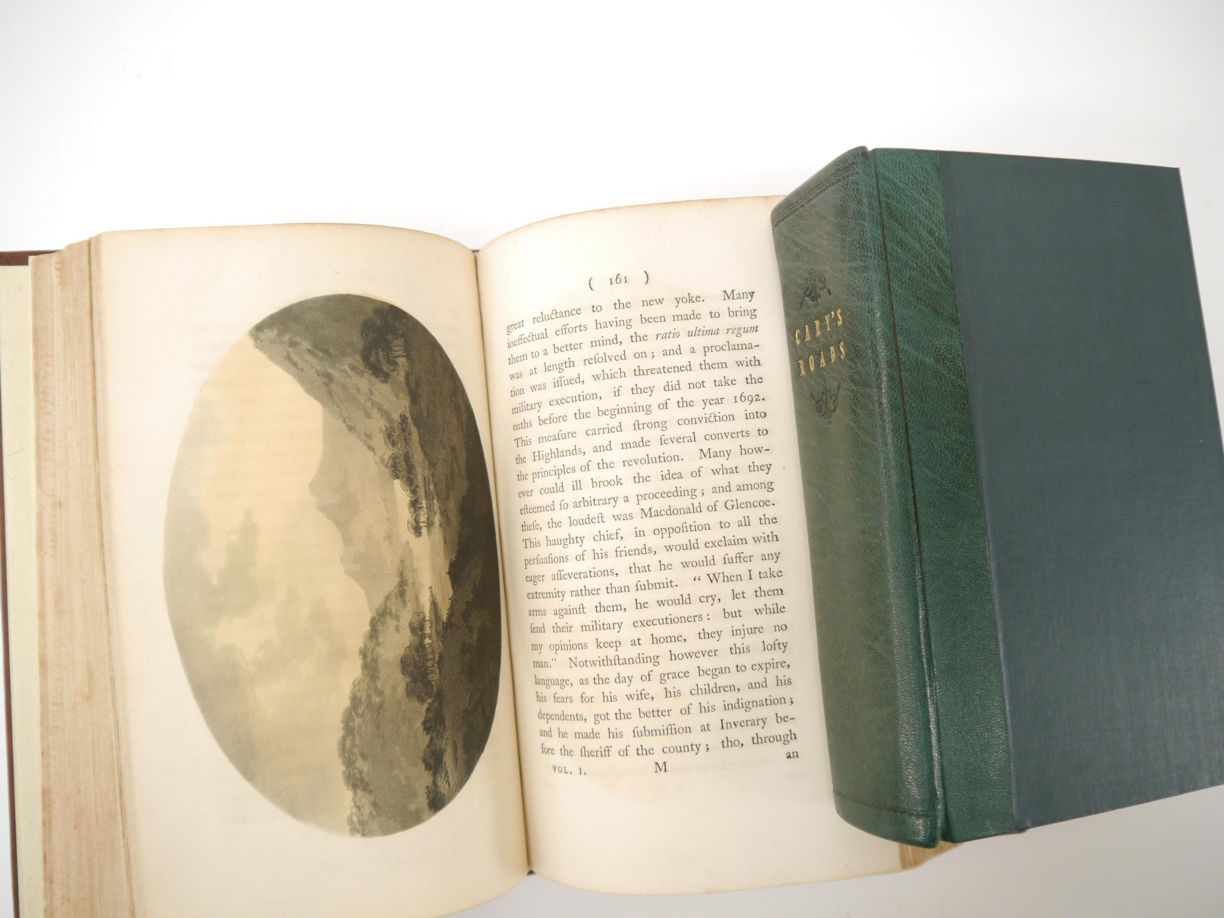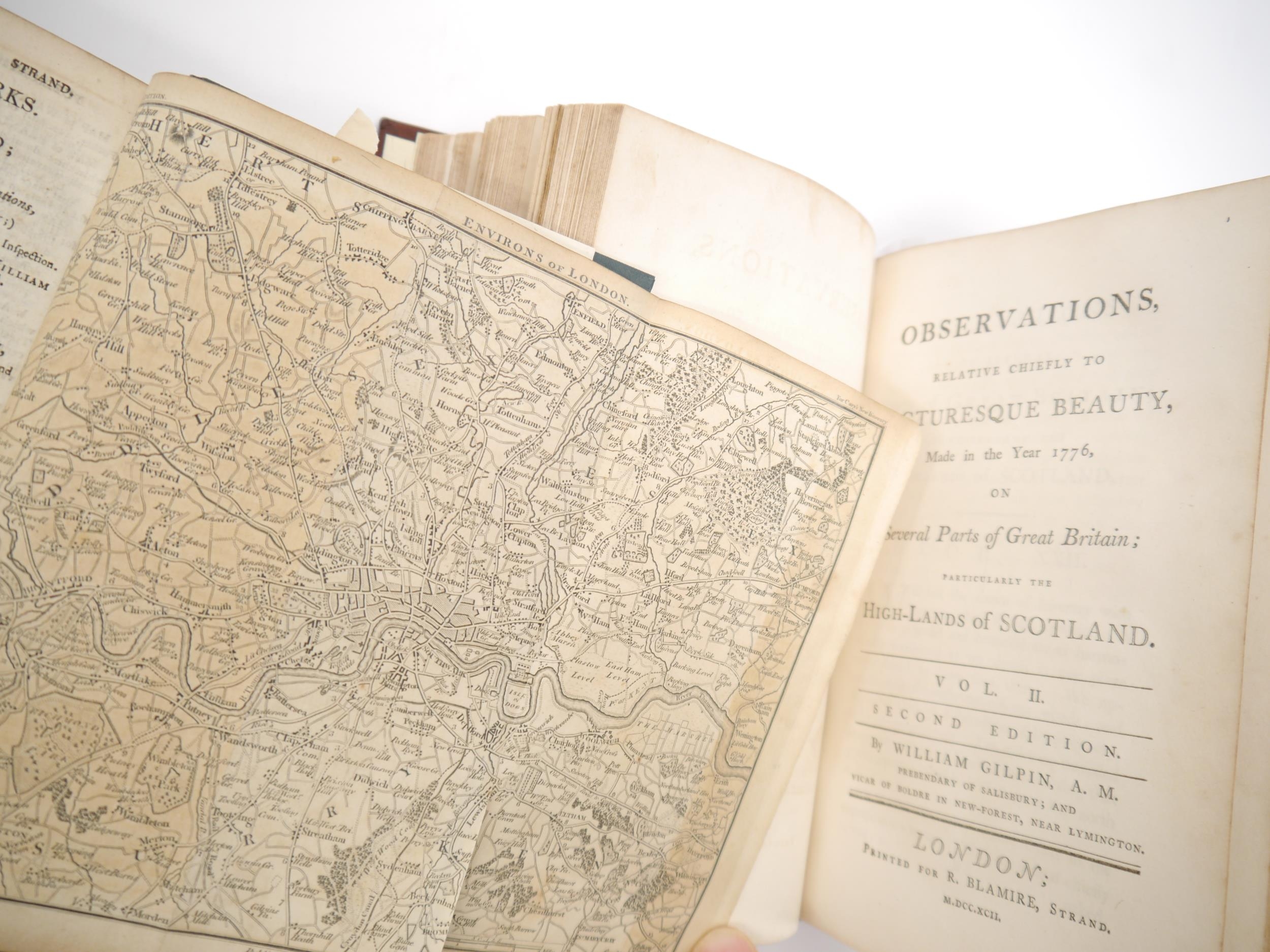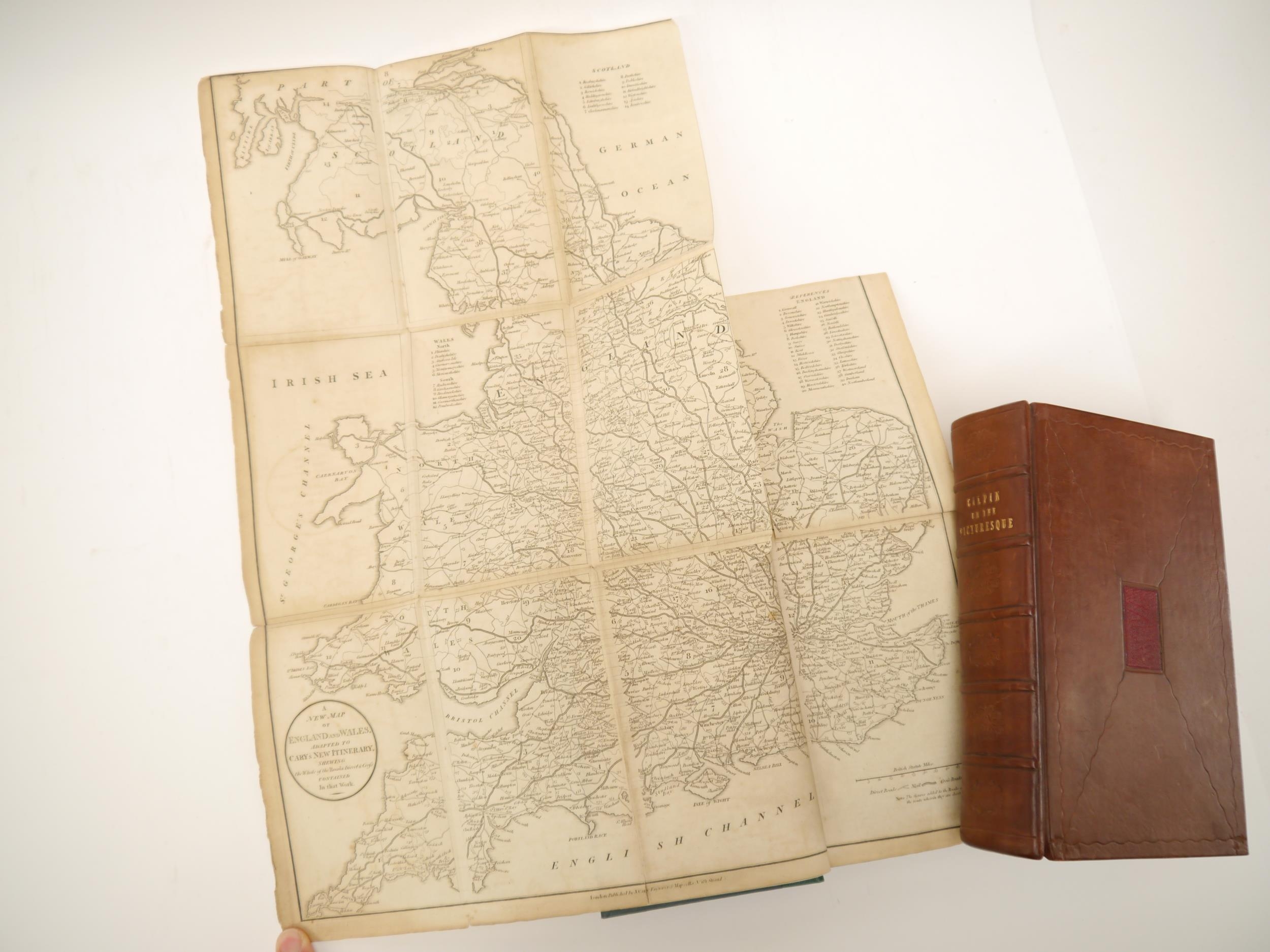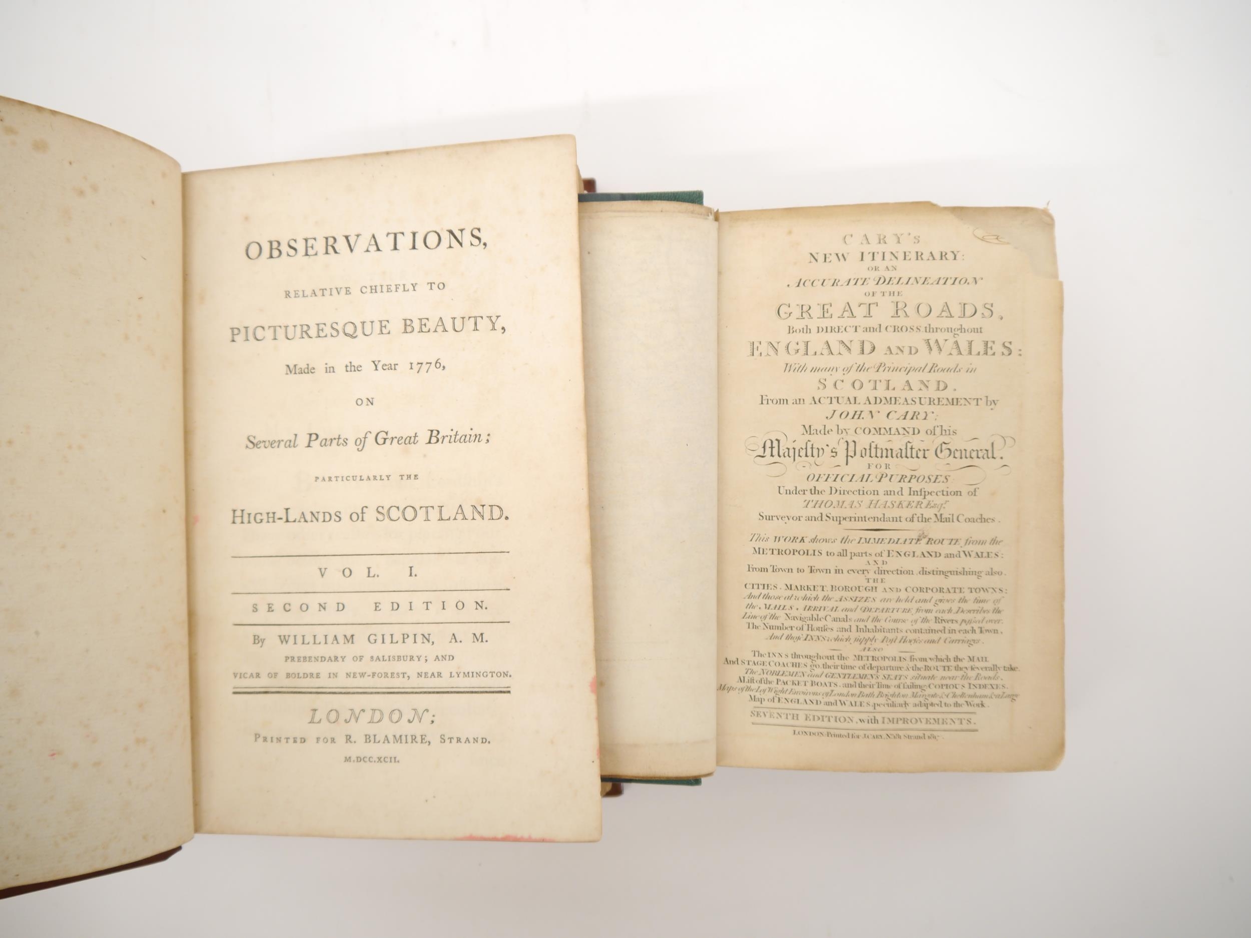 William Gilpin: 'Observations, Relative Chiefly to Picturesque Beauty, Made in the Year 1776, on Several Parts of Great Britain; Particularly the High-Lands of Scotland', London, R. Blamire, 1792, 2nd edition, 3 volumes, 40 plates comprising 1 diagram, 5 hand coloured plans + 34 soft ground aquatints, bound together with 'Observations on the River Wye, and Several Parts of South Wales, &c., relative chiefly to Picturesque Beauty; Made In the Summer of the Year 1770', L, R. Blamire, 1792, 3rd edition, 17 soft ground aquatints, rebound full panelled calf gilt; together with John Cary: 'Cary's New Itinerary: Or an Accurate Delineation of the Great Roads...throughout England and Wales', 1817, 7th edition, large folding frontis map of England and Wales + 6 folding maps at end only, rebound quarter blue morocco gilt (2)