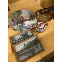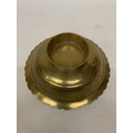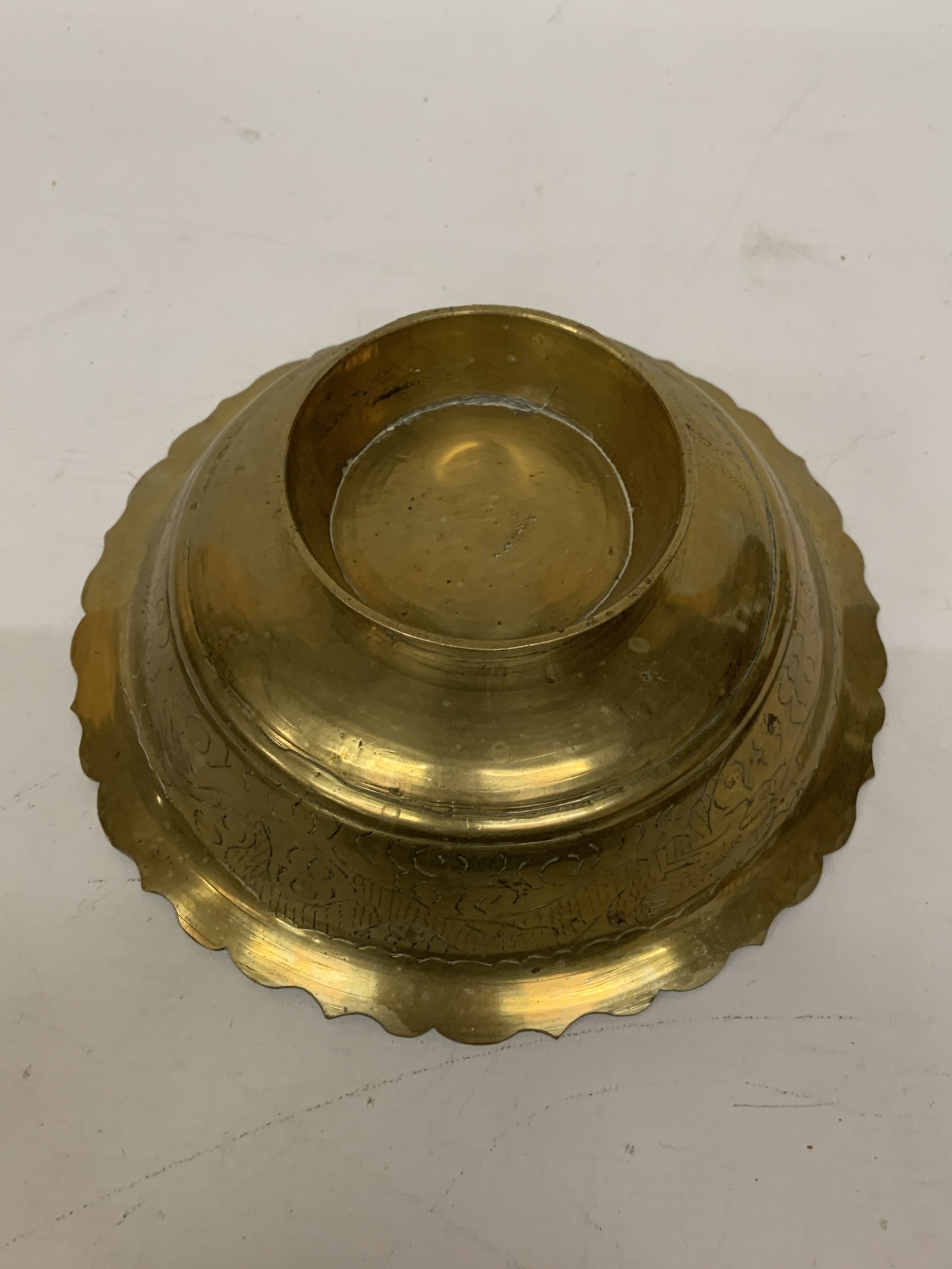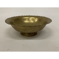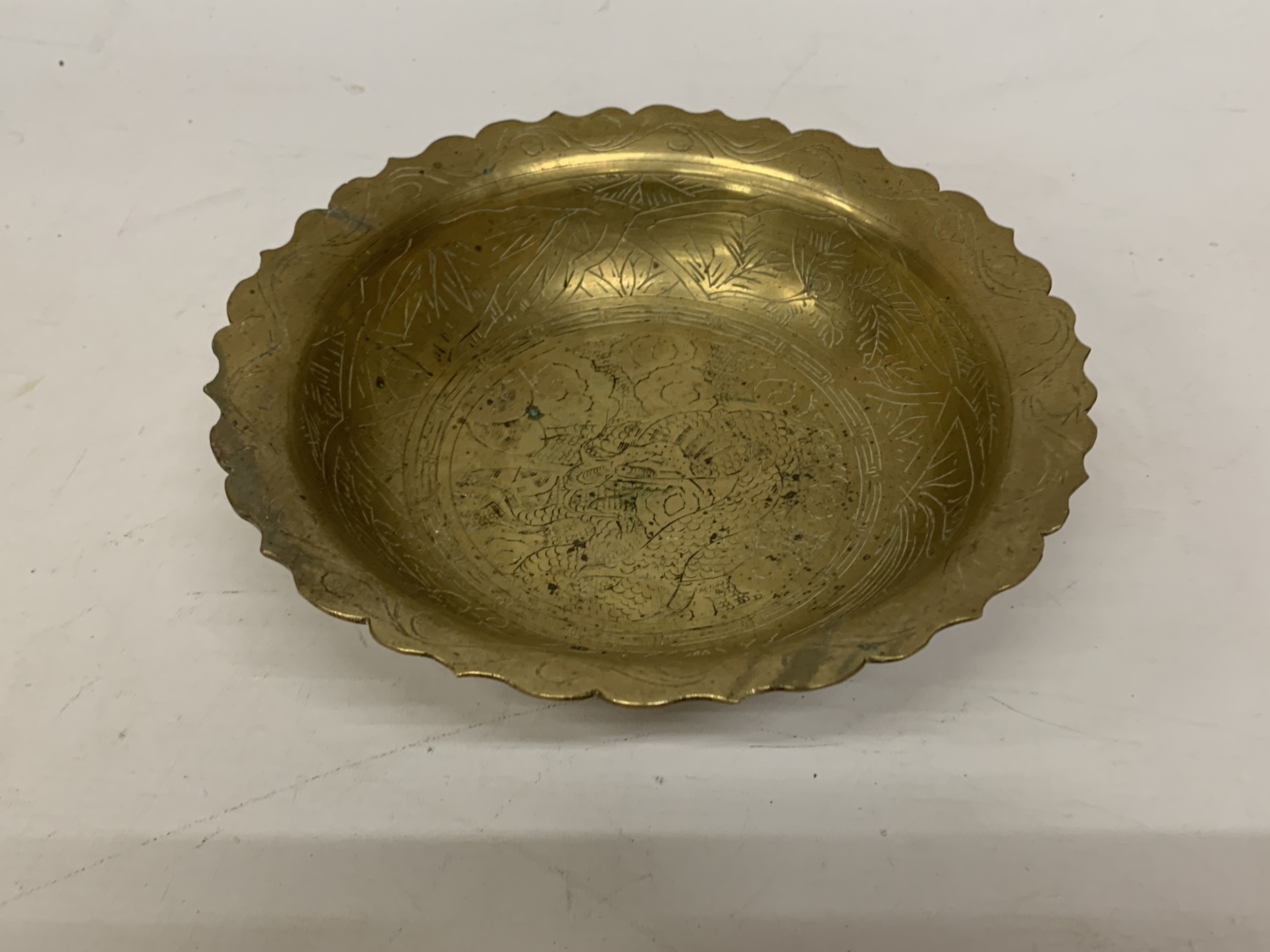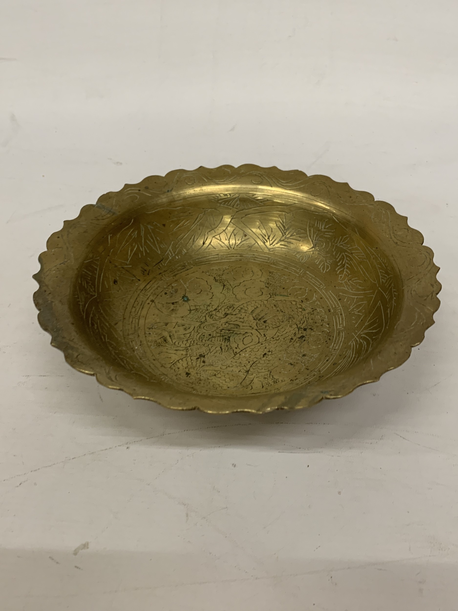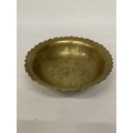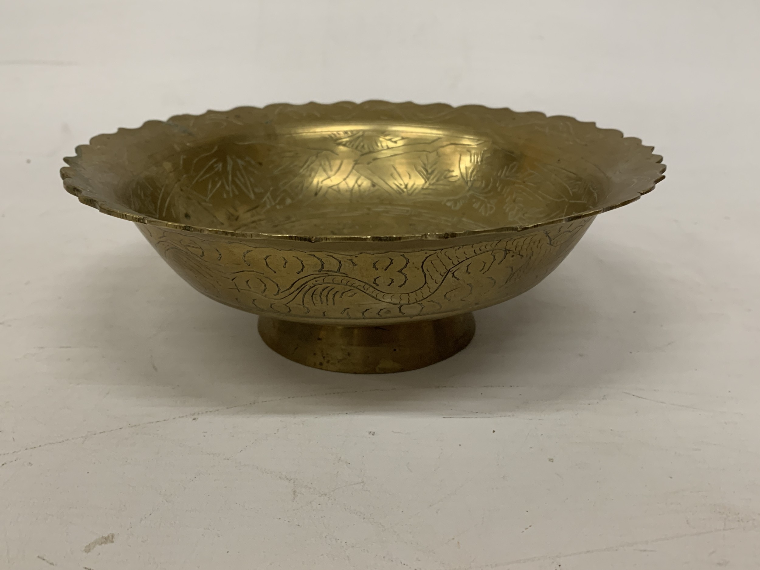 A VINTAGE CHINESE ENGRAVED BRASS DRAGON BOWL WITH A SCALLOPED EDGE - 8 CM (H), 23 CM (D)