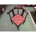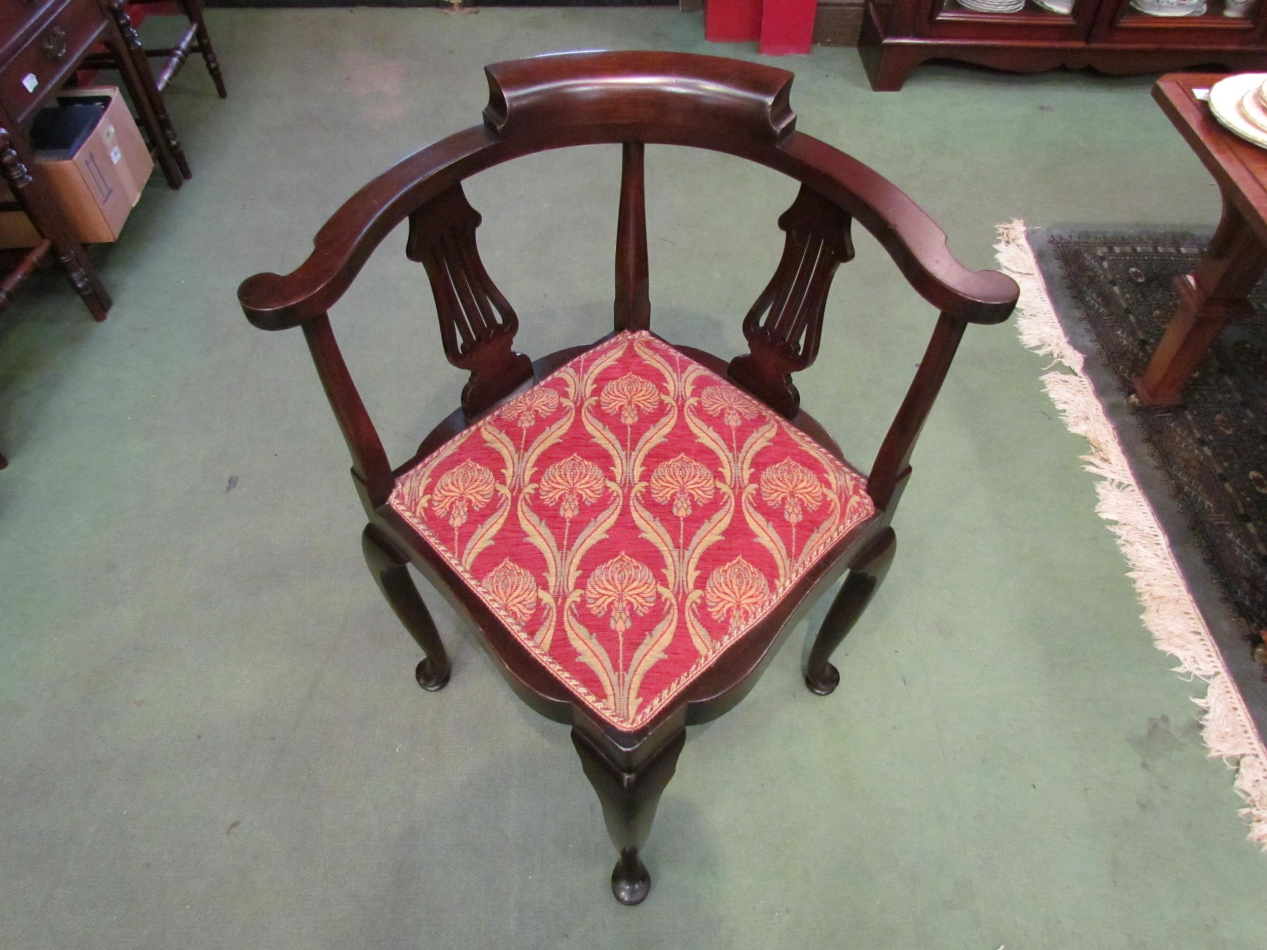 A Circa 1900 Arts & Crafts mahogany corner chair the scroll arms over pierced splat supports on pad foot cabriole legs