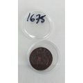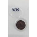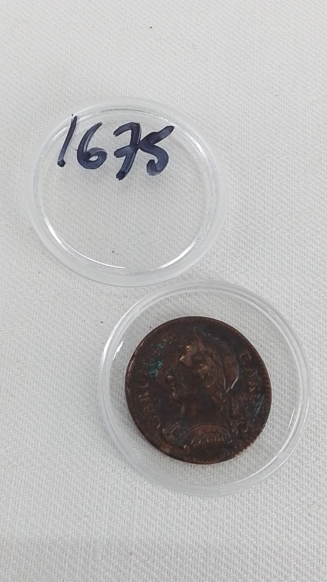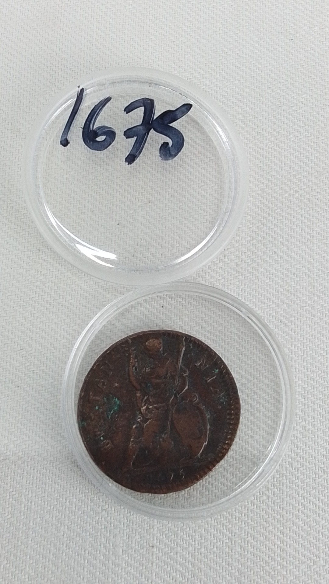 An early 1675 Charles II Copper Farthing coin, cased in a clear capsule.