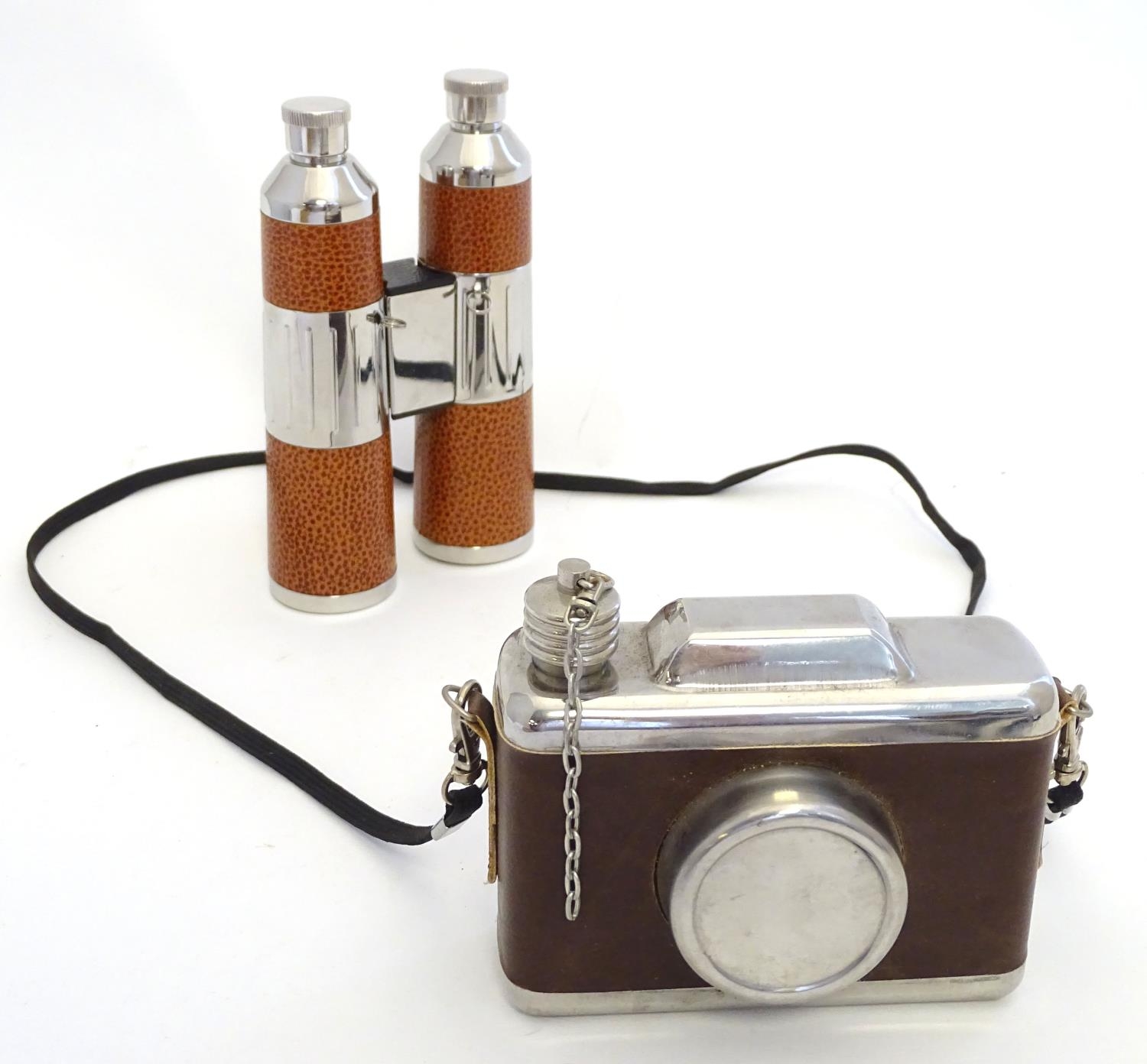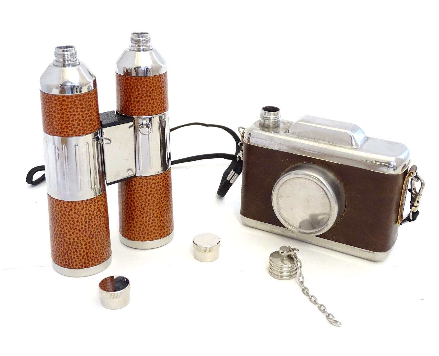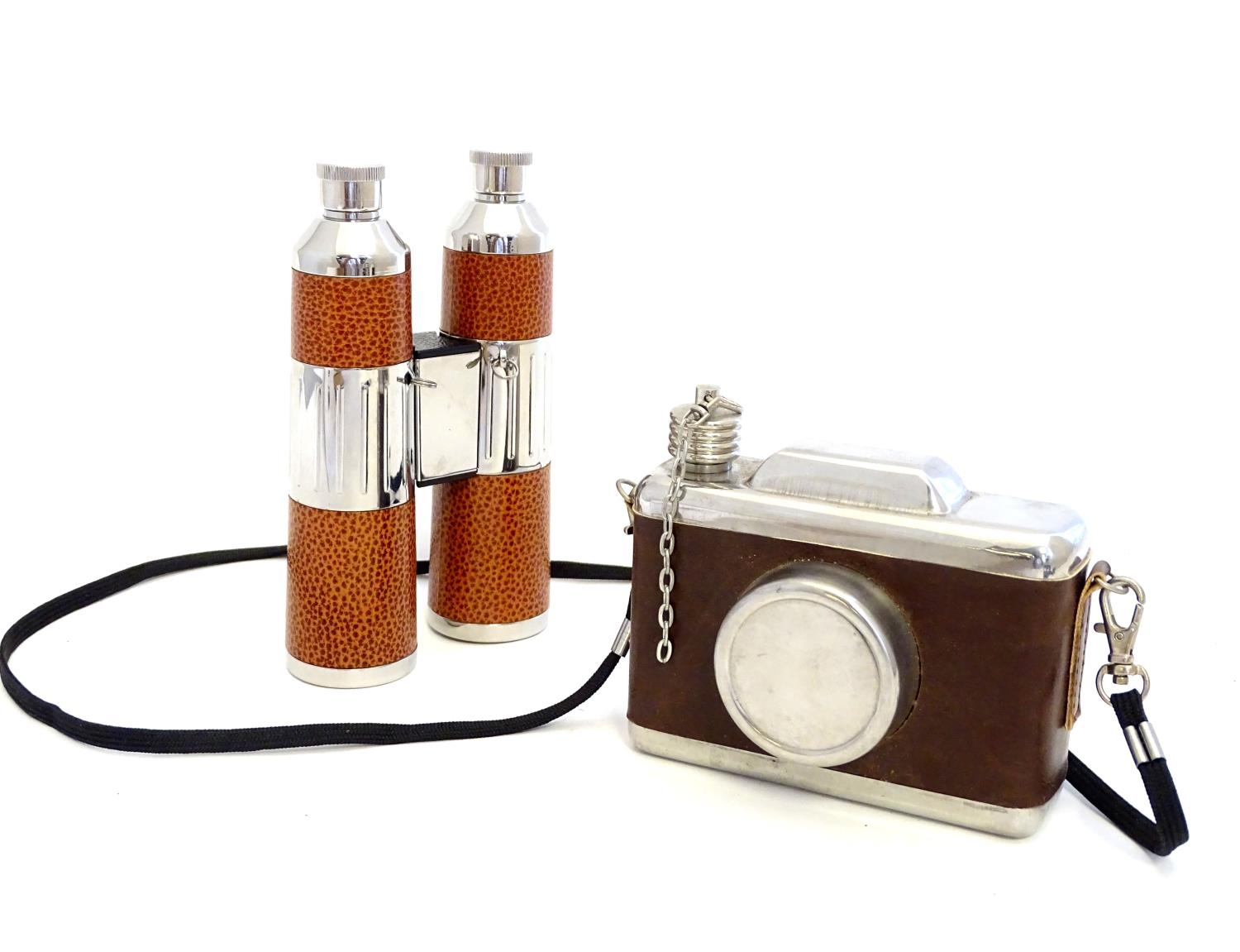 Two novelty hip flasks, one formed as a camera, the other a twin flask formed as binoculars (2)