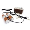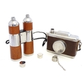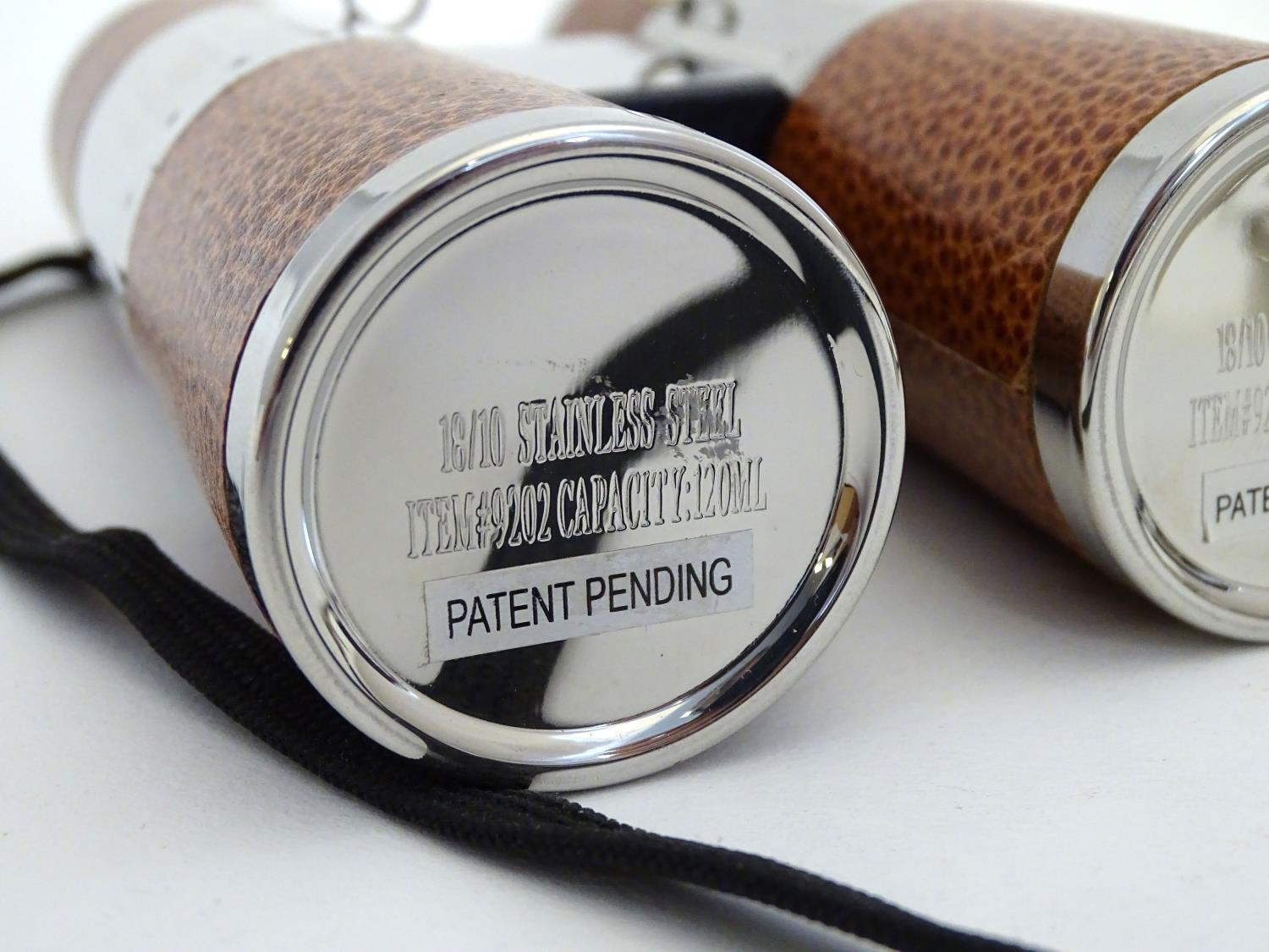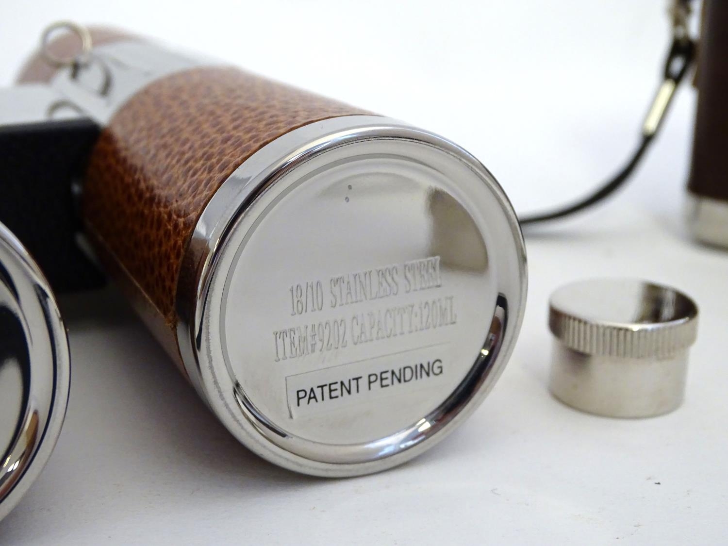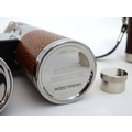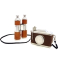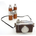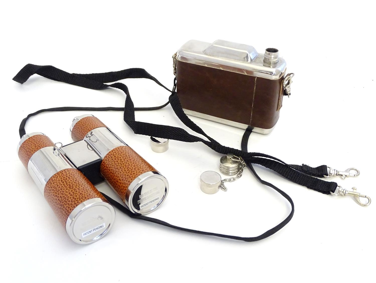 Two novelty hip flasks, one formed as a camera, the other a twin flask formed as binoculars (2)