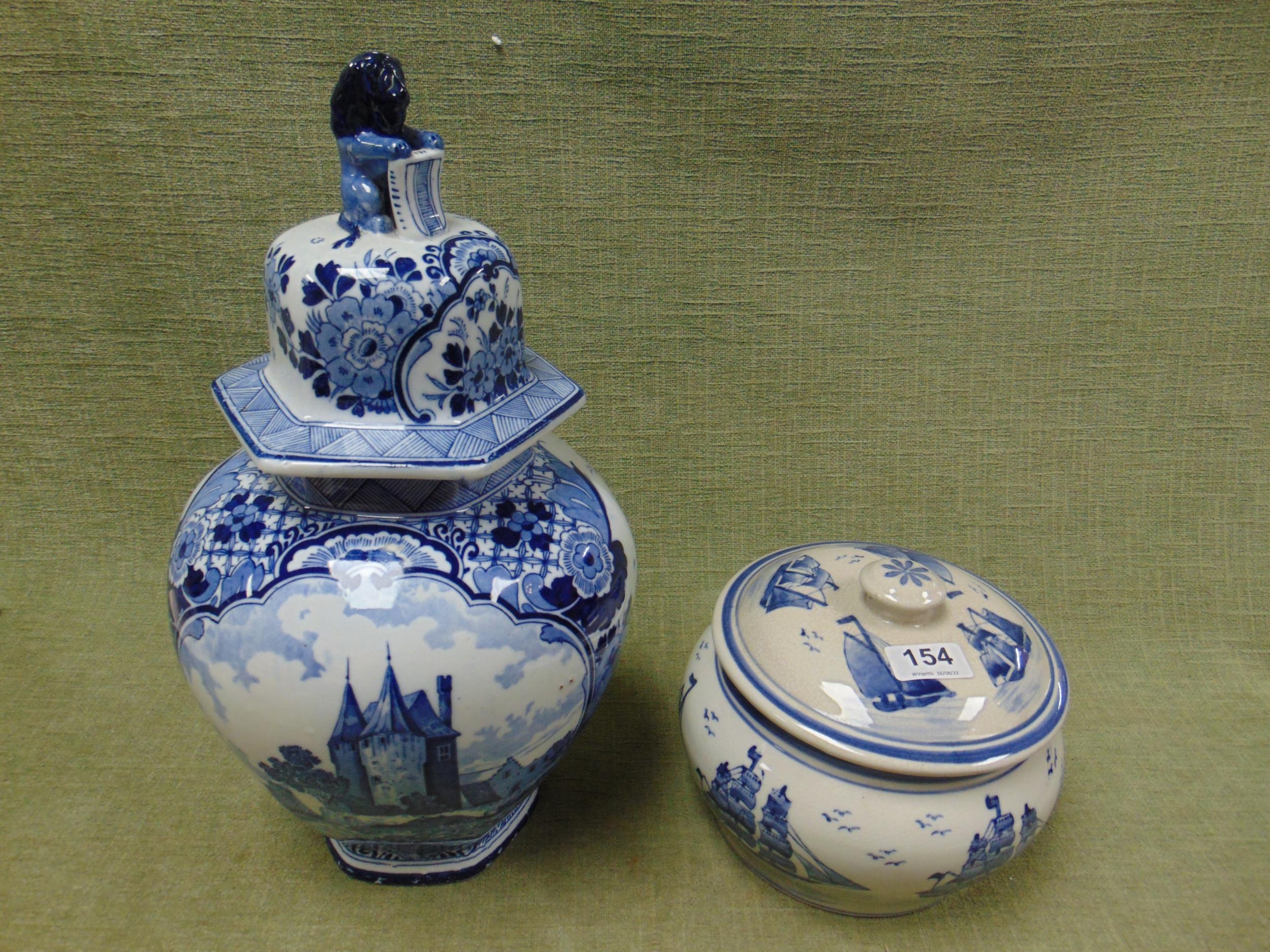 Delft blue and white lidded vase, 16" high, and a similar lidded bowl, 6" high.