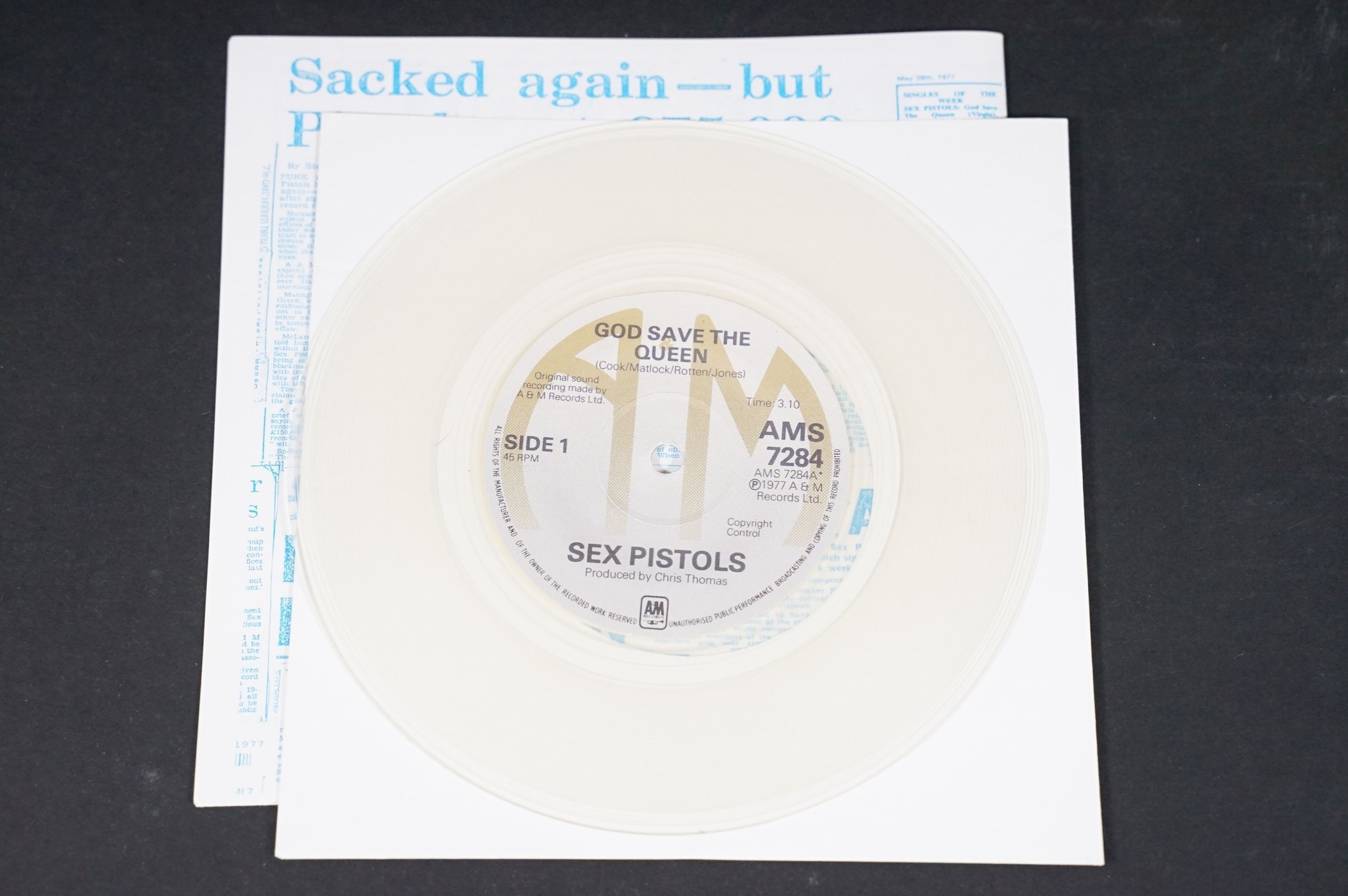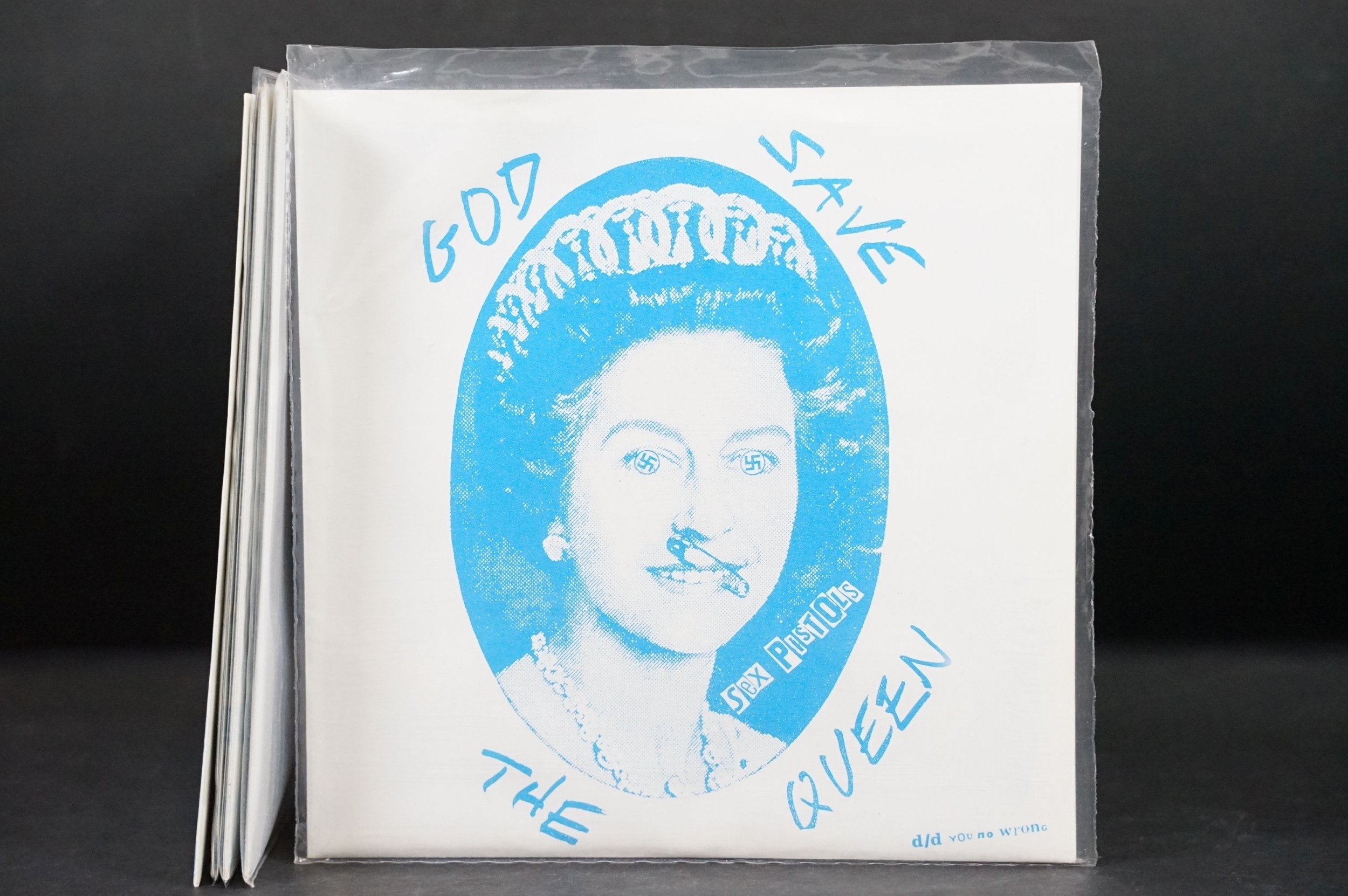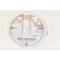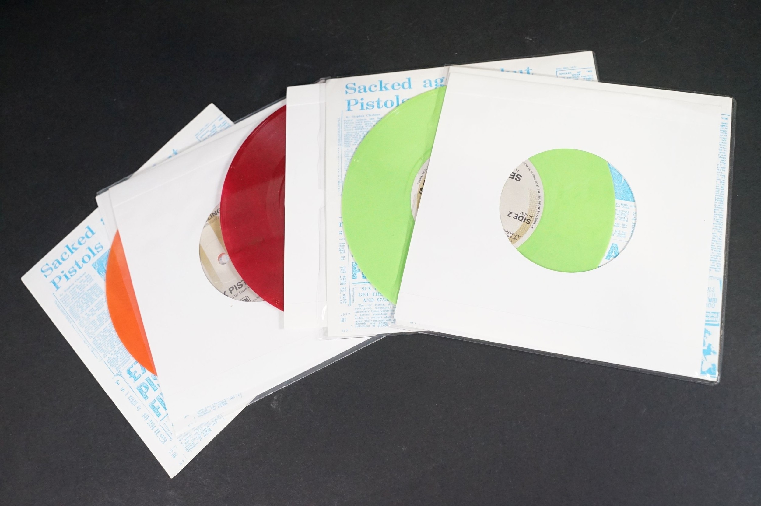 Vinyl - Punk - Sex Pistols, 4 different coloured vinyl UK 2012 re-pressing of “God Save The Queen”, clear, orange, red and green marbled vinyl. All come with swastika eyes queen fold out poster picture sleeves, also comes with one extra empty poster sleeve. EX+