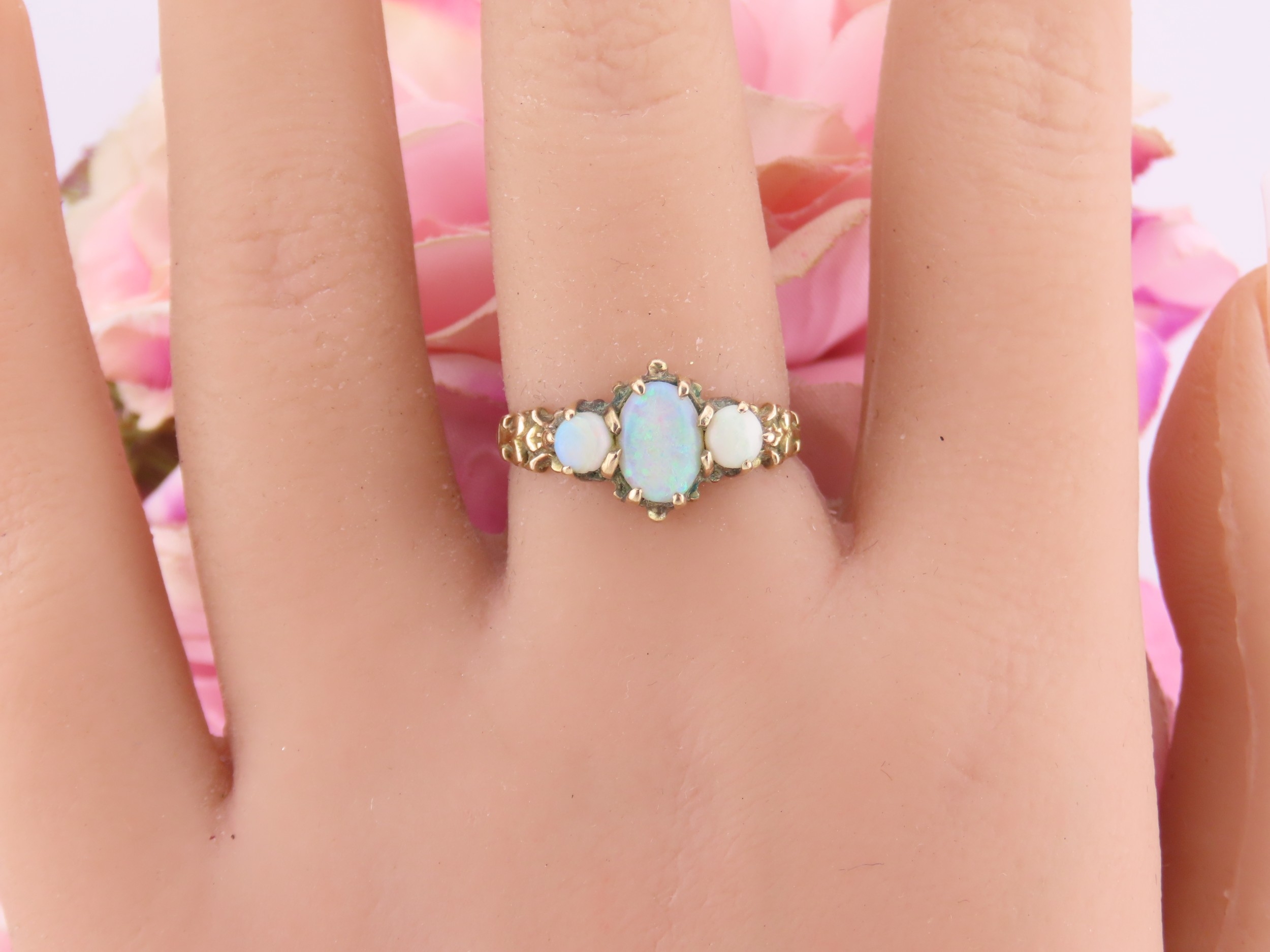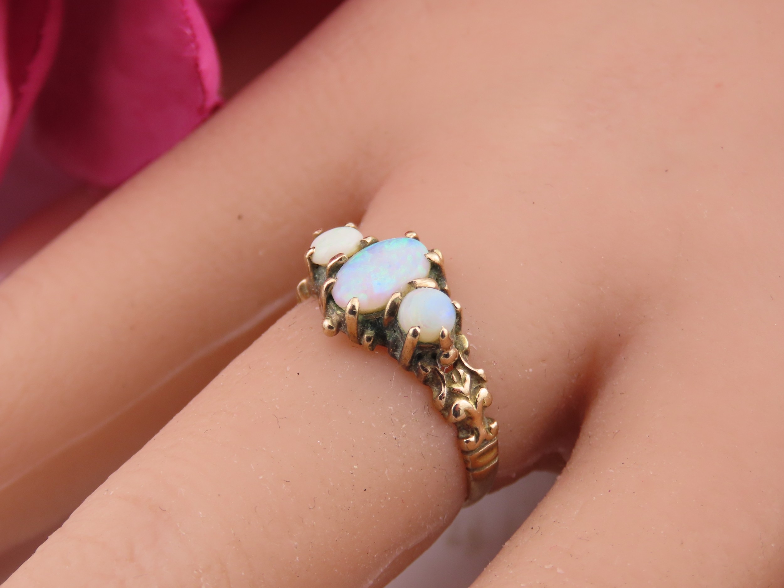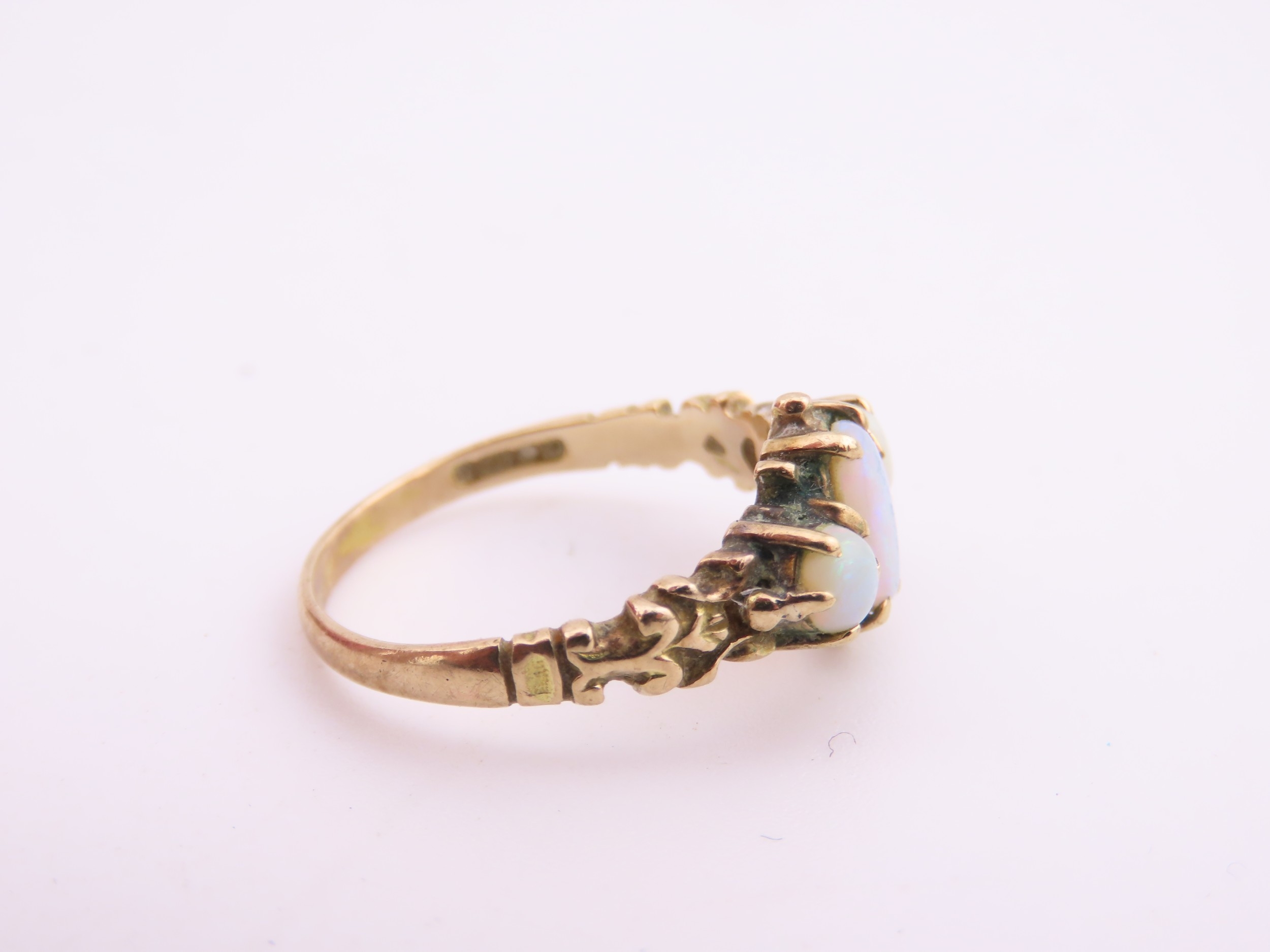 A 9 carat gold opal trilogy ring, set with three graduated oval cabochon opals displaying characteristic play of colour, mounted in a yellow gold setting with decorative shoulders. Ring size M. Gross weight approximately 2.4 grams.