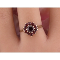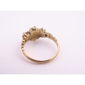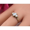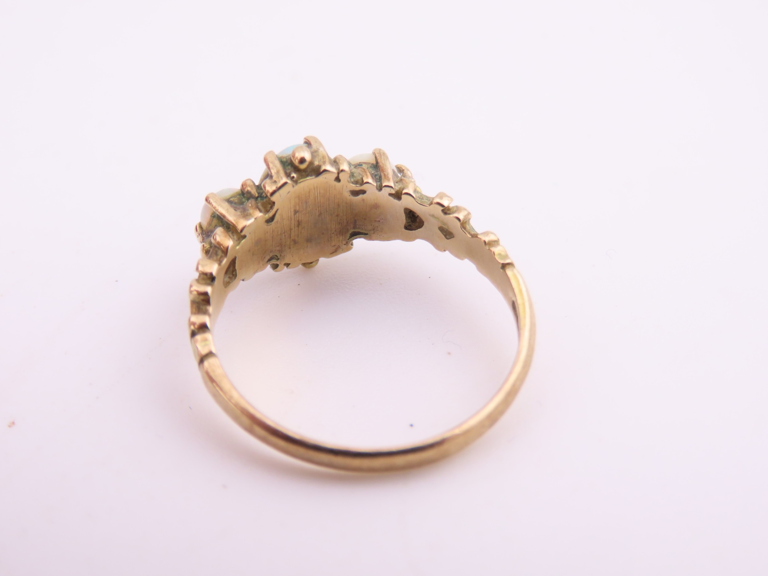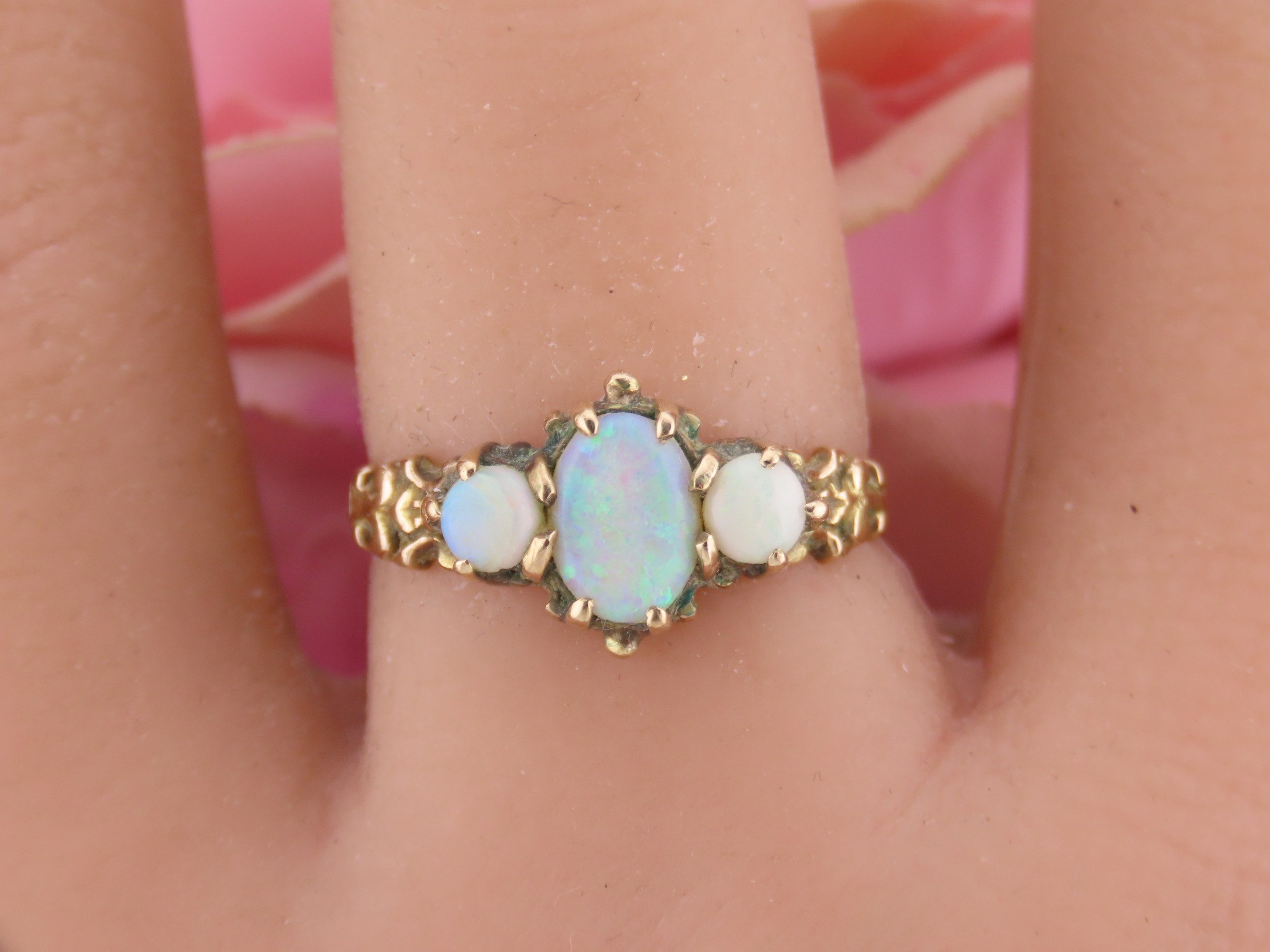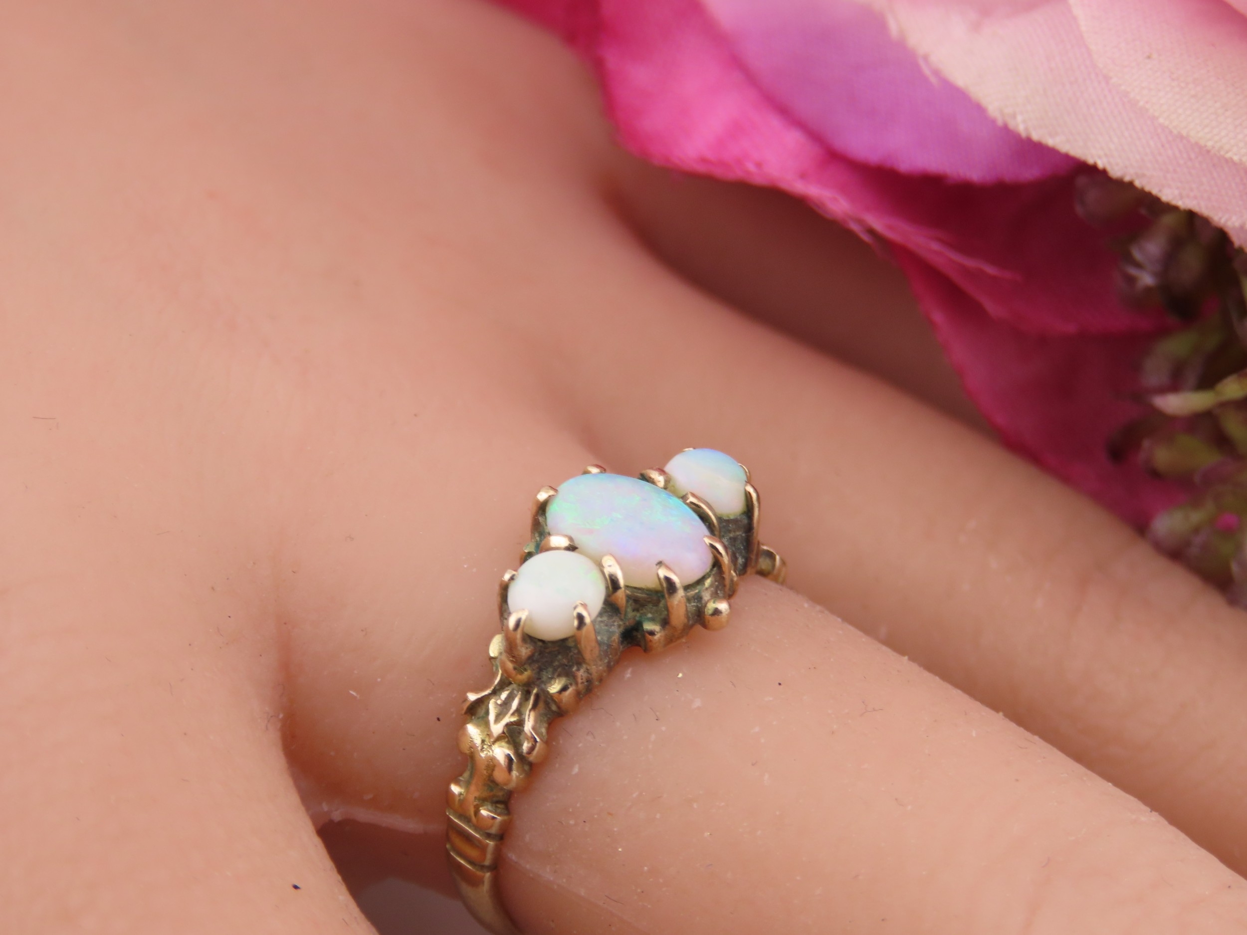 A 9 carat gold opal trilogy ring, set with three graduated oval cabochon opals displaying characteristic play of colour, mounted in a yellow gold setting with decorative shoulders. Ring size M. Gross weight approximately 2.4 grams.