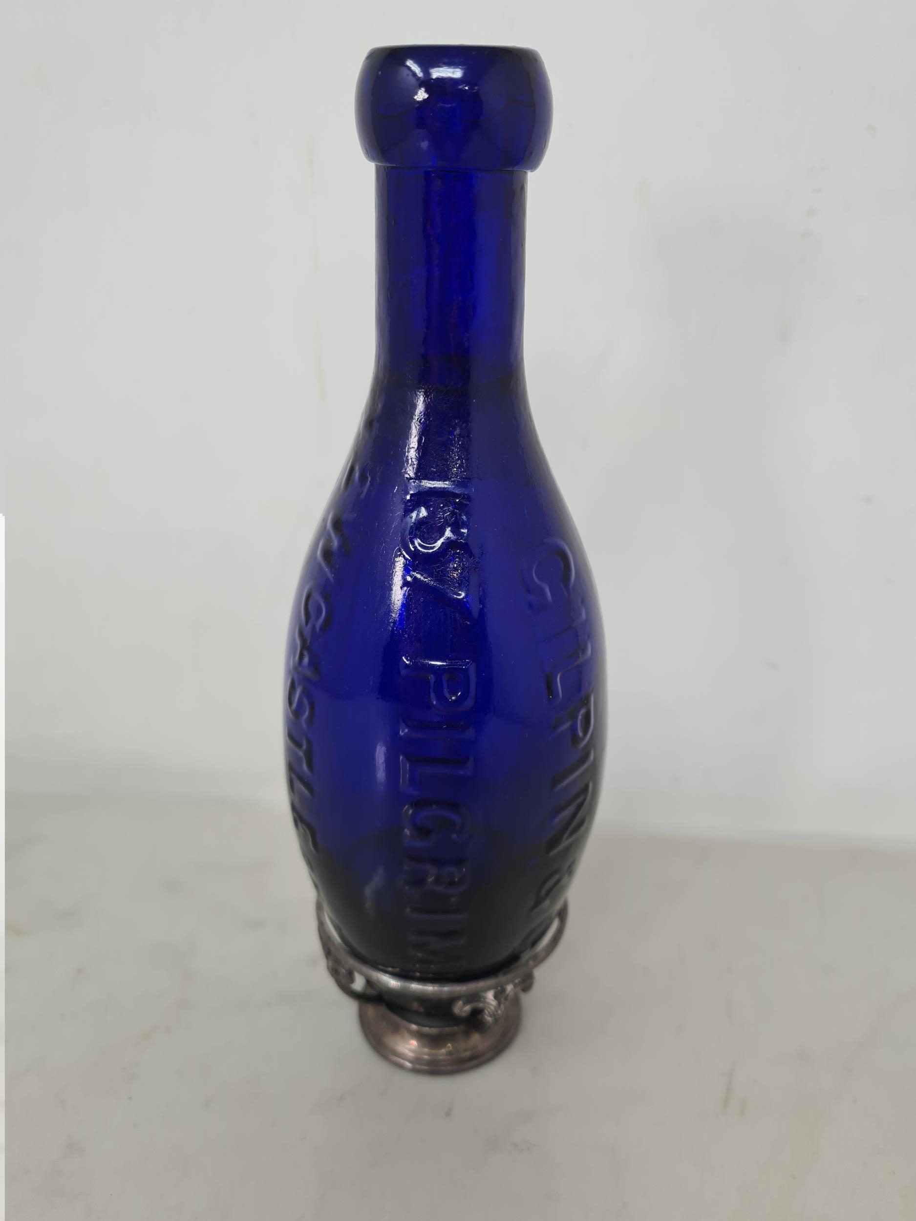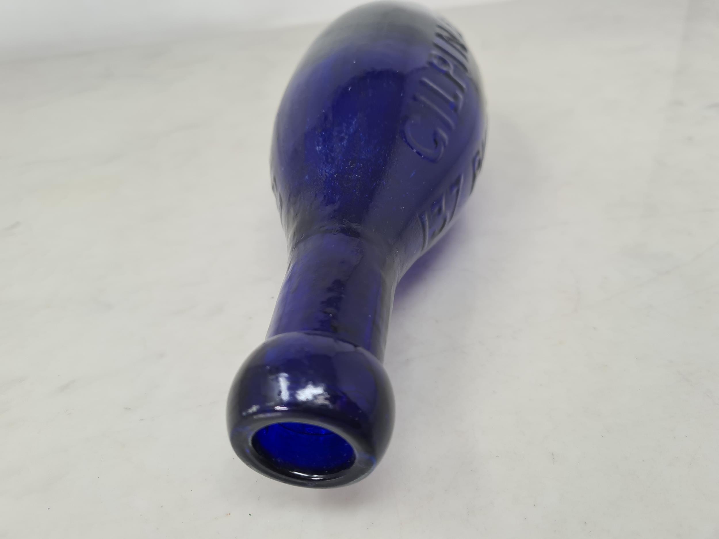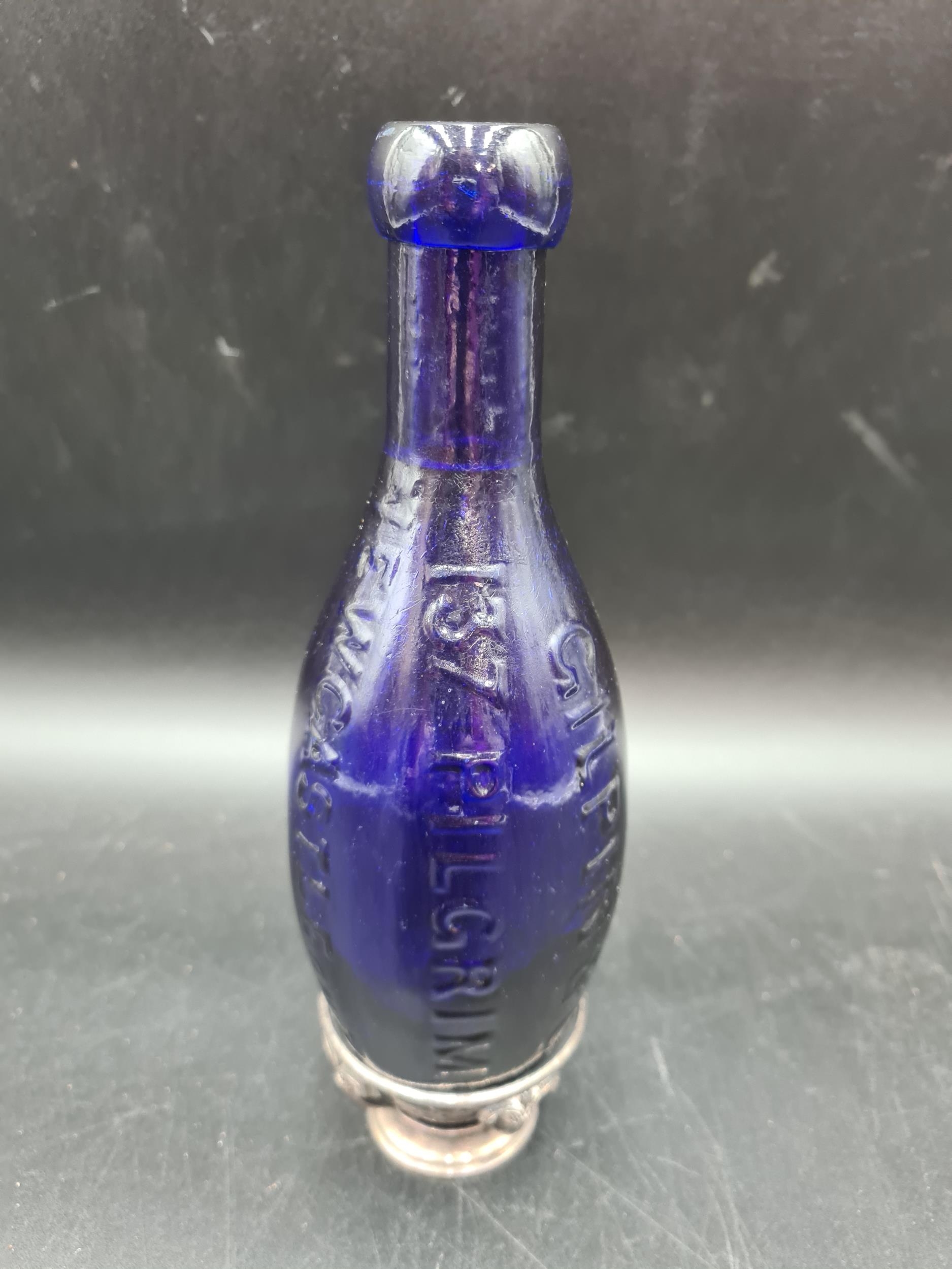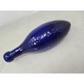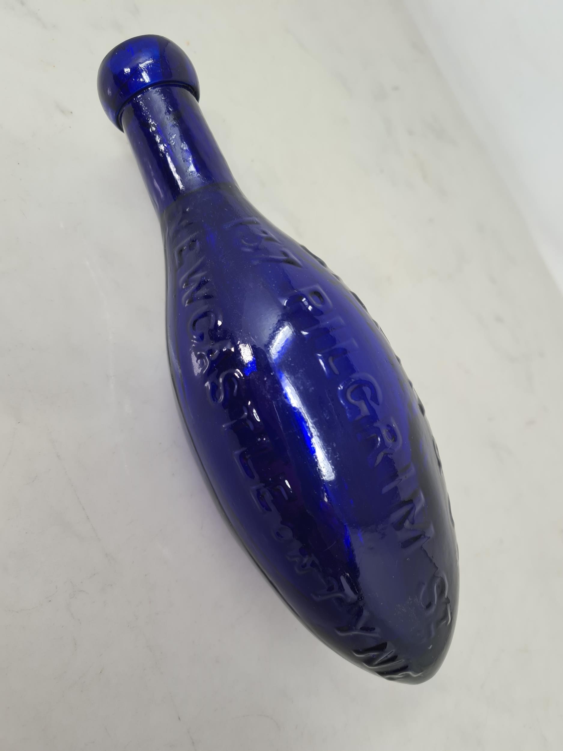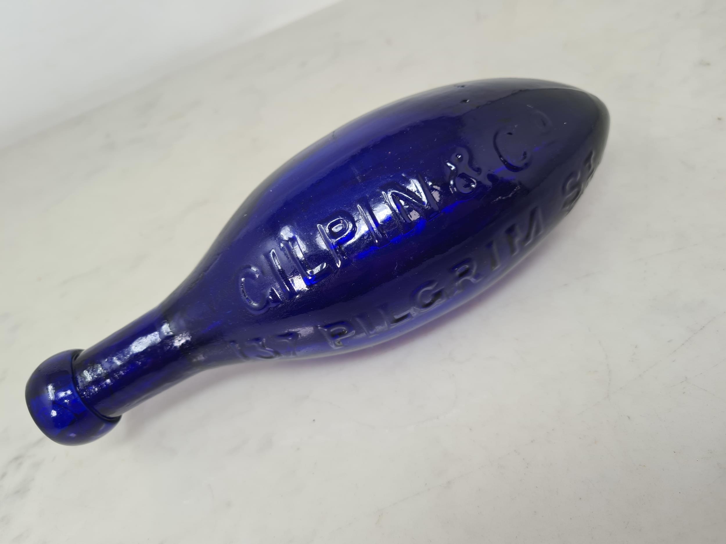 A blue glass torpedo shape Mineral Water or Fire Extinguisher Bottle moulded Gilpin & Co, 137 Pilgrim St, Newcastle on Tyne, Established 1790, 8 3/4in (CAB)