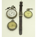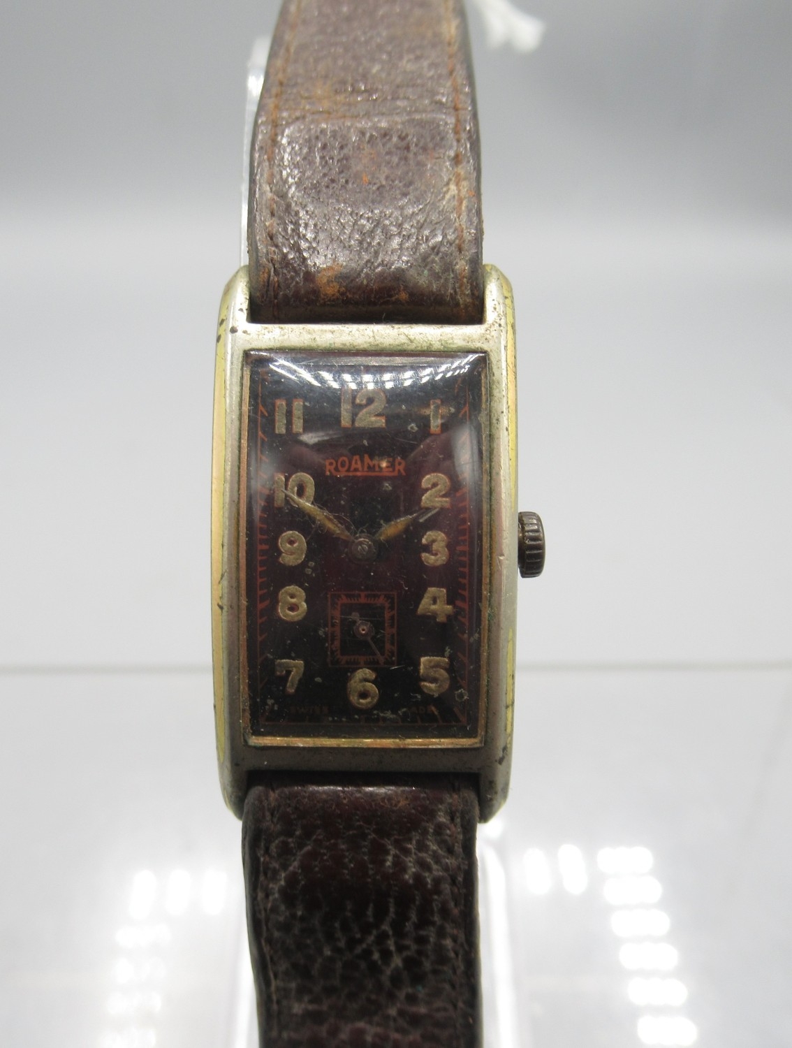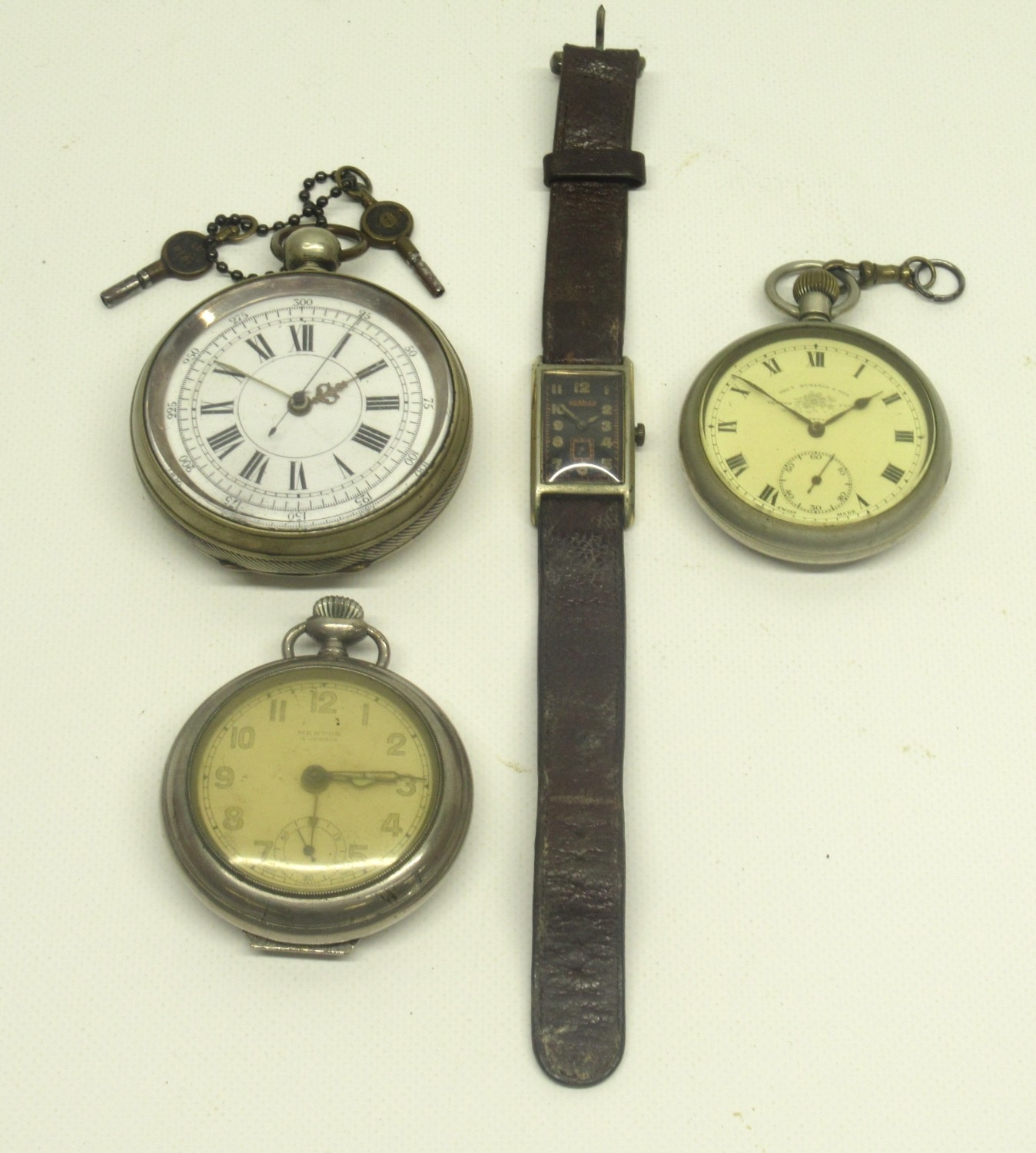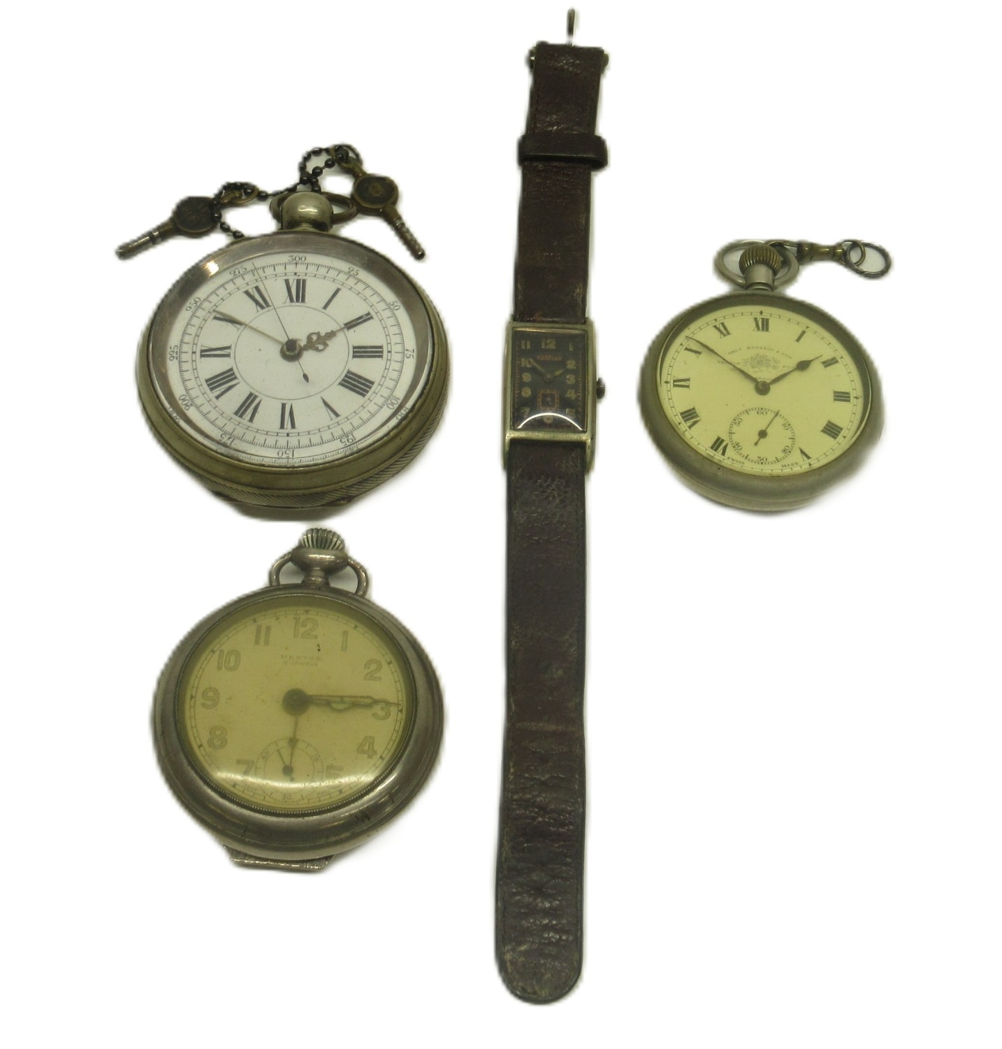 Roamer plated and stainless steel tank case wristwatch on period leather strap, signed black Arabic dial with subsidiary seconds, snap on case back no. 3058, Roamer 15 jewel movement, D19.5mm; Thos. Russell & Son Liverpool, Silvernus keyless pocket watch, signed white enamel Roman dial with subsidiary seconds, screw on case back no. 181/9191082, signed Swiss Made jewelled movement no. 55867, D51.1mm; Swiss nickel key wound chronograph type pocket watch, D63.2mm and Mentos keyless alarm pocket watch, D54.1mm