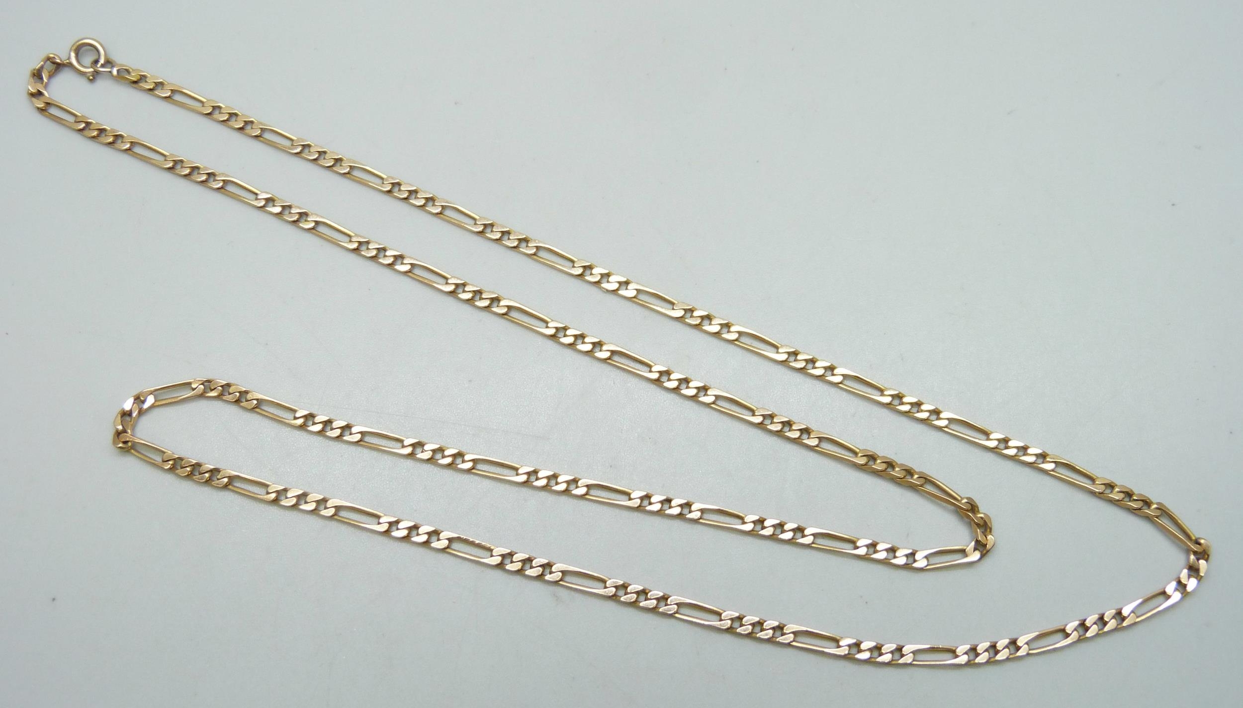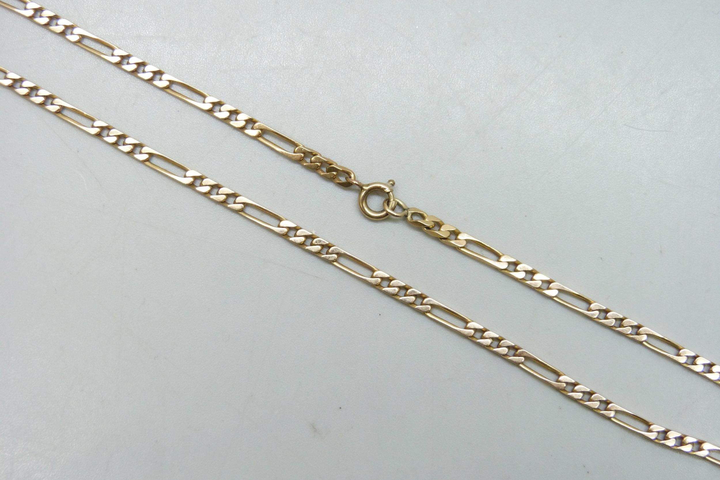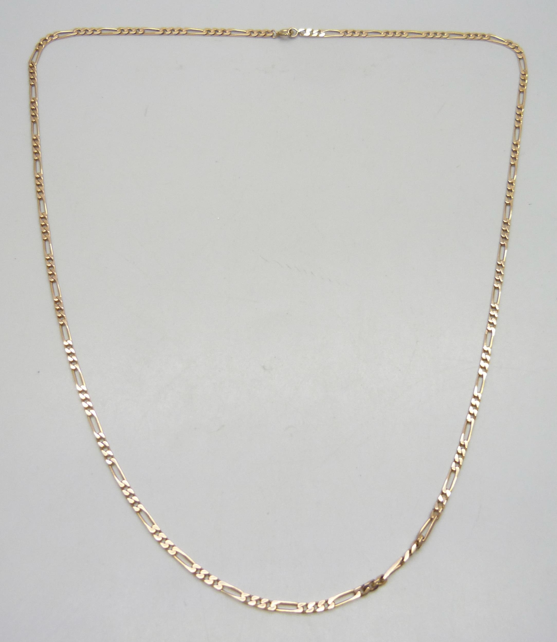 A yellow metal figaro link necklace chain, 17.2g, 65cm