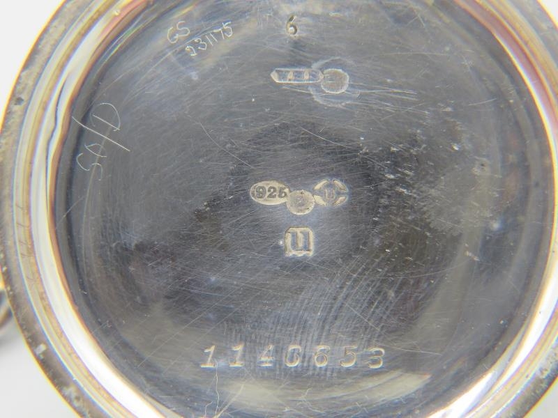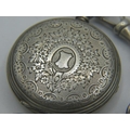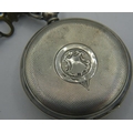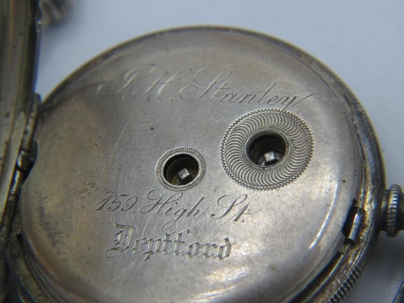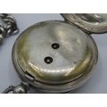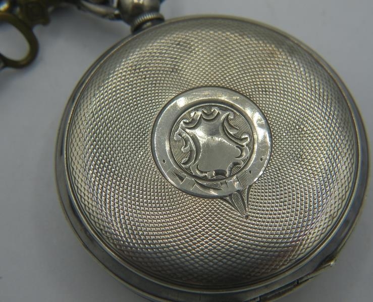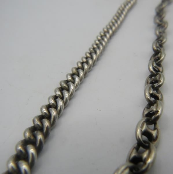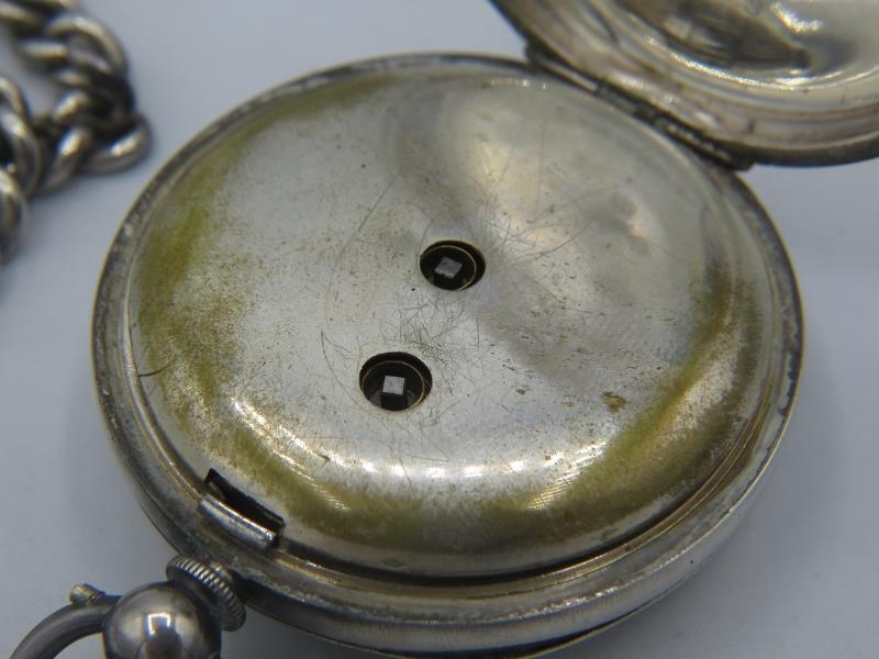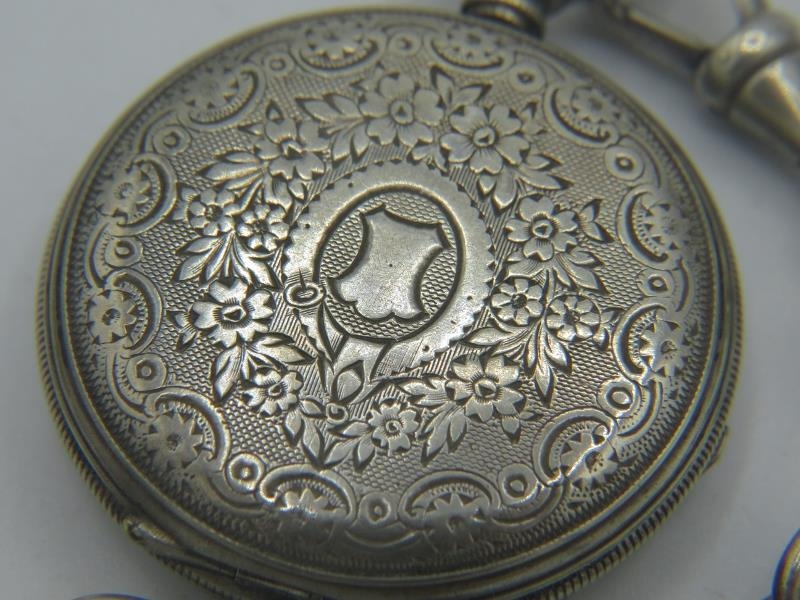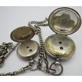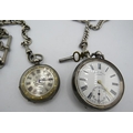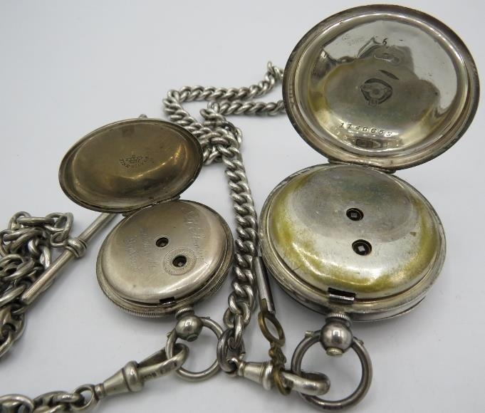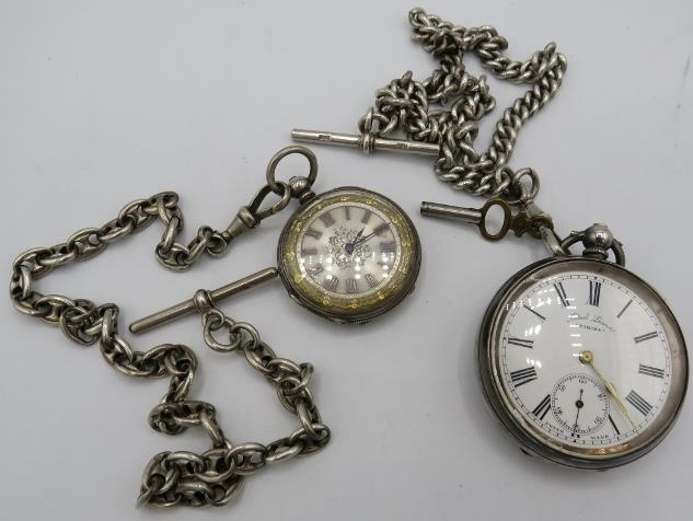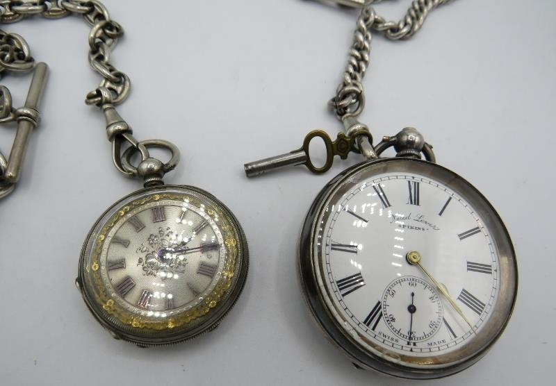 A Spikins Noted Lever silver pocket watch on fully hallmarked silver Albert chain and a small silver fob watch on a fully hallmarked silver ornate link Albert chain. Gross weight approx 200 grams/6.43 troy oz.