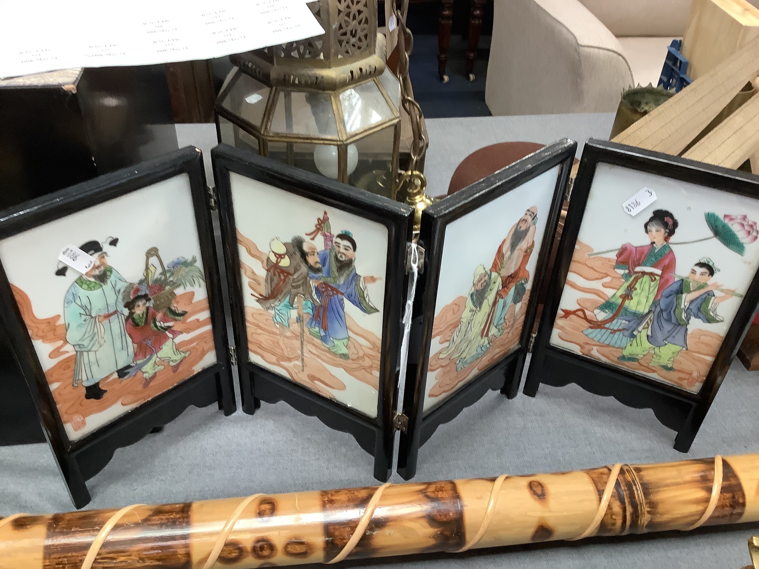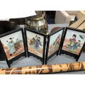 An Oriental four fold tiled screen with pictorial panels