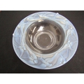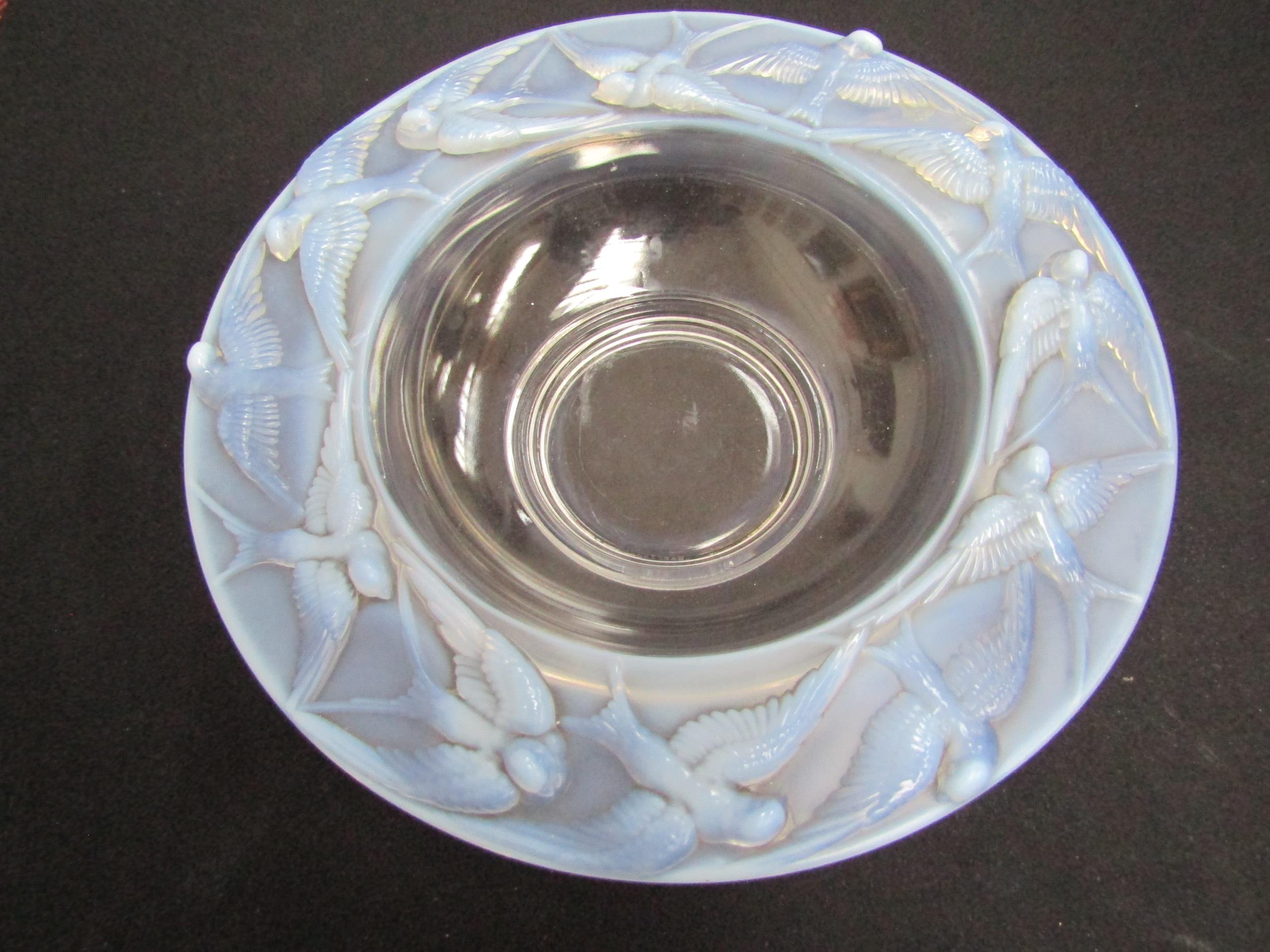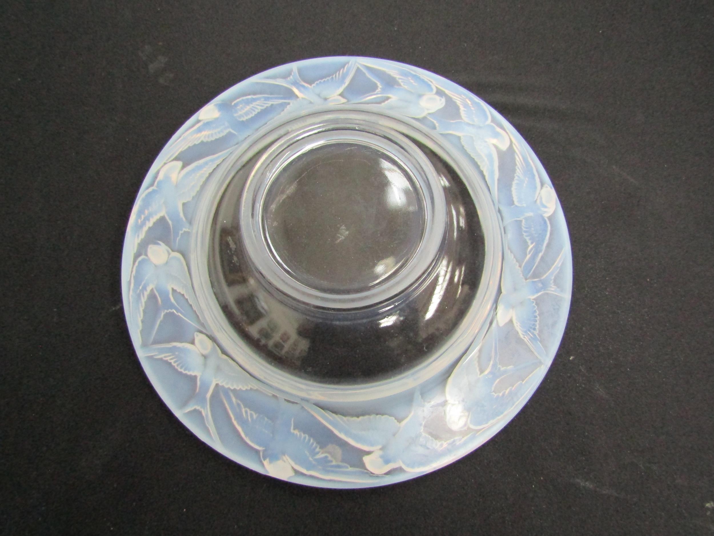 Marked "Barolac" a Czechoslovakian Lalique style bowl, edge decorated with swallows, 33cm diameter, produced at the Inwald Glassworks