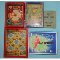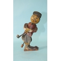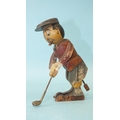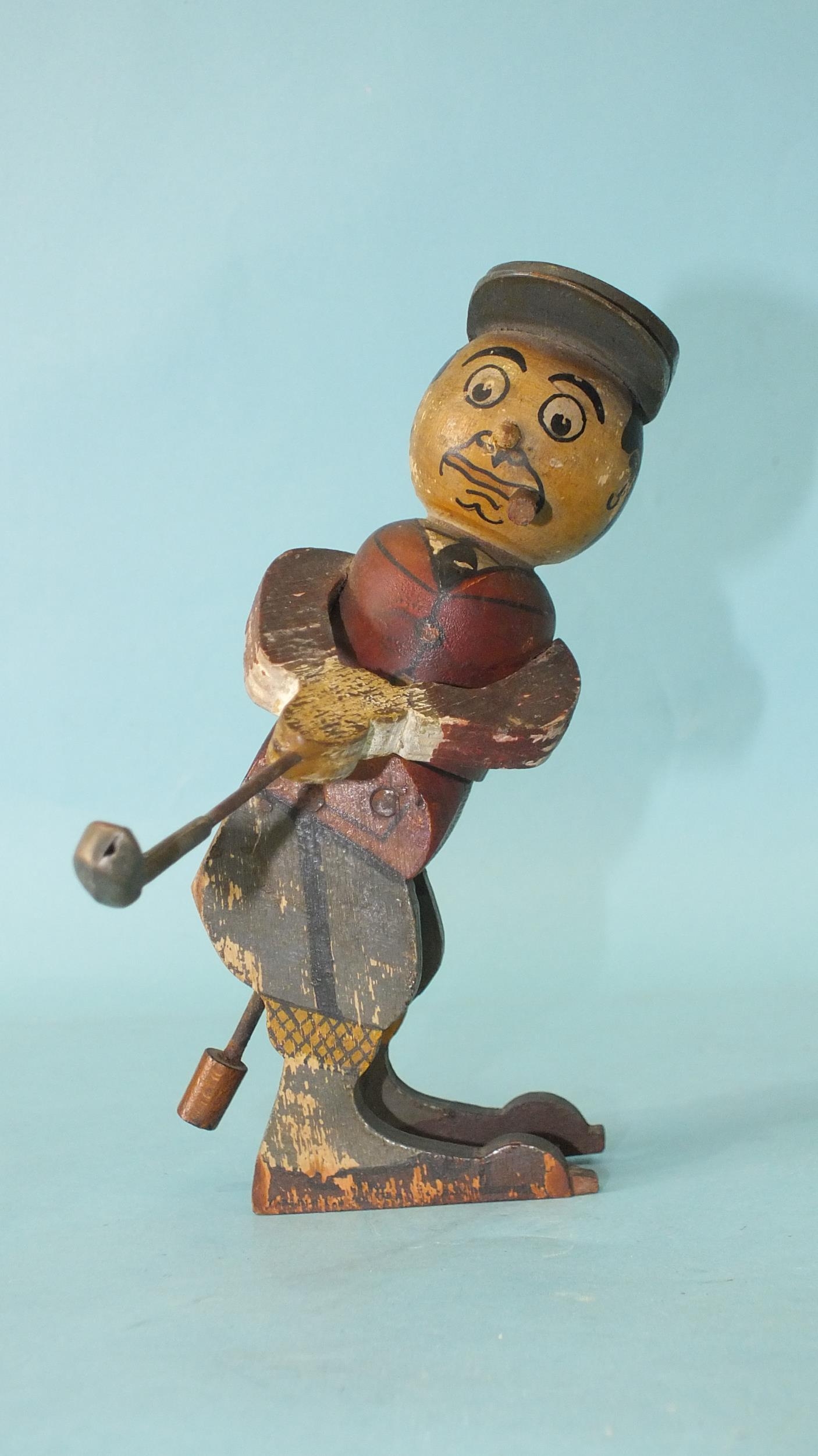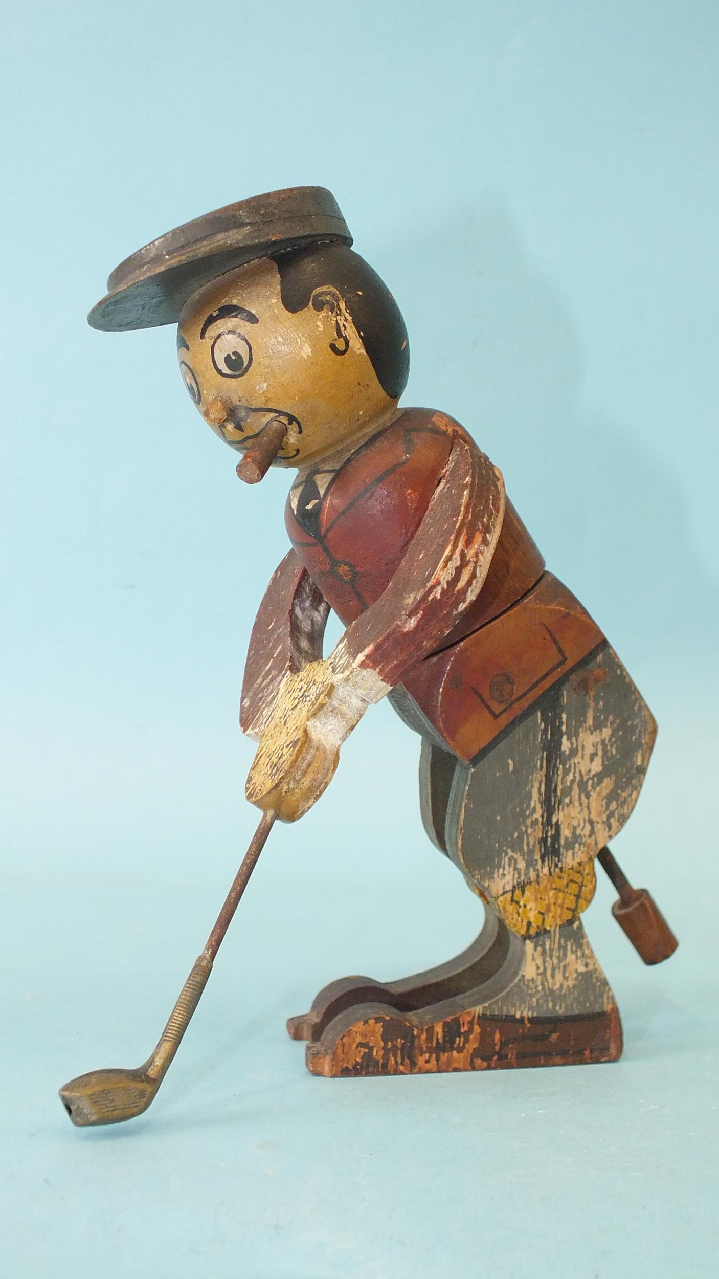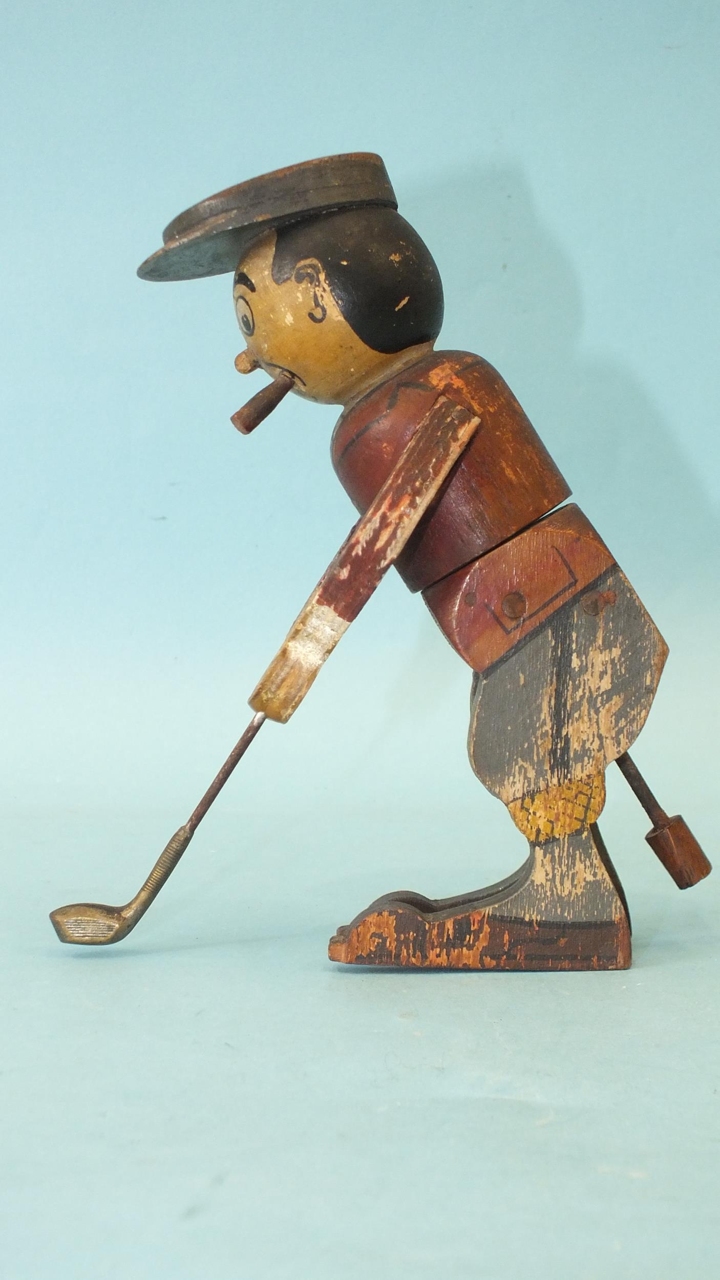 A wooden toy in the form of a golfer teeing off, the figure twisting from the waist, constructed from painted wood, with metal club, 16.5cm high.