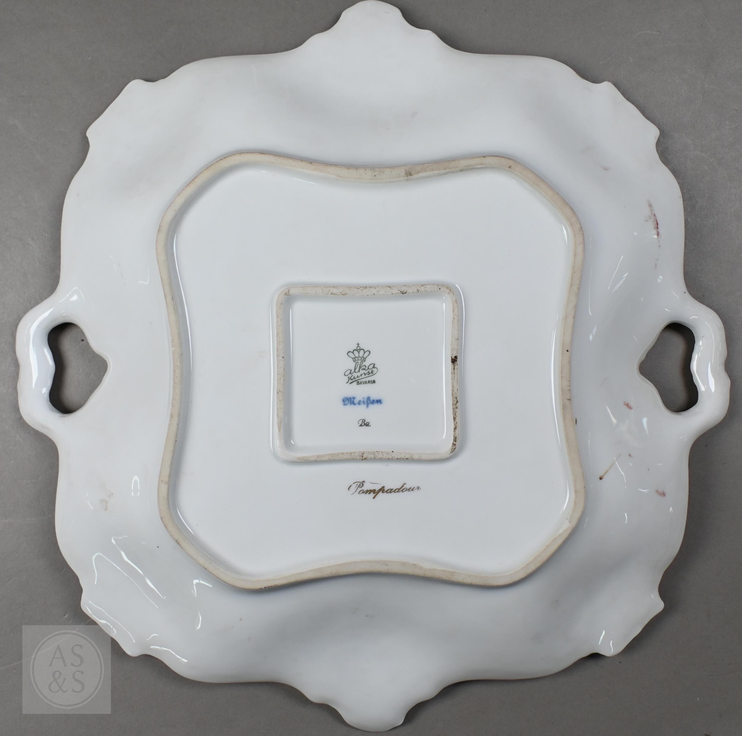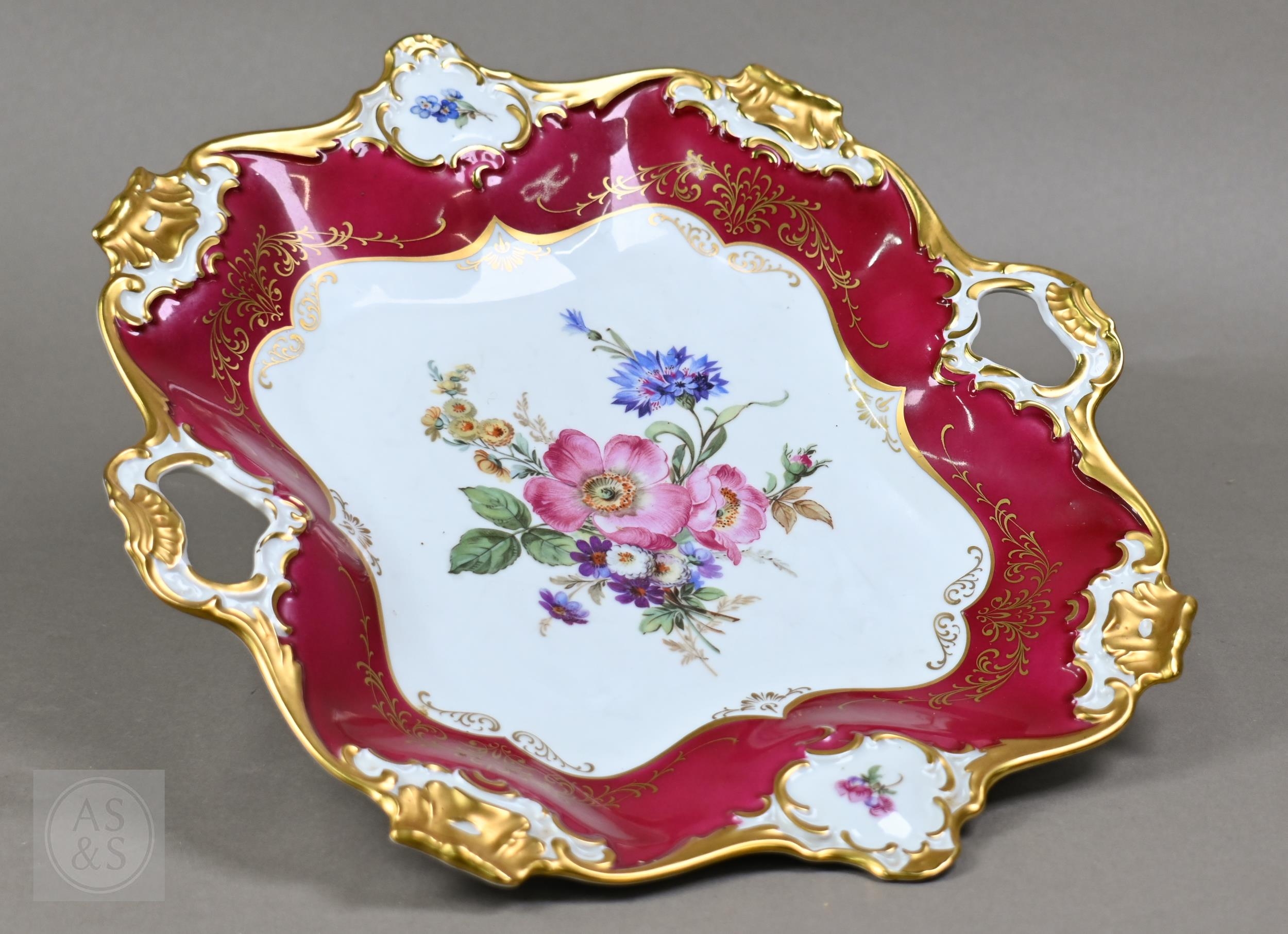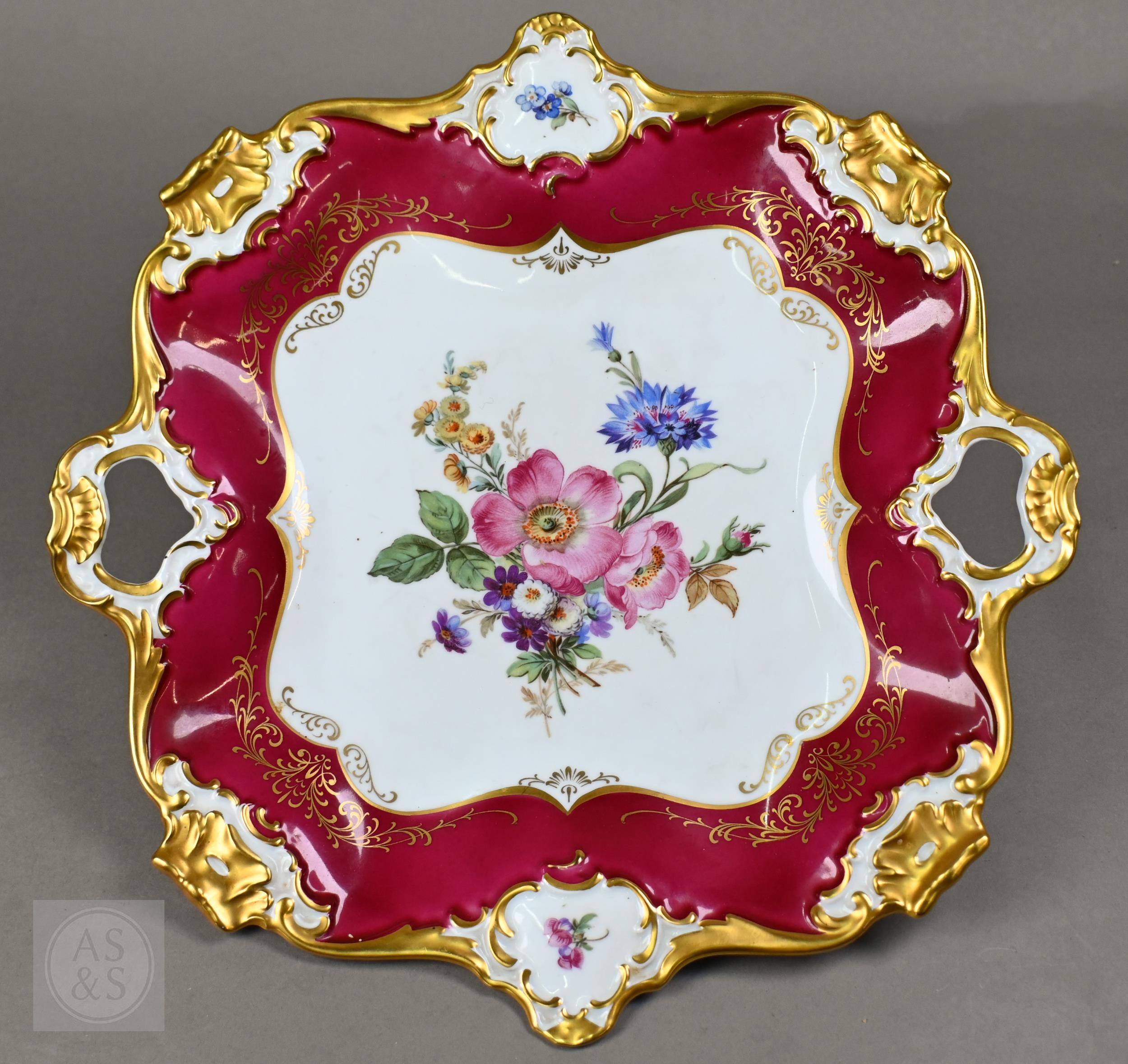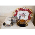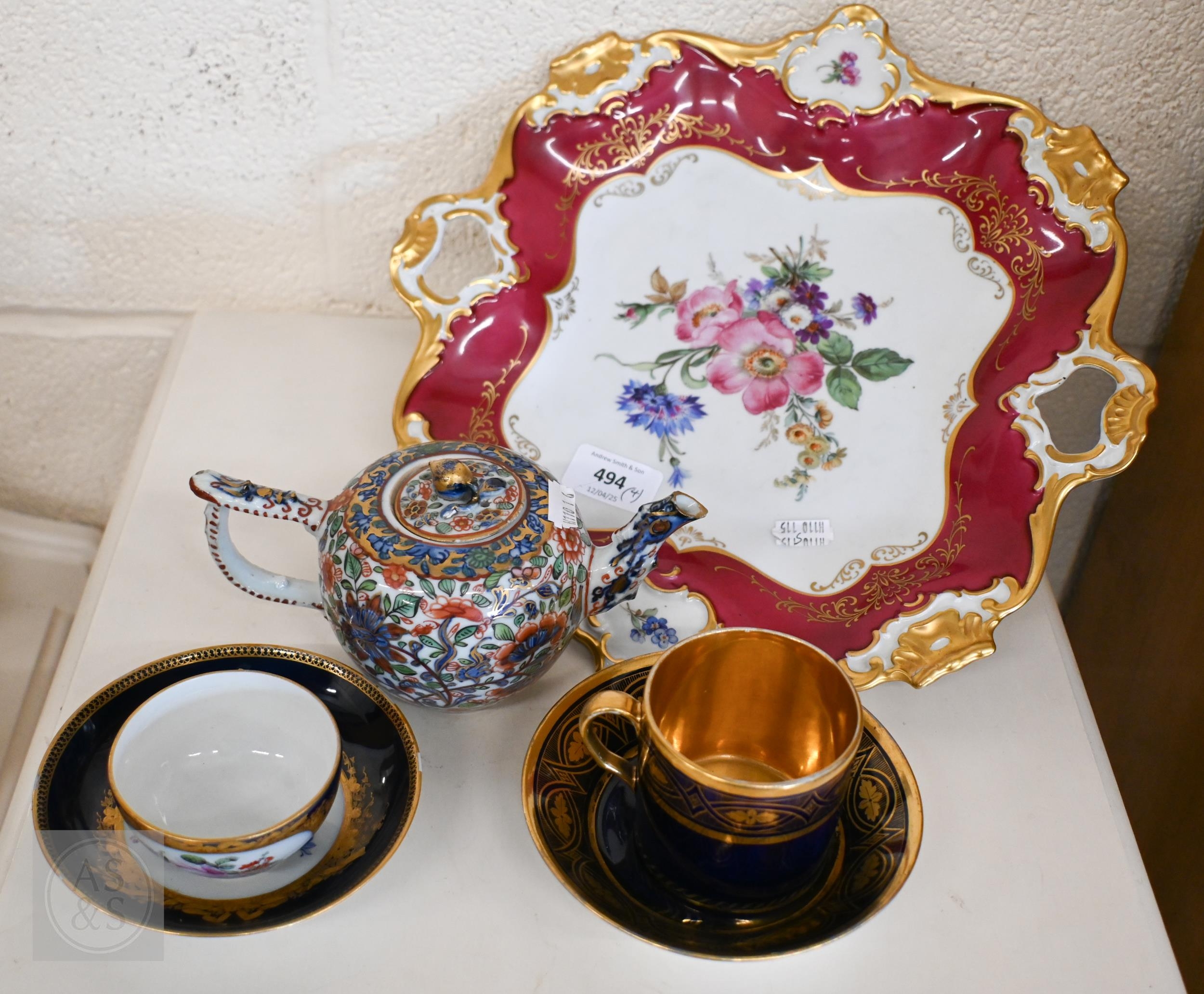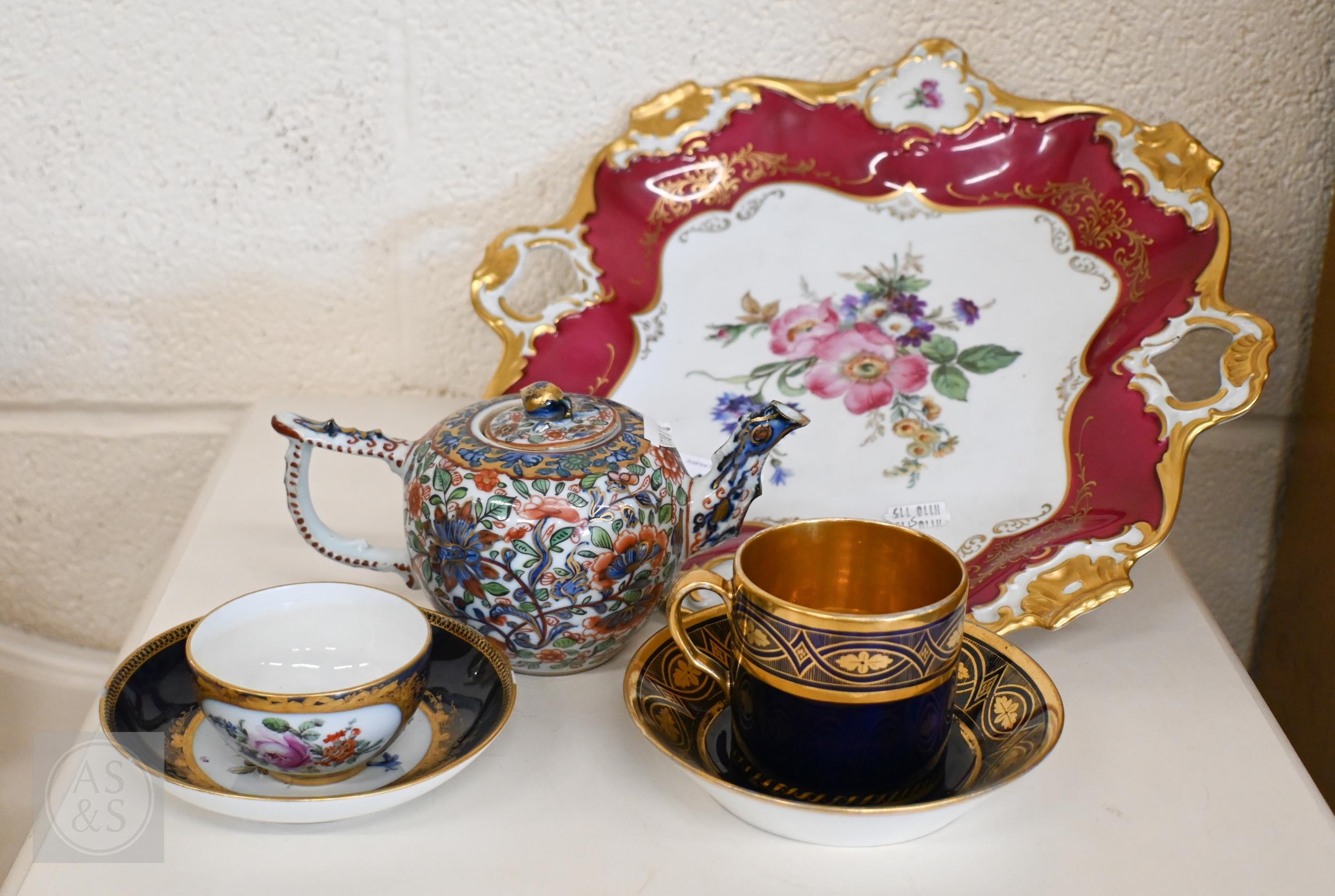 An Alka Kunst 'Meissen Pompadour' shaped square dish, painted with flowers within puce and gilt border, 31 cm wide, to/w a Meissen floral-painted coffee cup and saucer with blue ground (lacks handle), a Sevres (possibly) blue and gilt cup and saucers, and a Samson chinoserie small tea pot with 'clobbered' decoration (4)