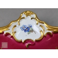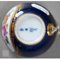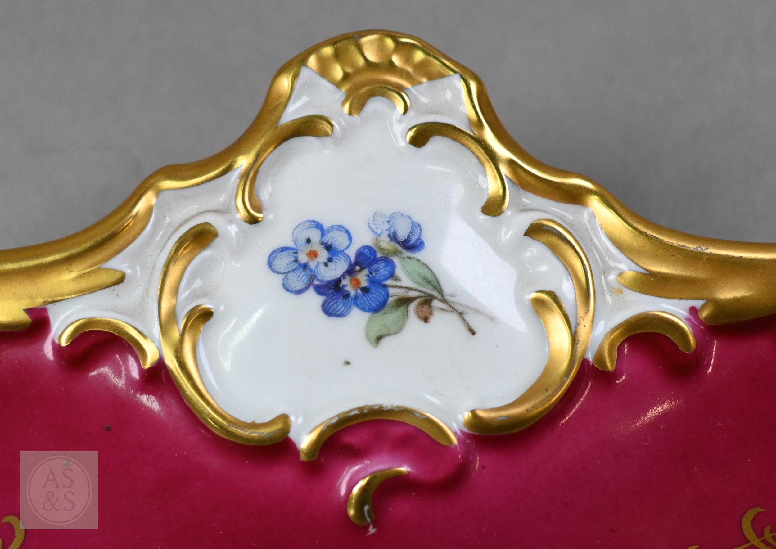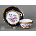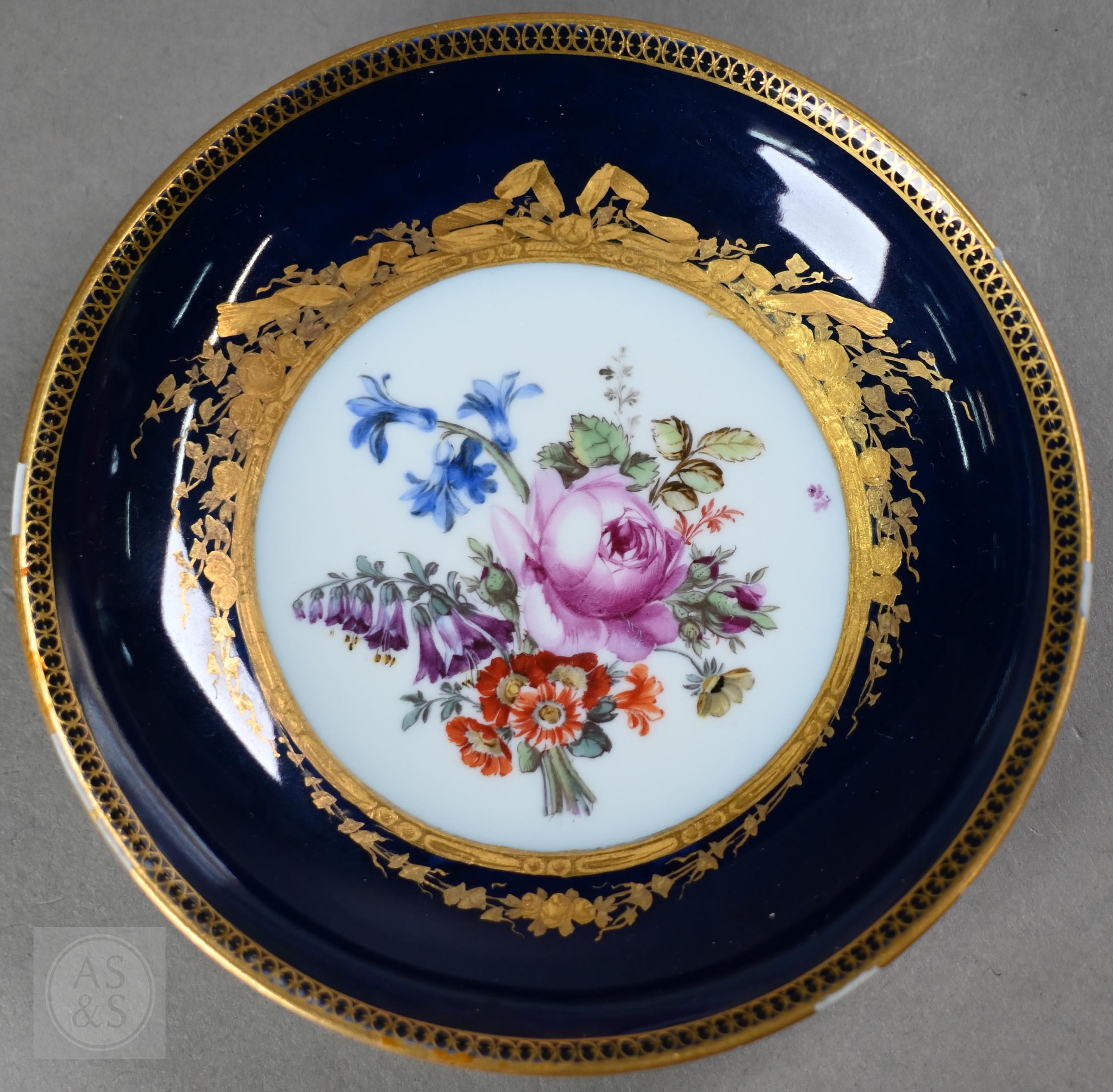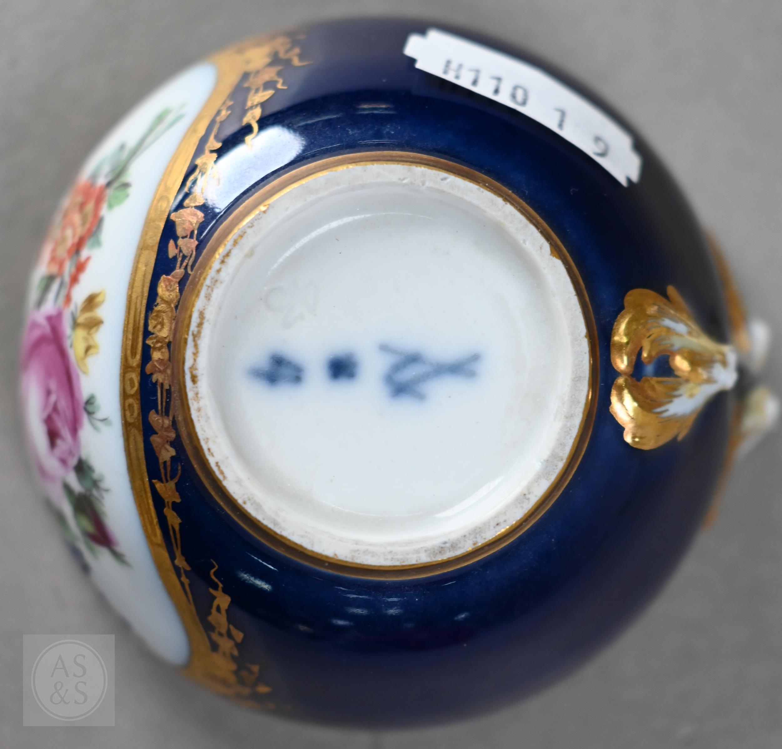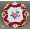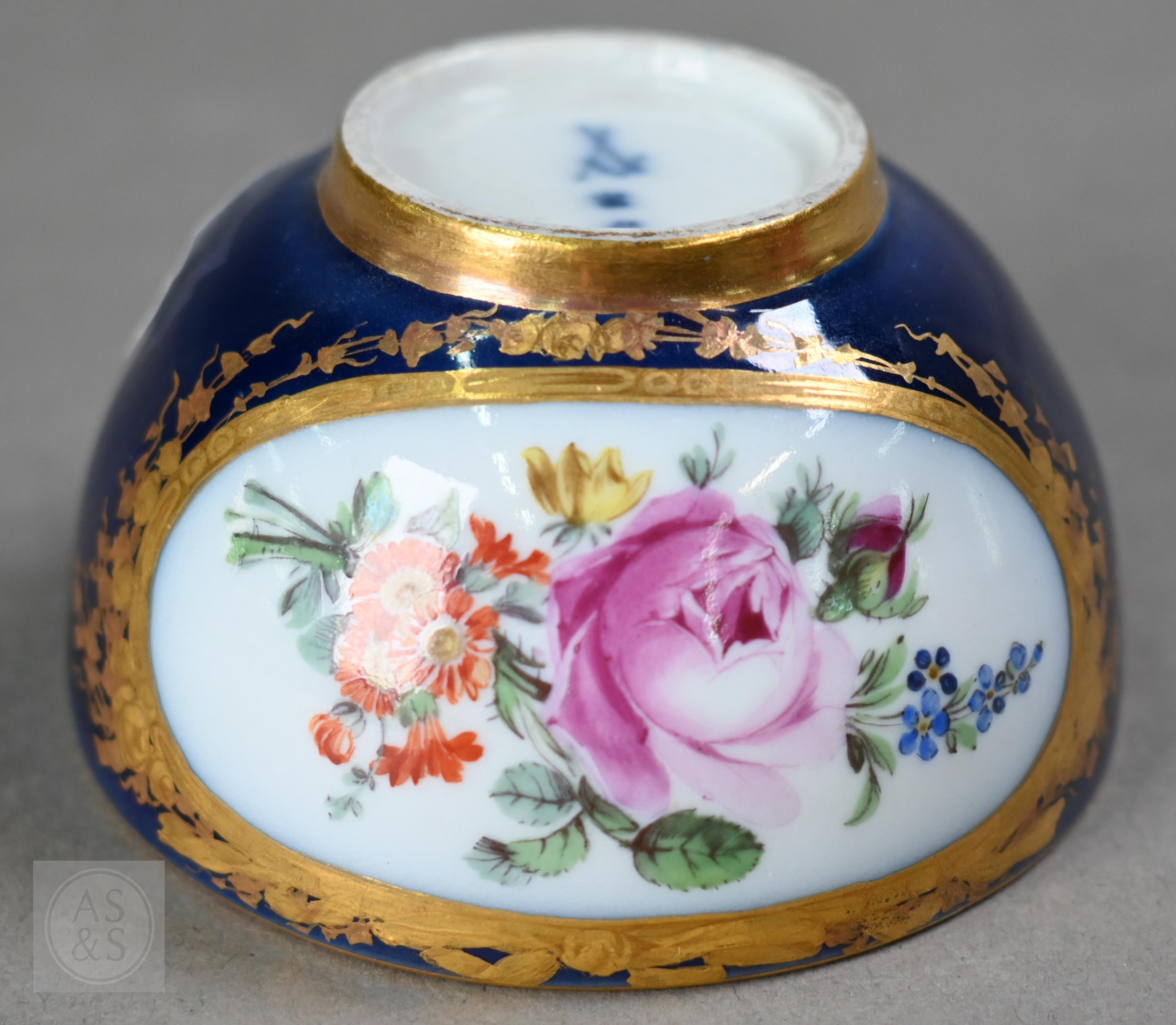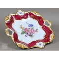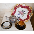 An Alka Kunst 'Meissen Pompadour' shaped square dish, painted with flowers within puce and gilt border, 31 cm wide, to/w a Meissen floral-painted coffee cup and saucer with blue ground (lacks handle), a Sevres (possibly) blue and gilt cup and saucers, and a Samson chinoserie small tea pot with 'clobbered' decoration (4)