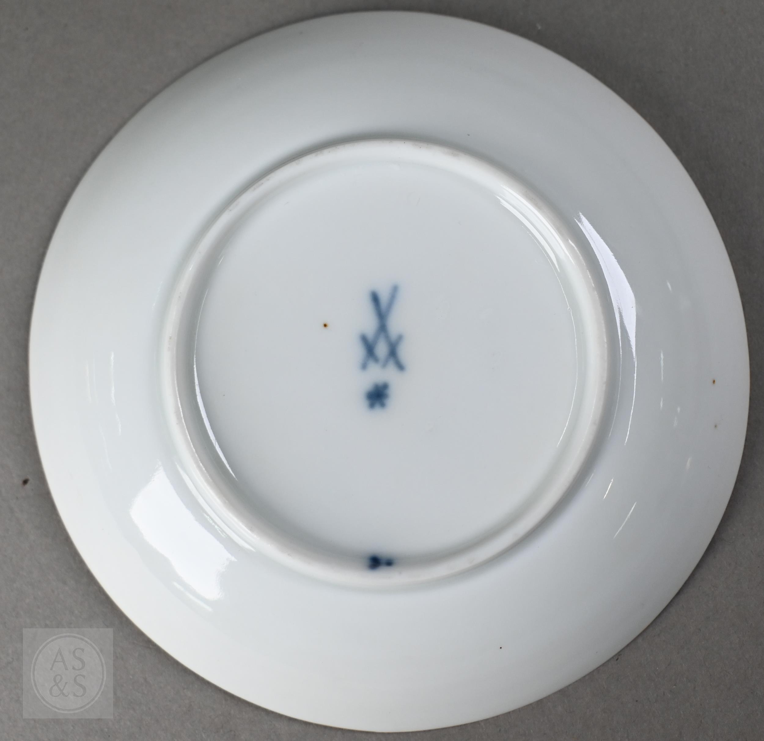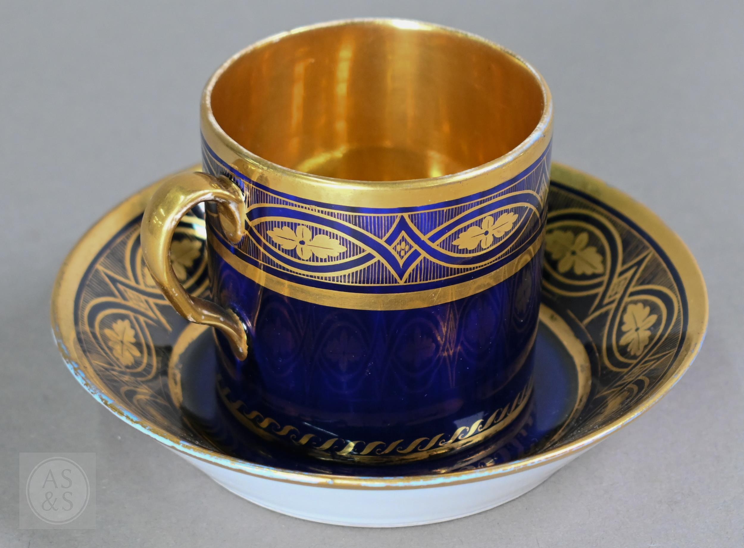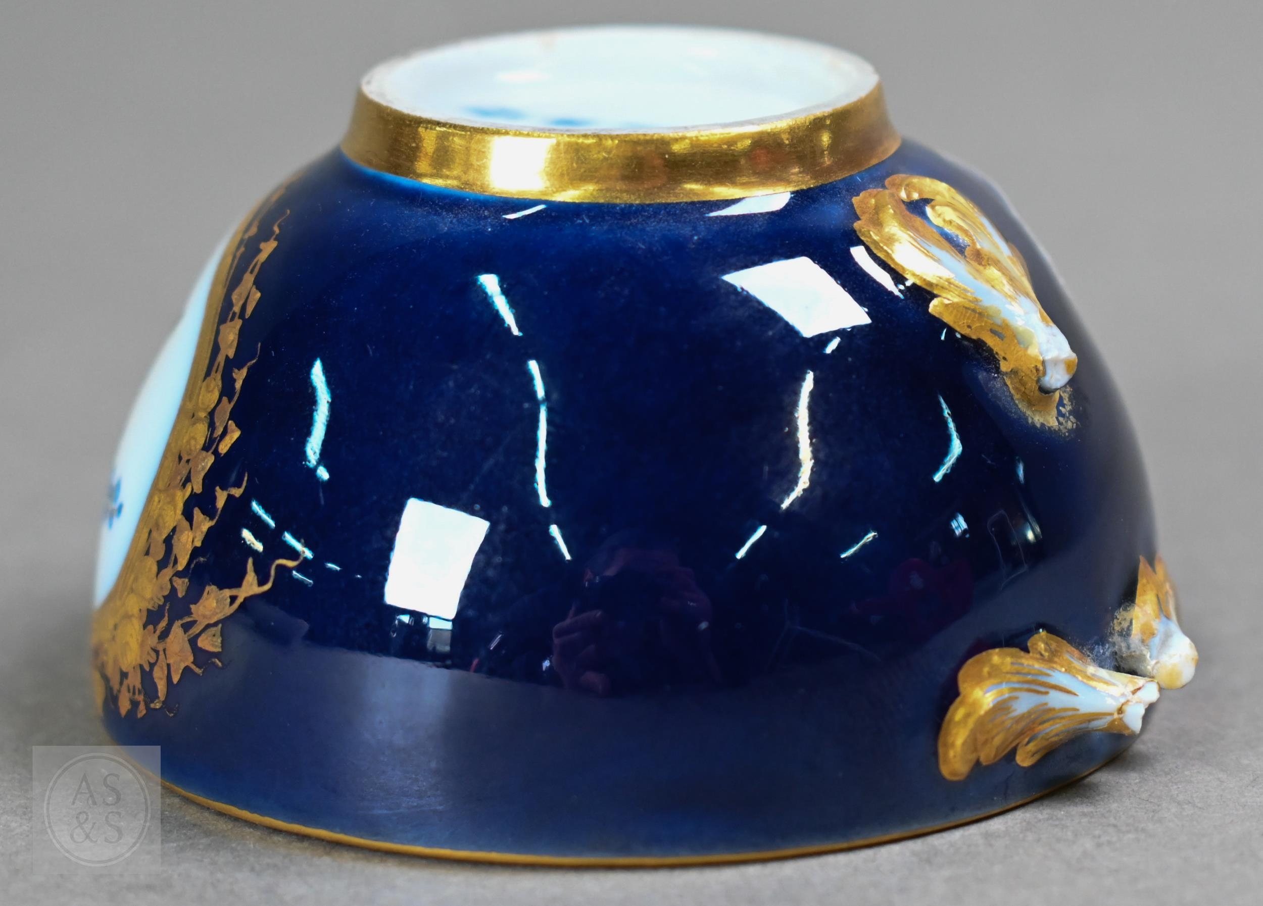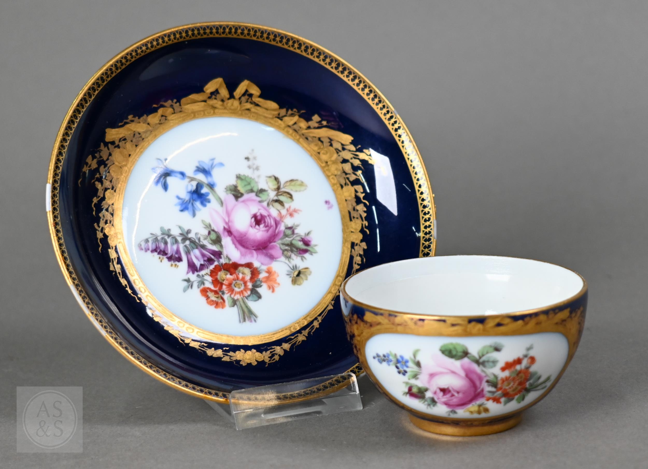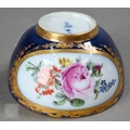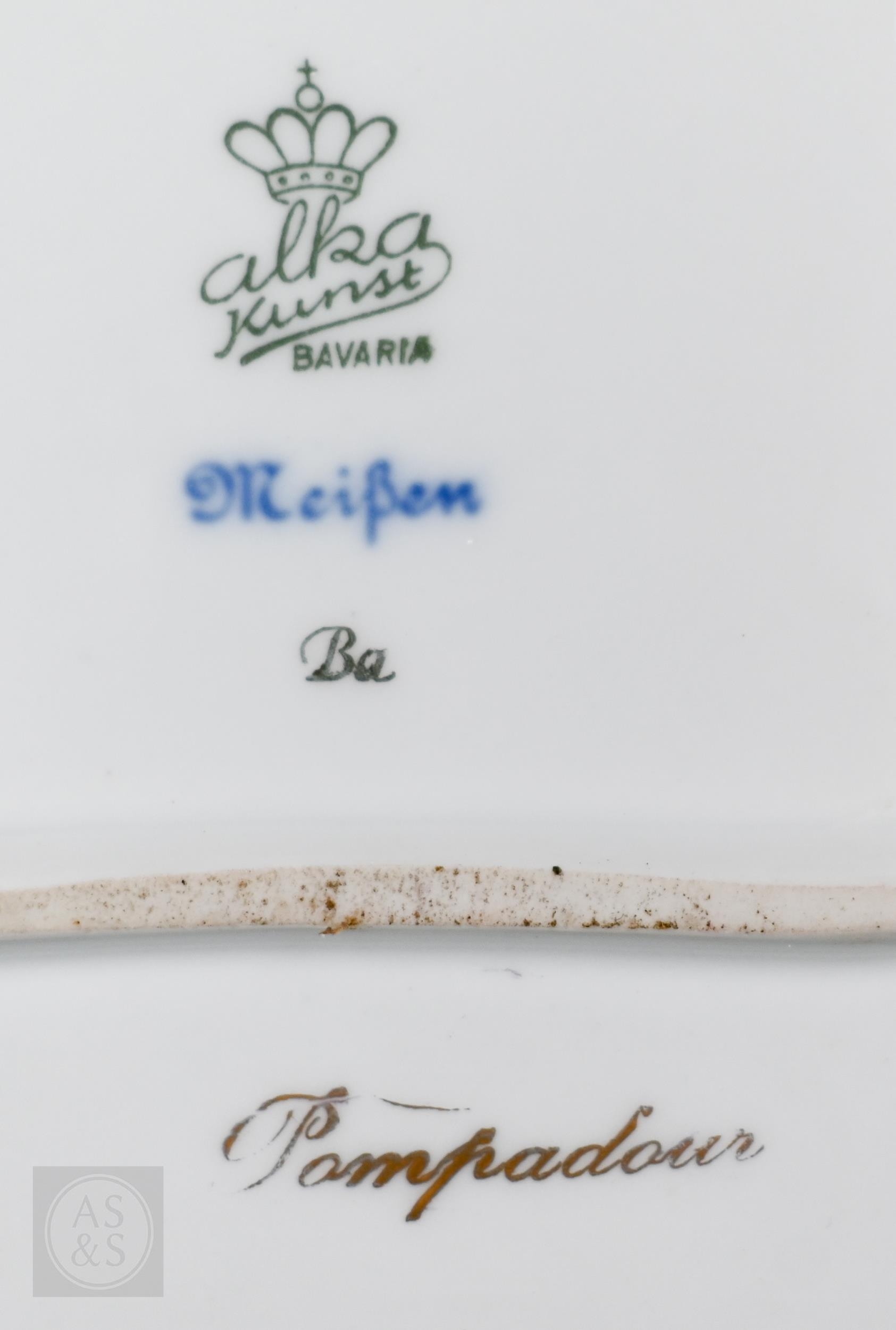 An Alka Kunst 'Meissen Pompadour' shaped square dish, painted with flowers within puce and gilt border, 31 cm wide, to/w a Meissen floral-painted coffee cup and saucer with blue ground (lacks handle), a Sevres (possibly) blue and gilt cup and saucers, and a Samson chinoserie small tea pot with 'clobbered' decoration (4)