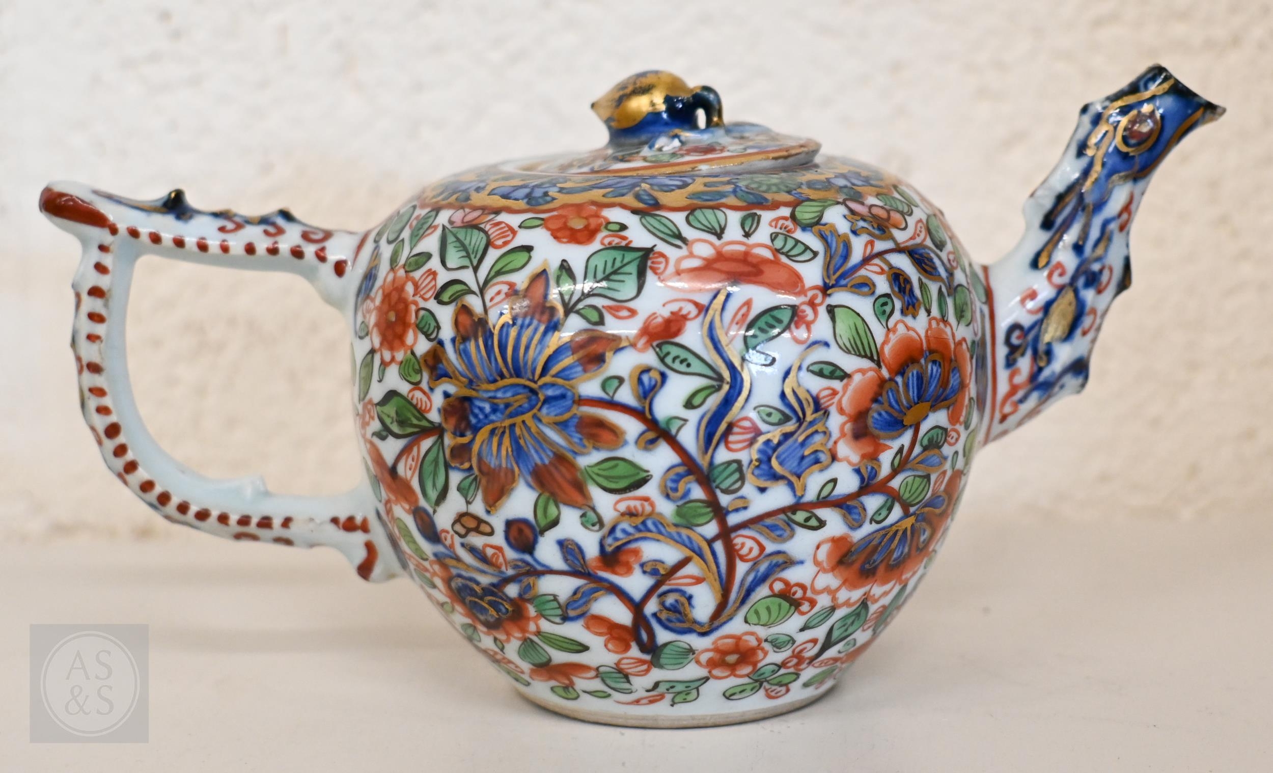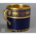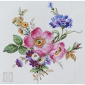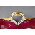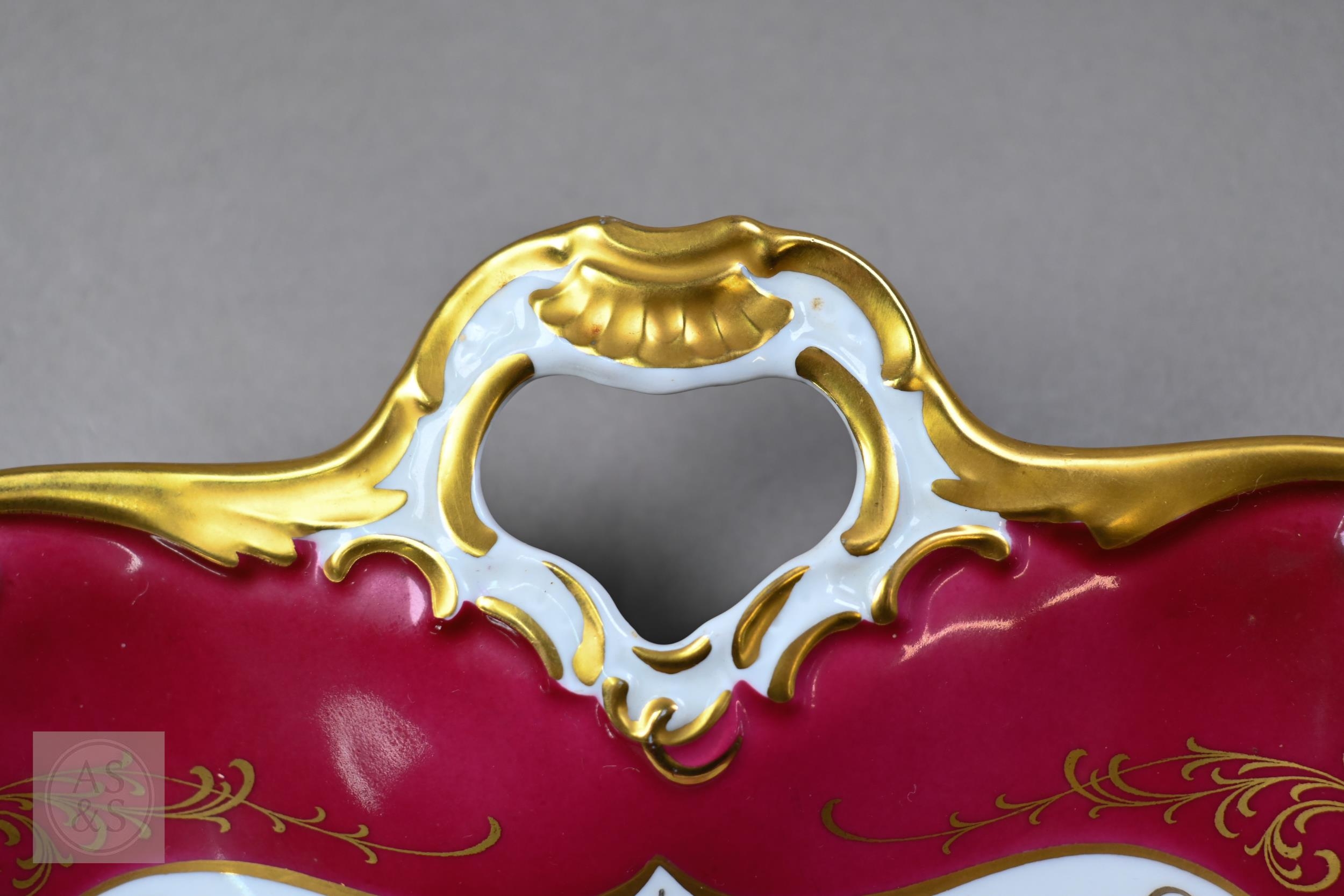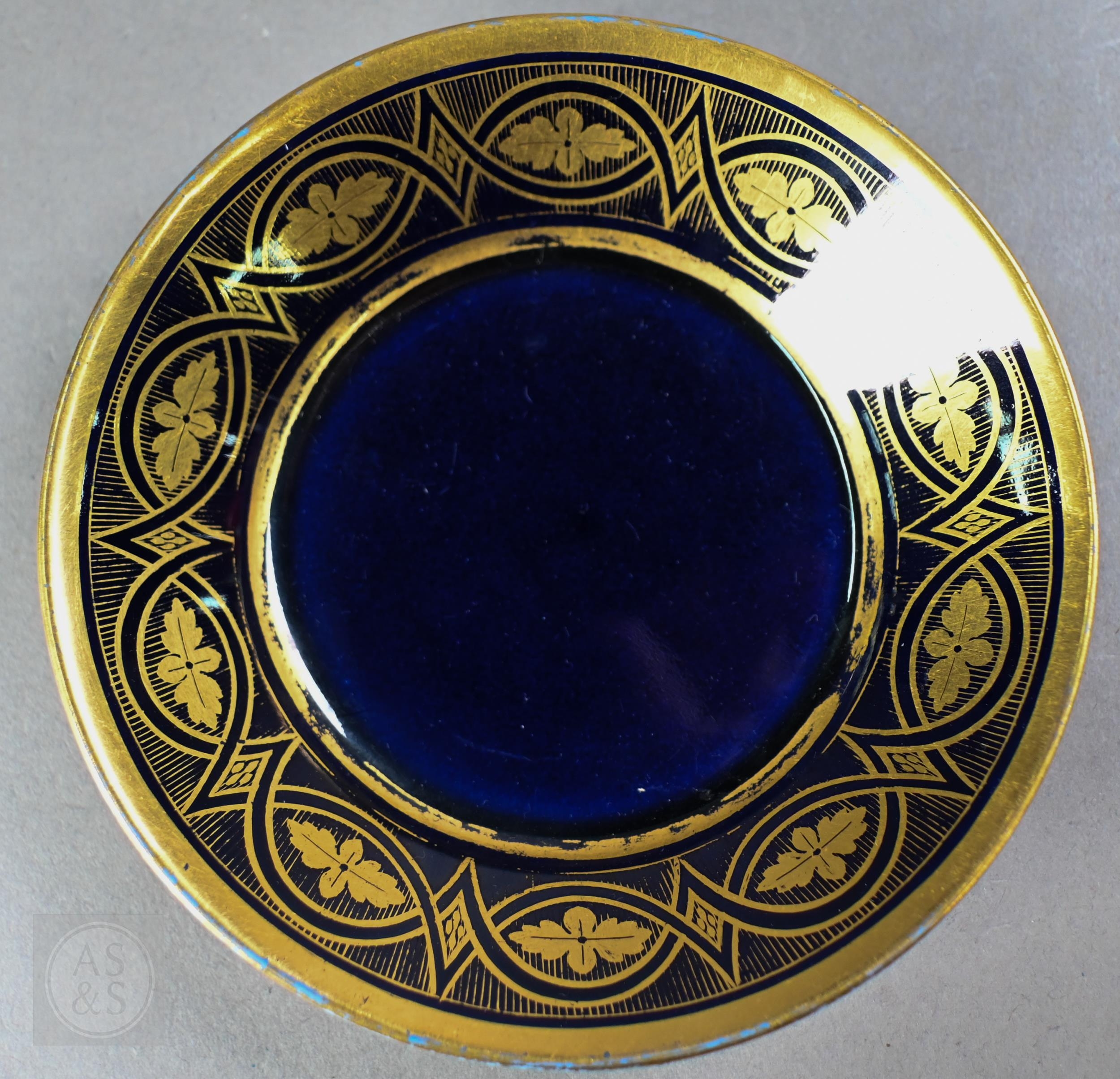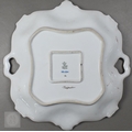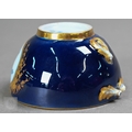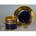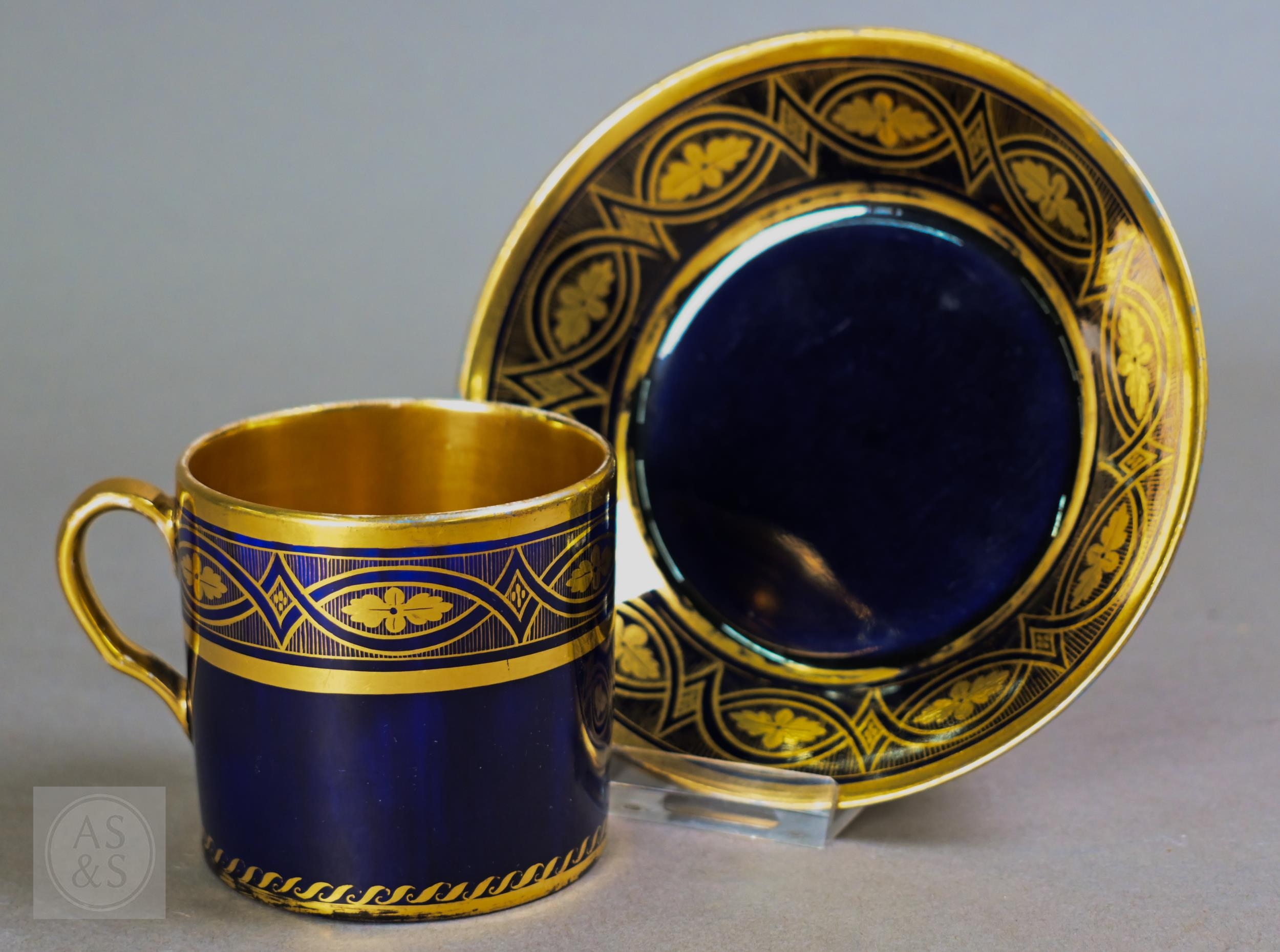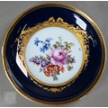 An Alka Kunst 'Meissen Pompadour' shaped square dish, painted with flowers within puce and gilt border, 31 cm wide, to/w a Meissen floral-painted coffee cup and saucer with blue ground (lacks handle), a Sevres (possibly) blue and gilt cup and saucers, and a Samson chinoserie small tea pot with 'clobbered' decoration (4)