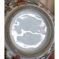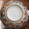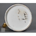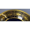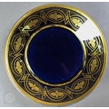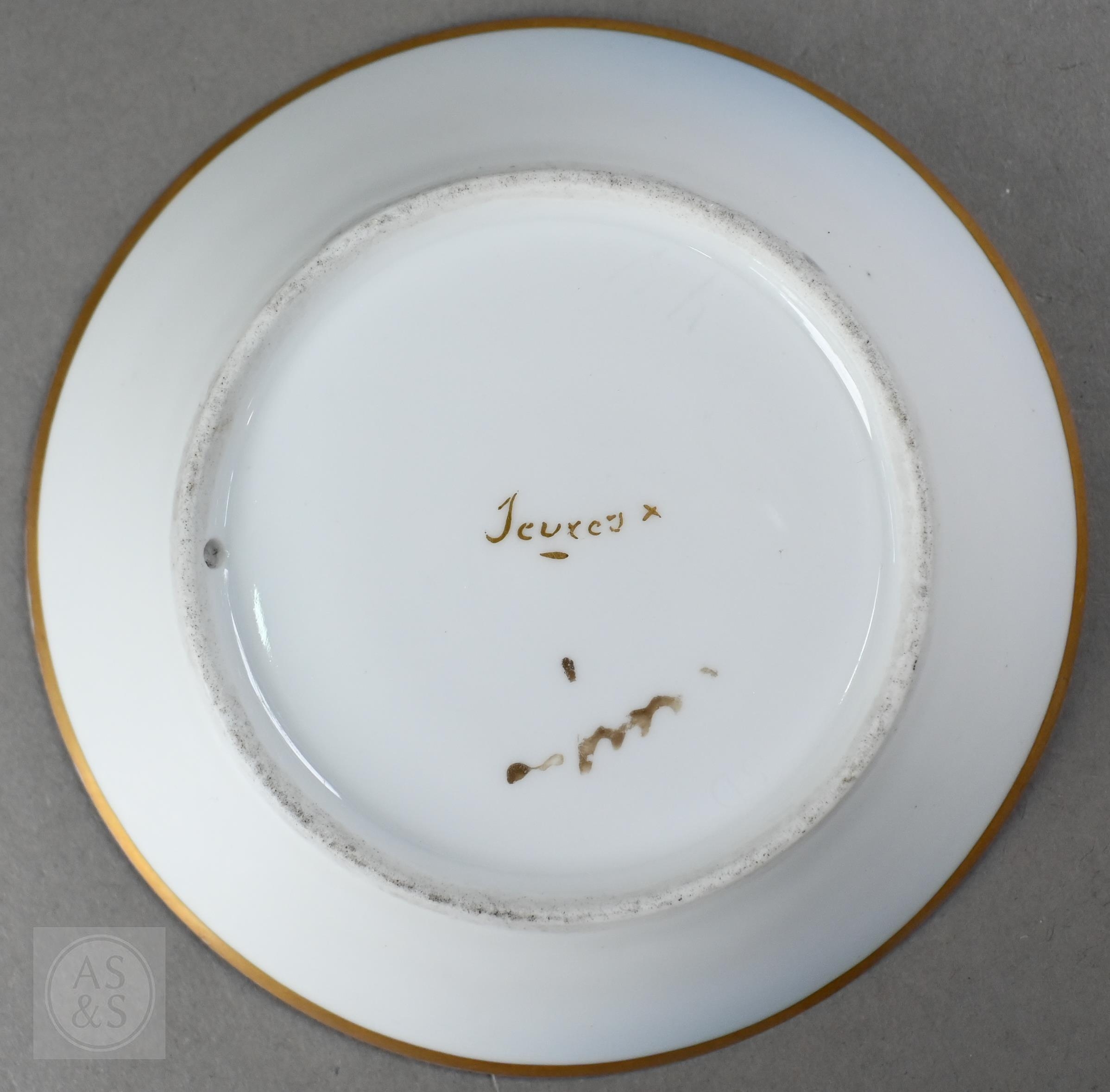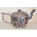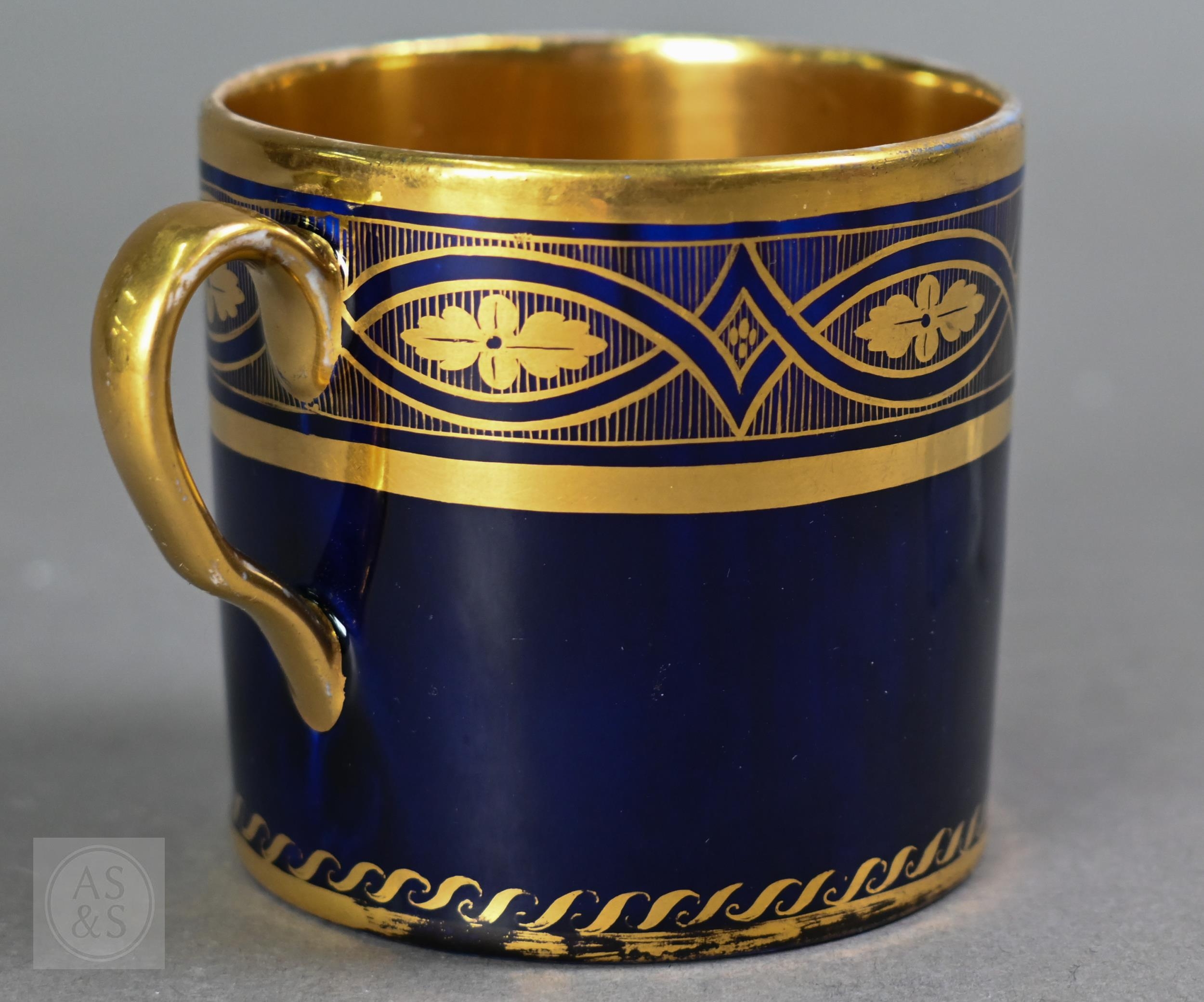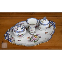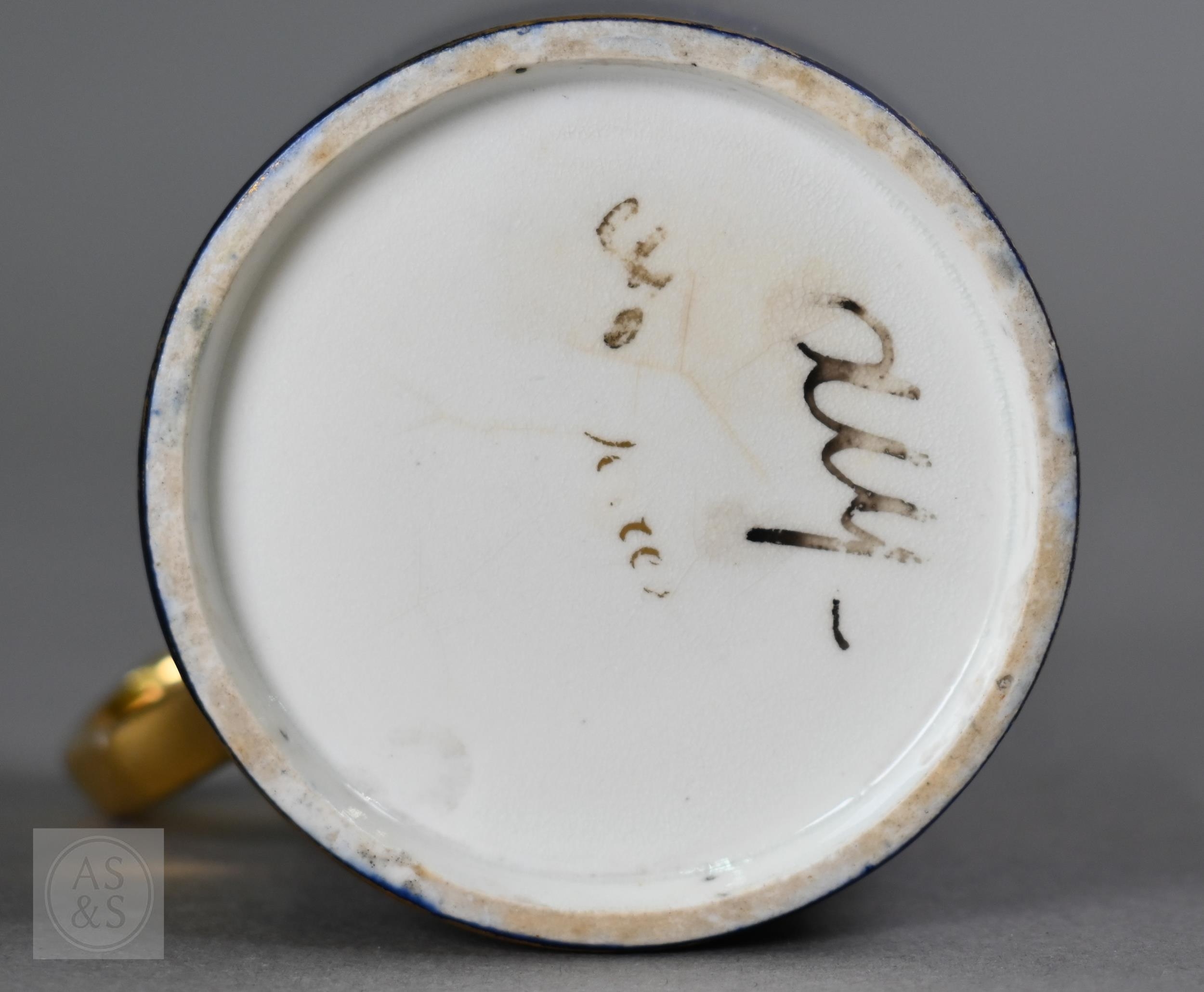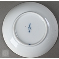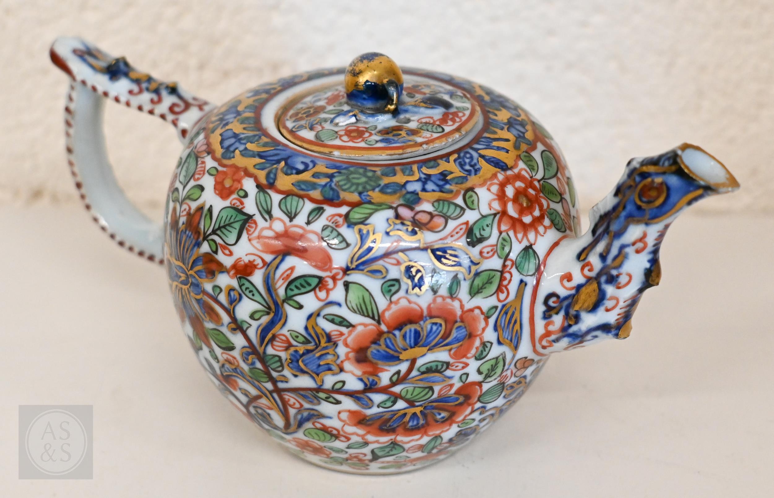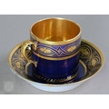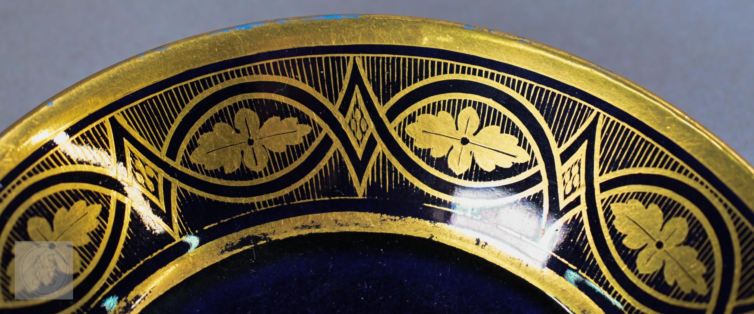 An Alka Kunst 'Meissen Pompadour' shaped square dish, painted with flowers within puce and gilt border, 31 cm wide, to/w a Meissen floral-painted coffee cup and saucer with blue ground (lacks handle), a Sevres (possibly) blue and gilt cup and saucers, and a Samson chinoserie small tea pot with 'clobbered' decoration (4)