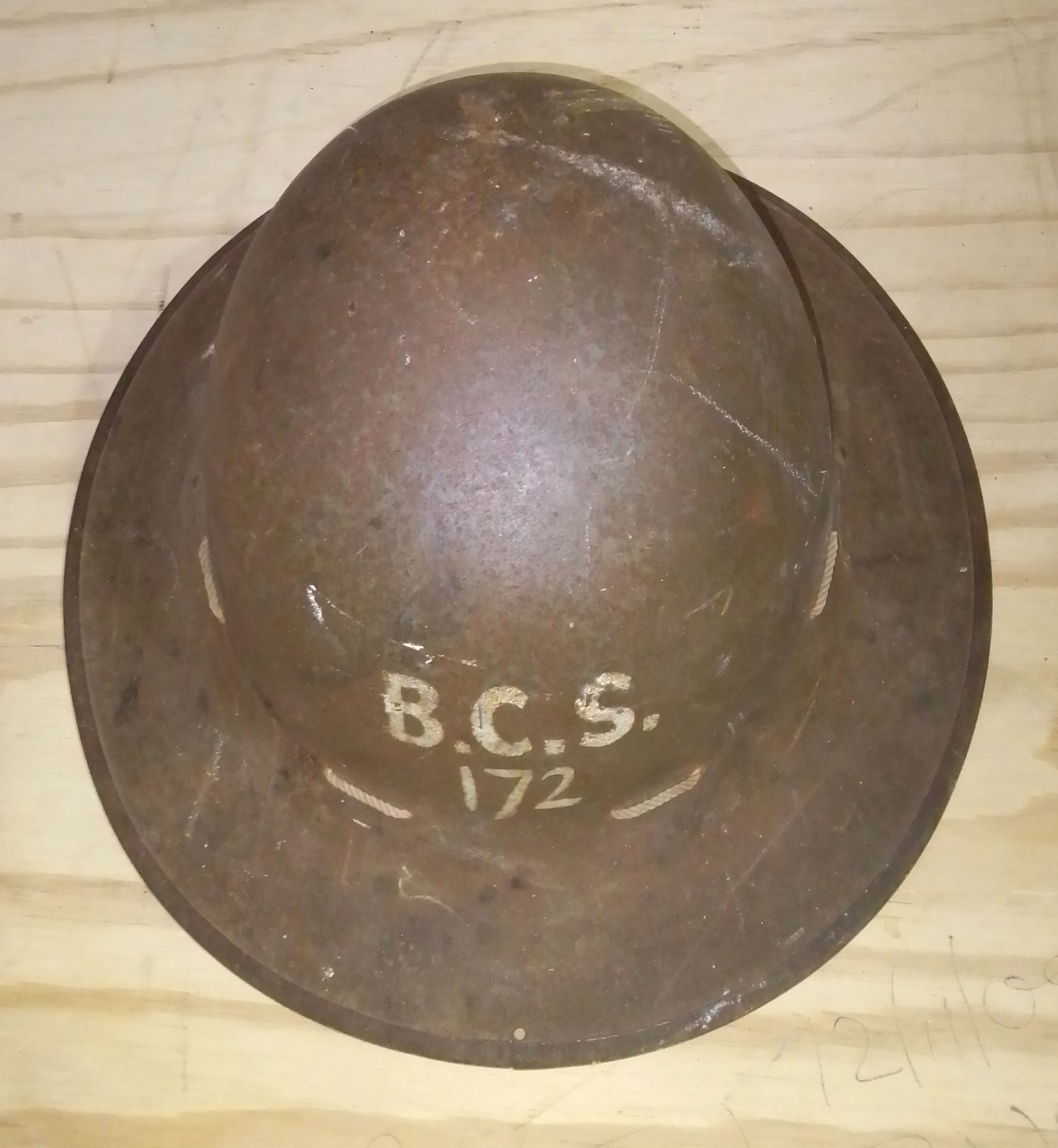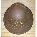 A WWII civilian helmet, painted 'B.S.C. 172' to front, the leather lining stamped 'JRS 1942'.