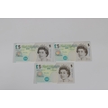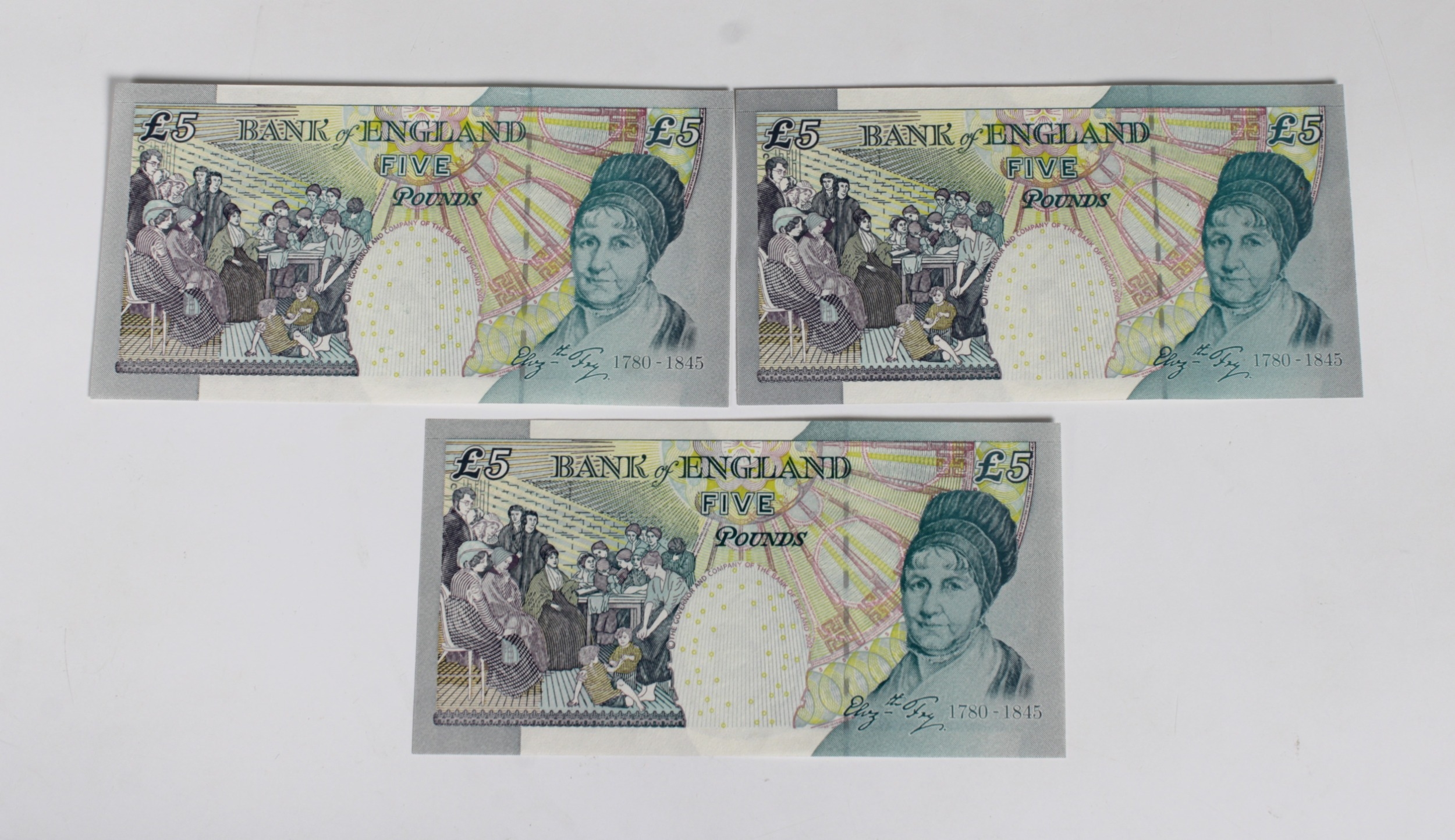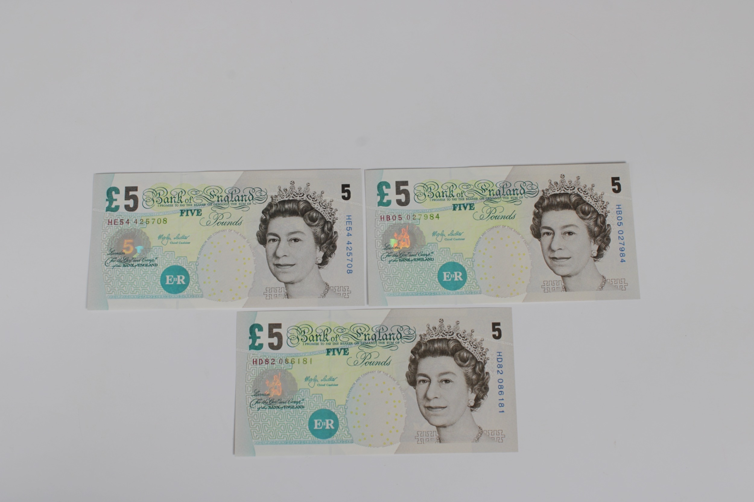 British Banknotes - Bank of England Five Pounds (3) c.2002, Signatory Merlyn Lowther, serial numbers HB05 027984, HD82 2086181, HE54 425708, extra fine to about uncirculated. (3)