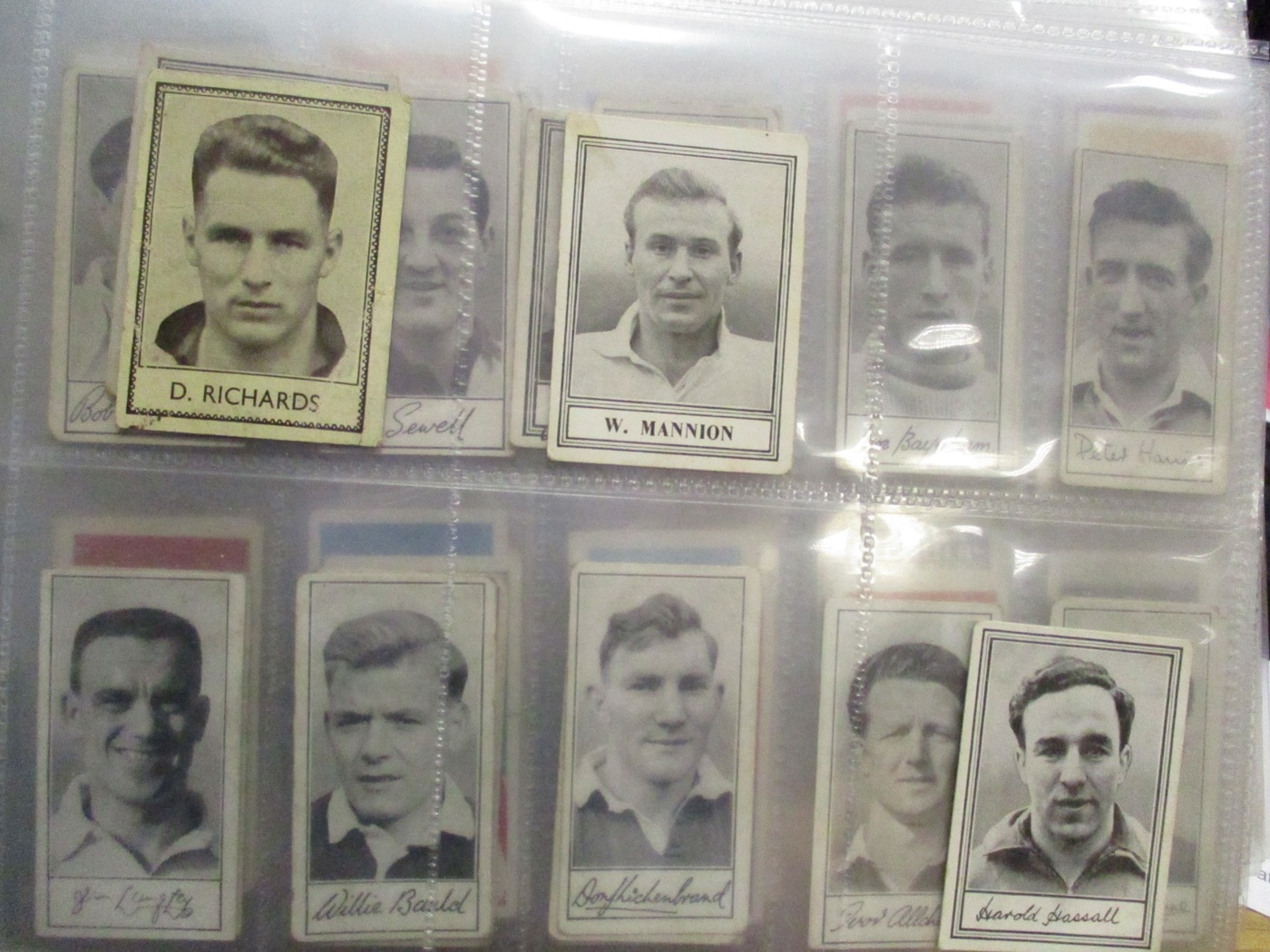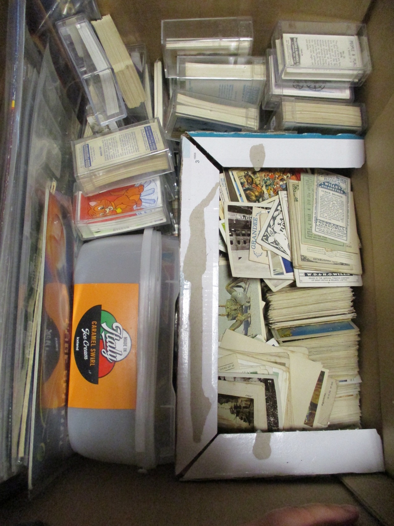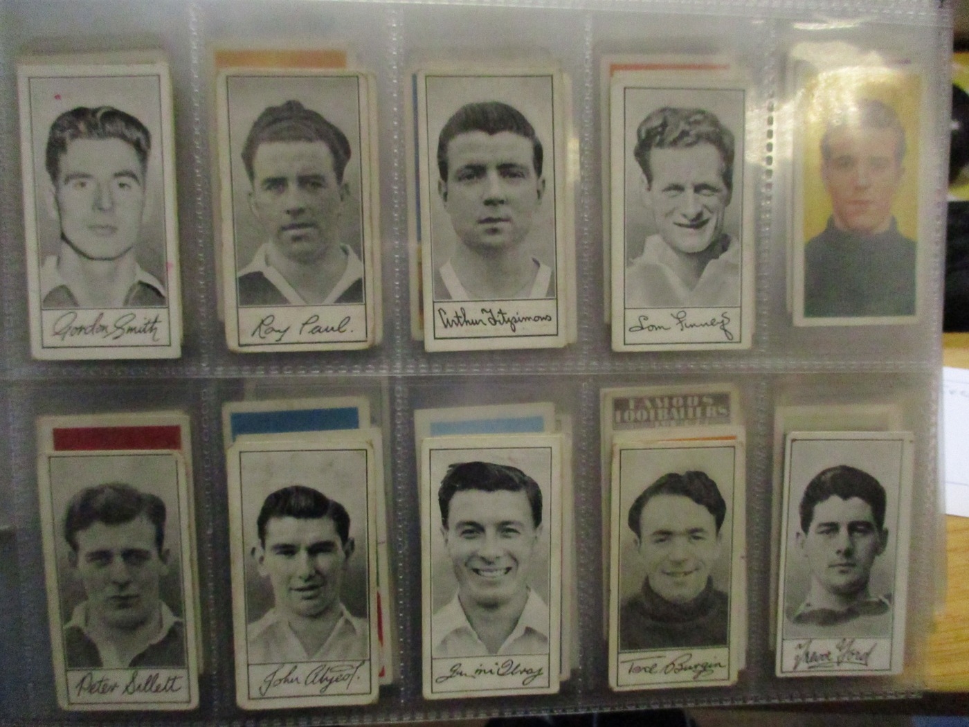 Collection with mostly trade cards with some cigarette card ranges, including Barratt Famous Footballers mixed (40), Test Cricketers (24), Topps Famous Footballers (8), Football Stars (19), Footballers (9), Thompson World Cup Footballers (10), Football Stars (11), etc, plus ranges from Amalgamated Press, Boys Friend, Boys Magazine, Topical Times, Typhoo, etc, varying condition. Qty 3,000 approx