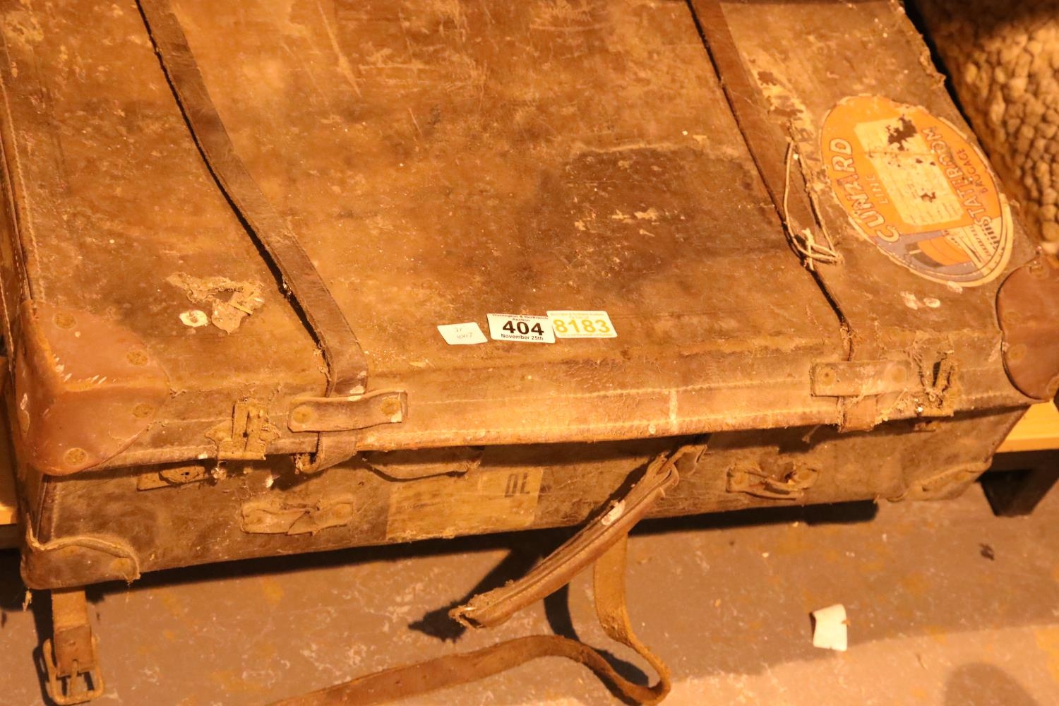 Vintage leather suitcase with Cunard Stateroom baggage label. Not available for in-house P&P