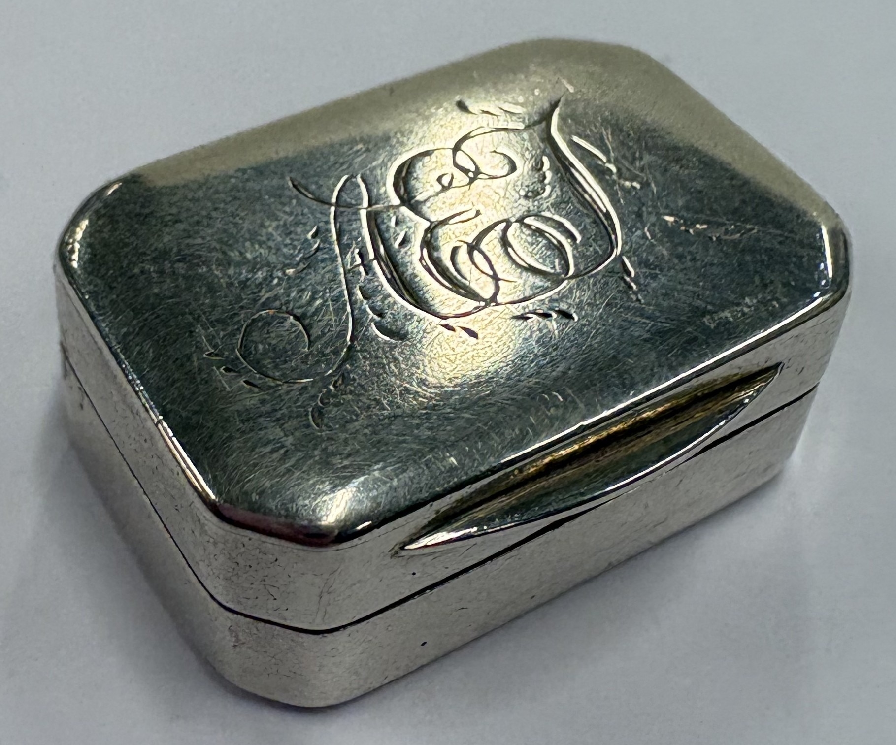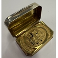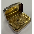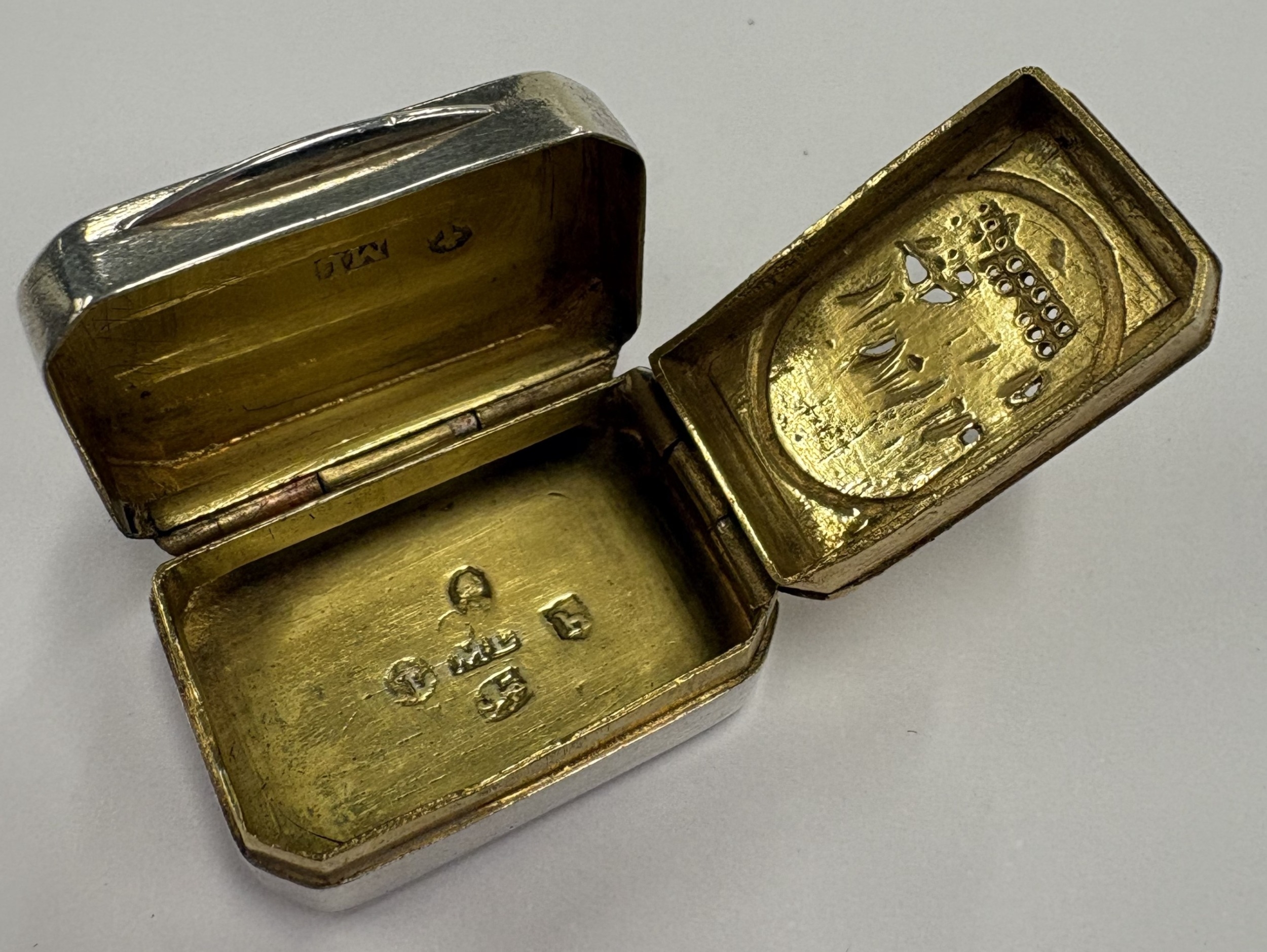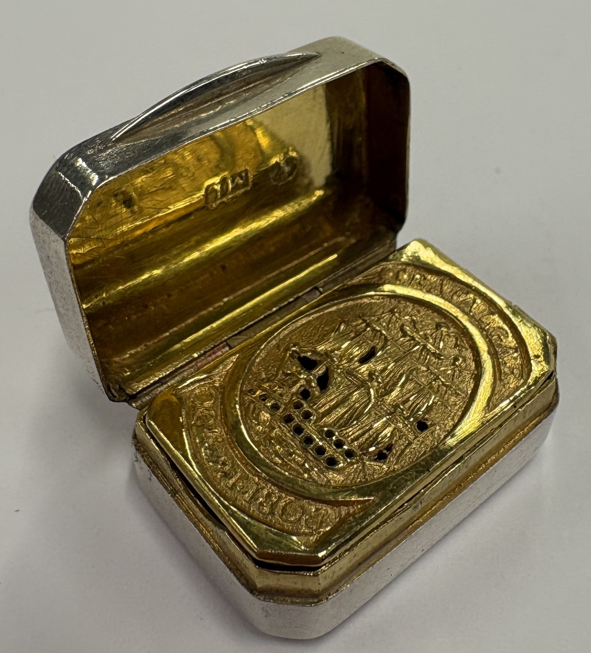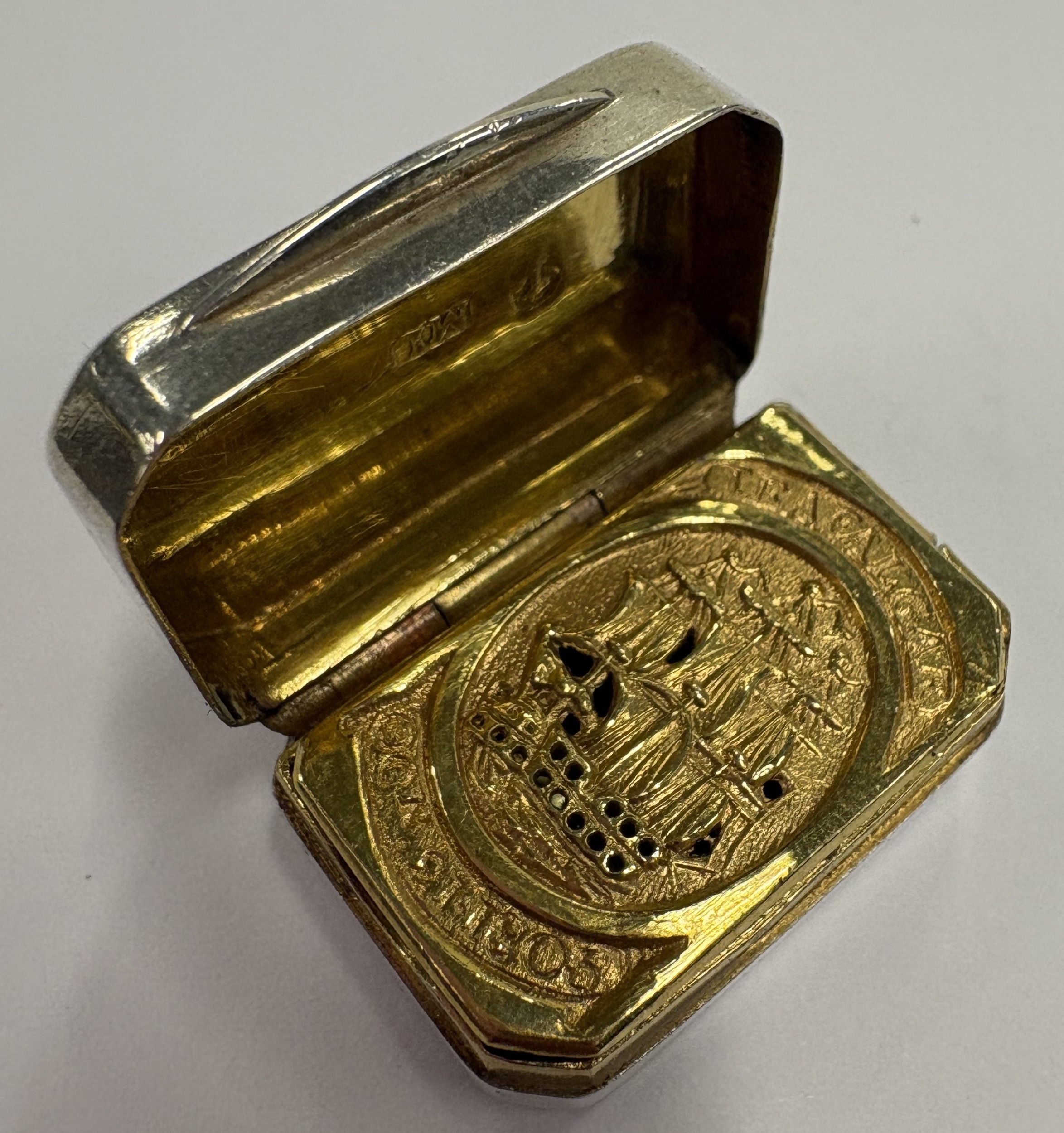 A George III Sterling silver vinaigrette commemorating Nelson's victory at the Battle of Trafalgar, the gilt grille with engraved and pierced decoration of HMS Victory. Birmingham 1805. By Mathew Linwood. Approx. 13 grams. Est. £1500 - £2000.