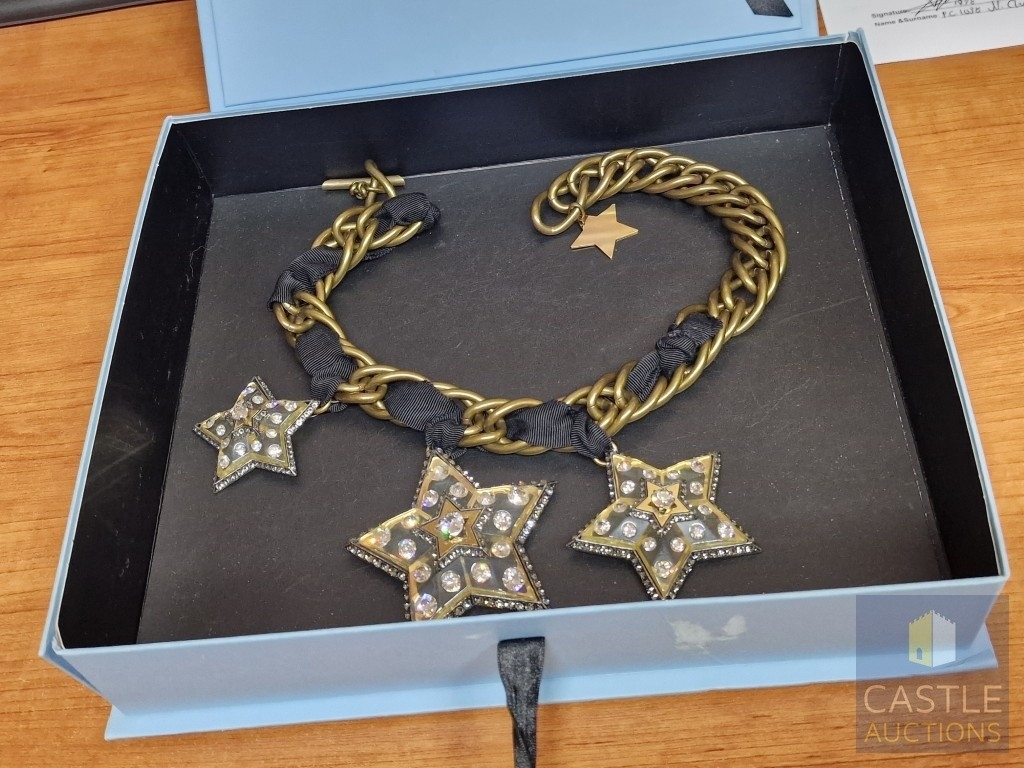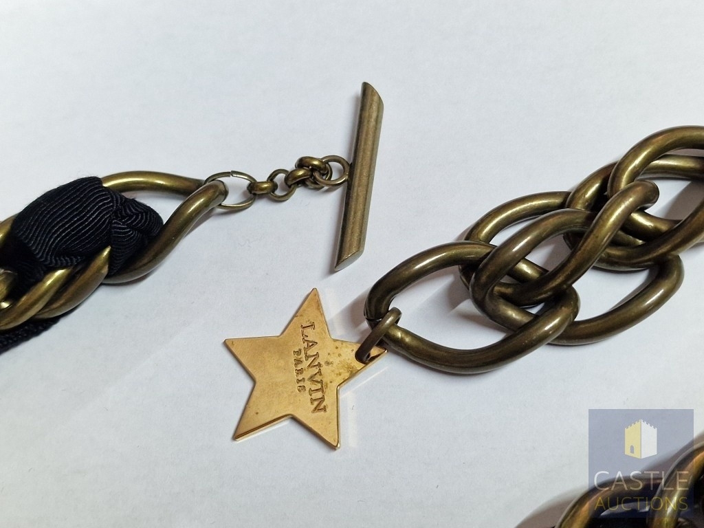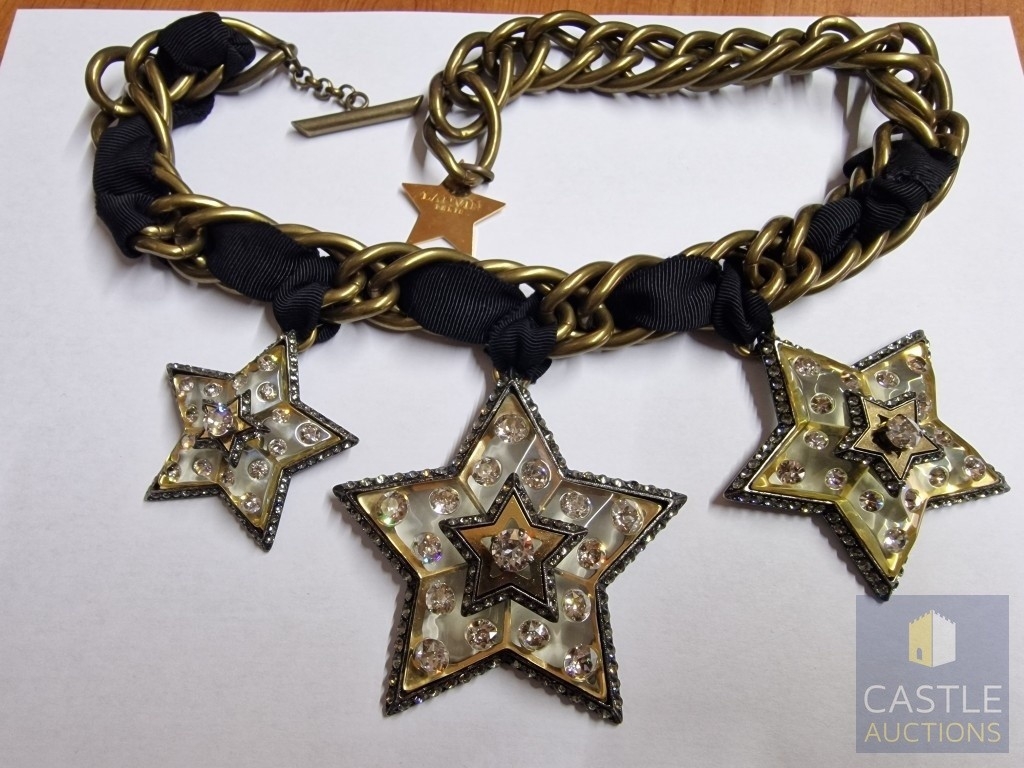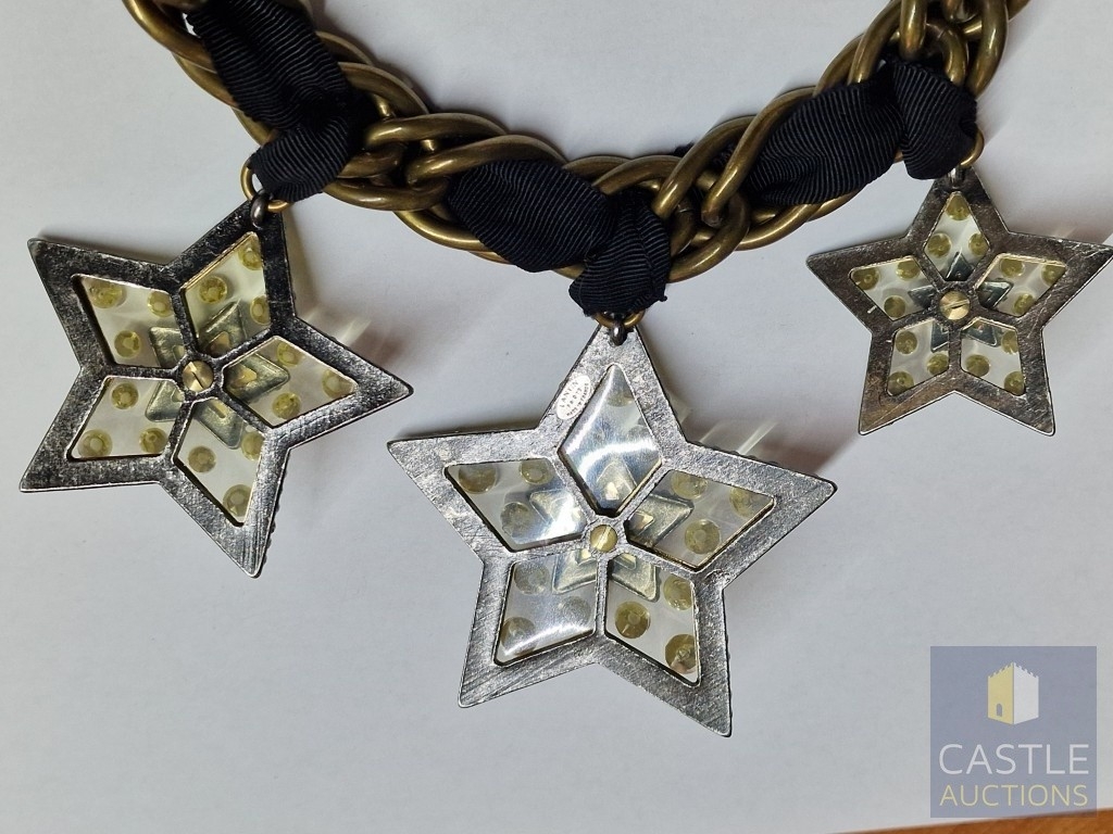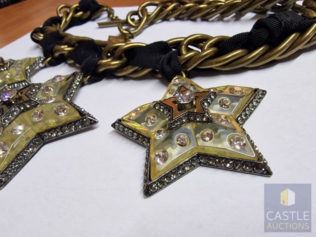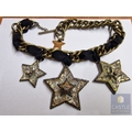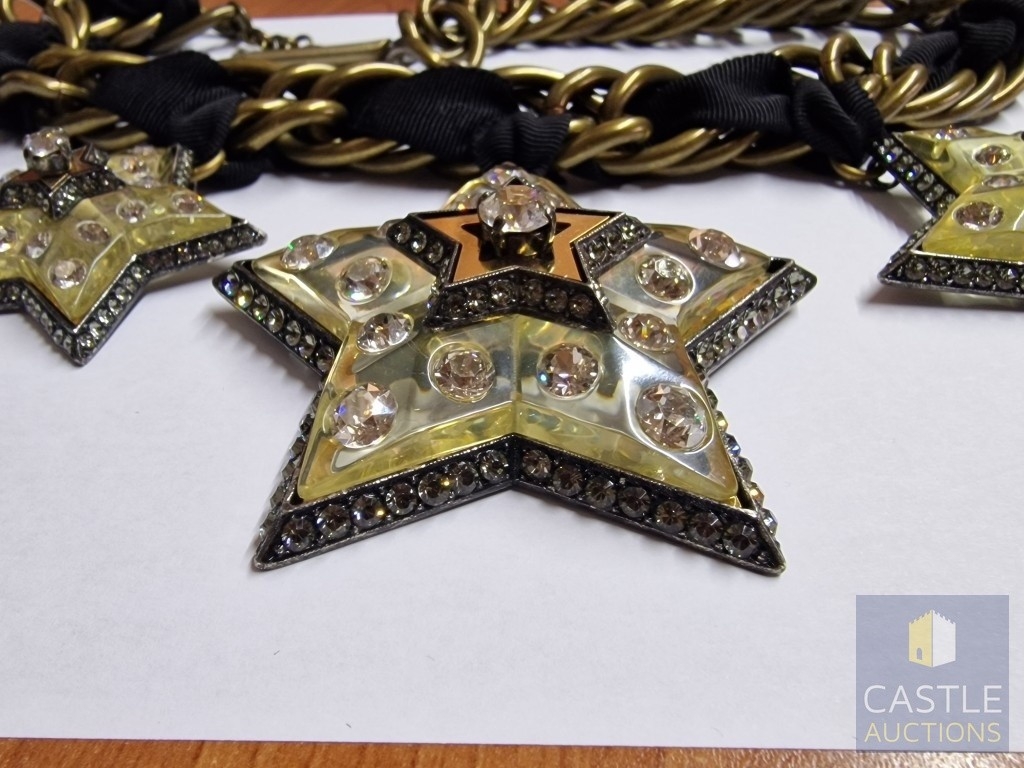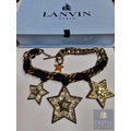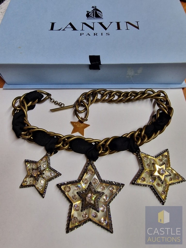 LANVIN Paris, 'Altair Star Necklace', a Striking Piece with 3 x Large Crystal Set Star Shaped Pendants on Gold Tone Double Link Chain Woven with Black Ribbon, Made in France, Together with Pale Blue LAVIN Box,