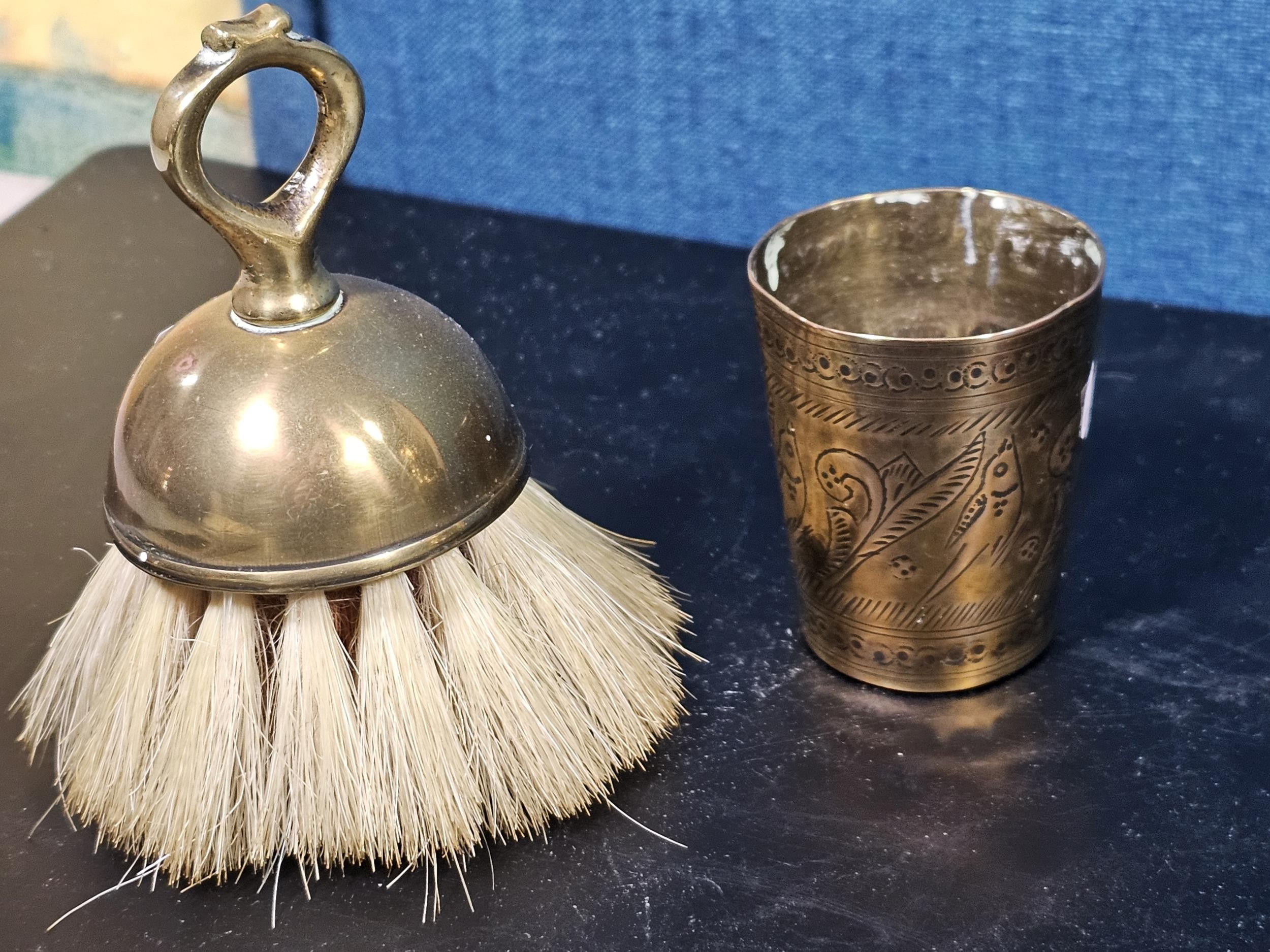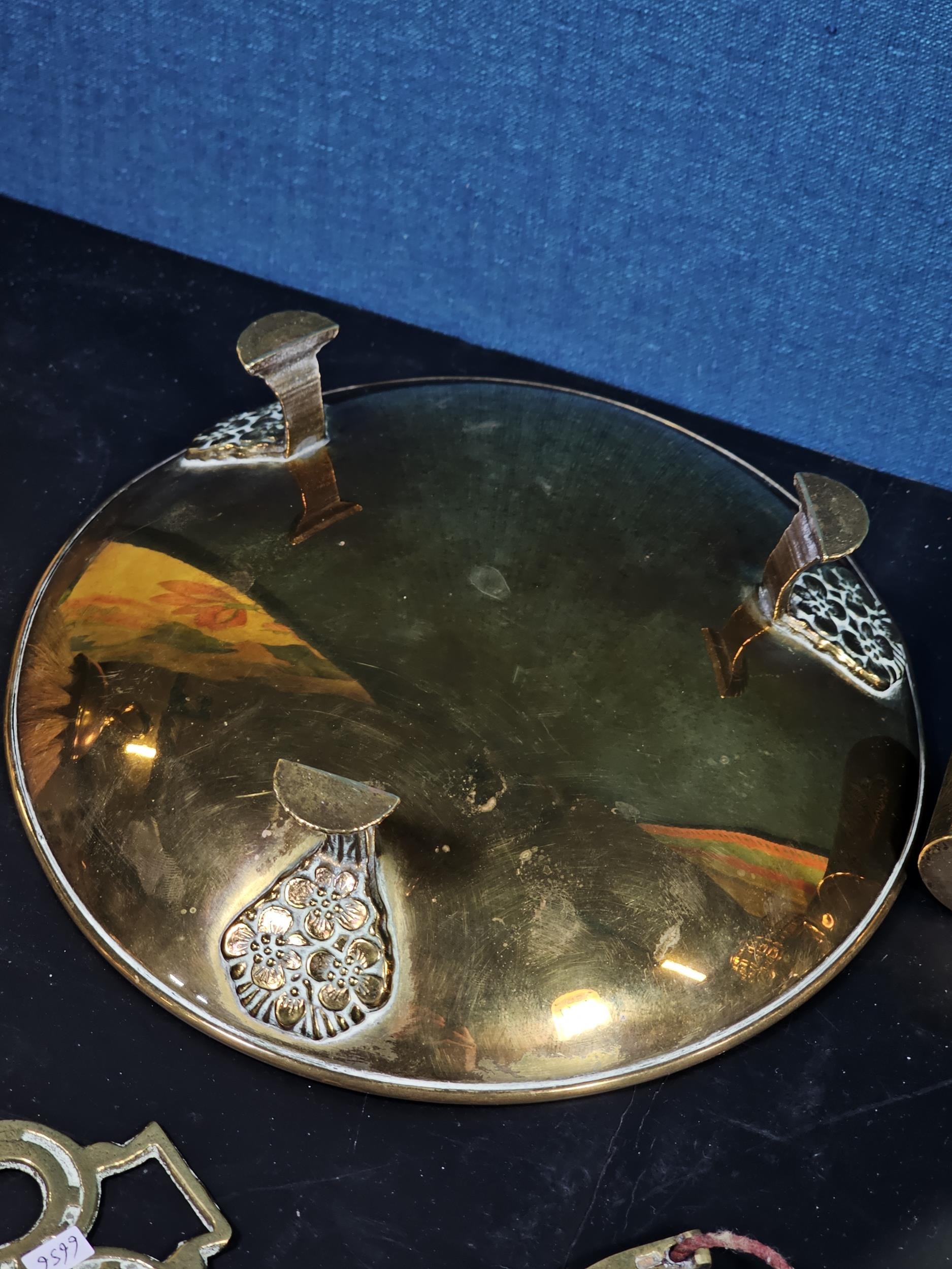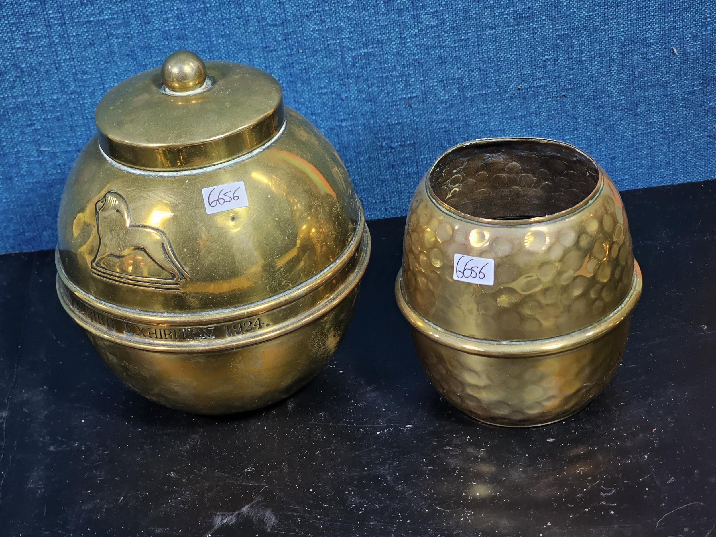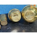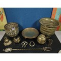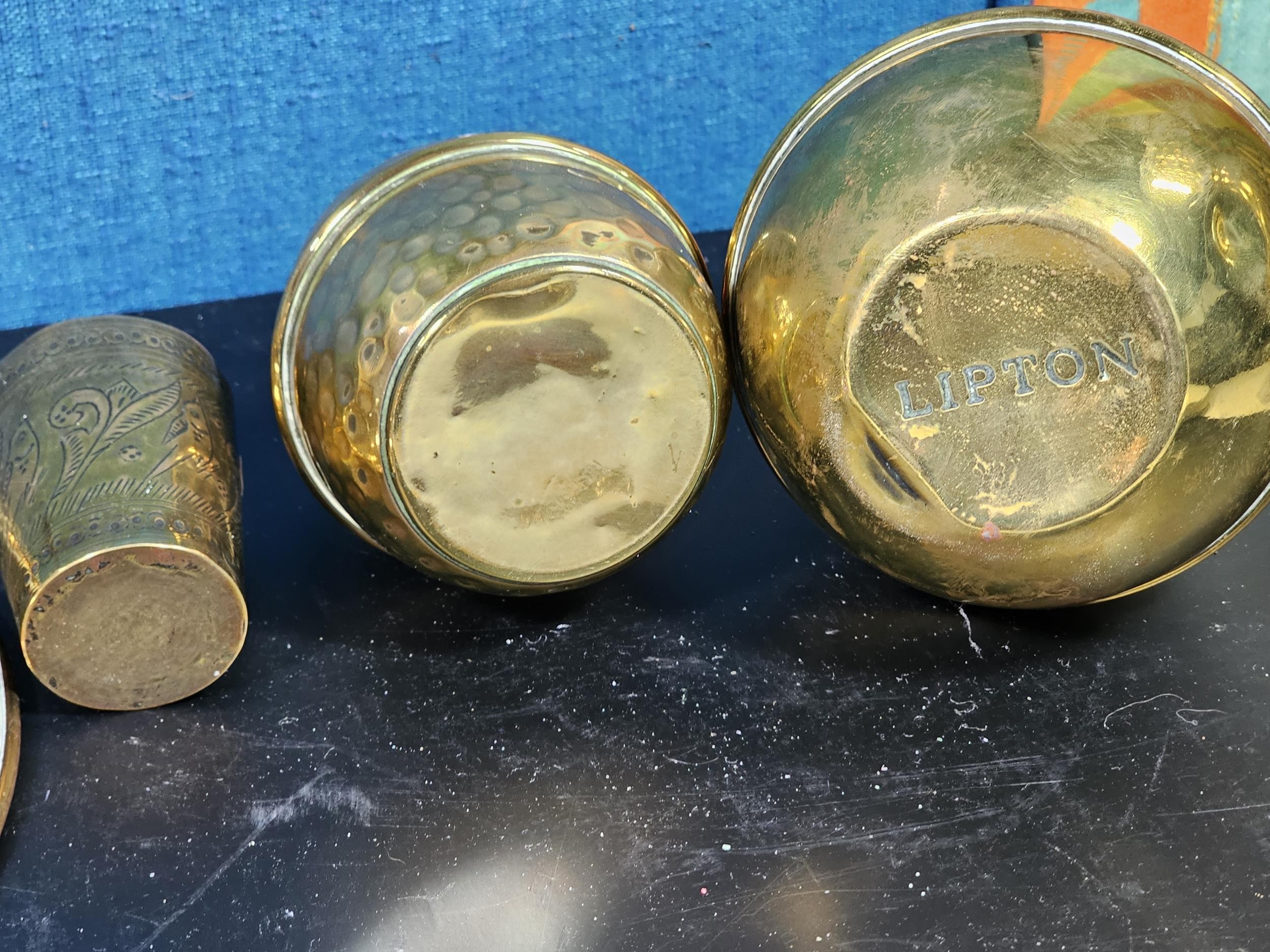 A quantity of collectable brassware to include a Lipton tea orb shaped tea caddie with a lion symbol to the front, 2 brass geometric patterned planters, a small brass topped crumb brush, a toasting fork with a face to the top labelled Kia Ora, along with a small quantity of horse brasses, etc. The largest planter has a height of 20cm and a diameter of 24cm.