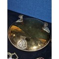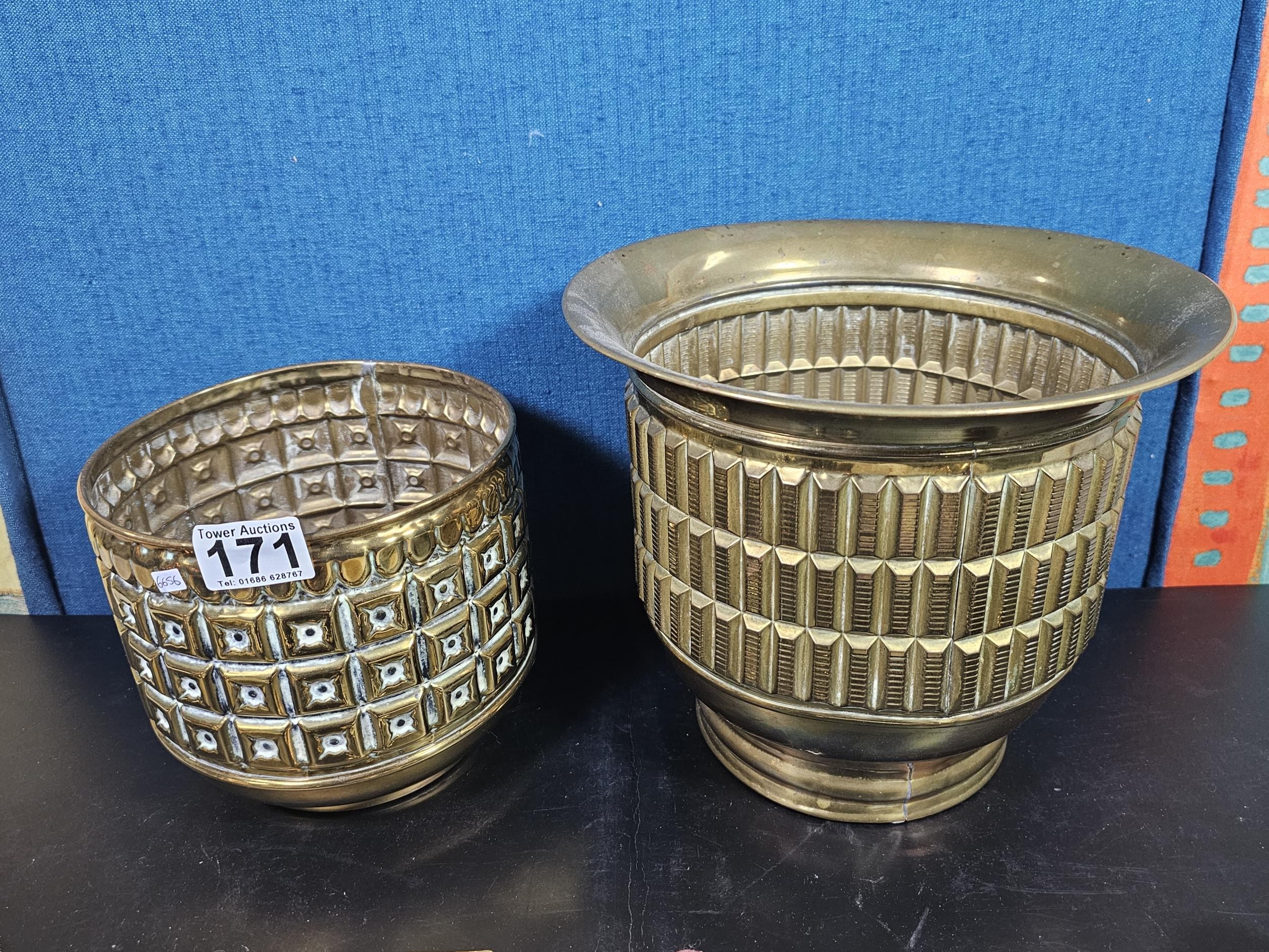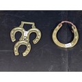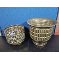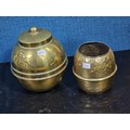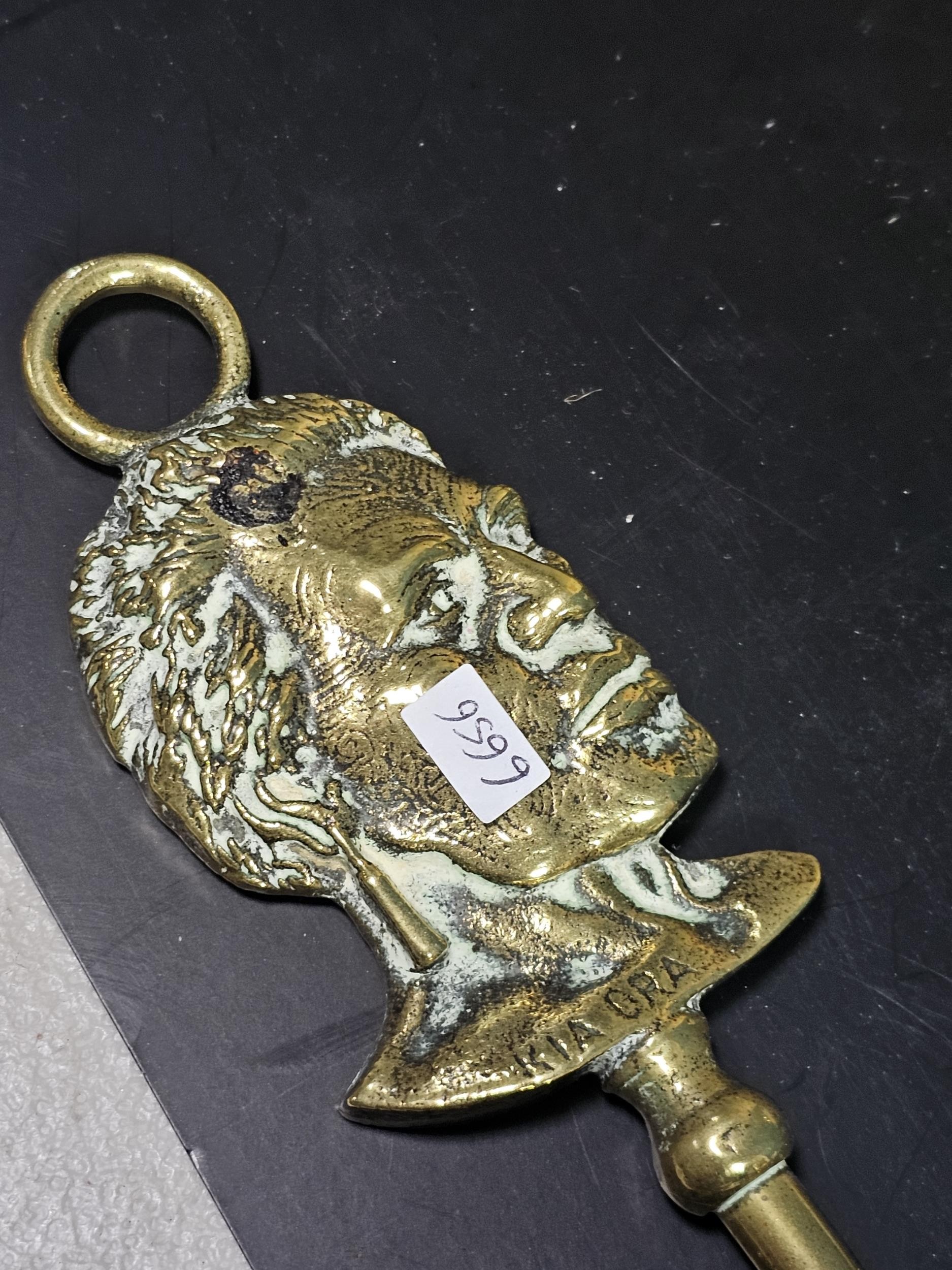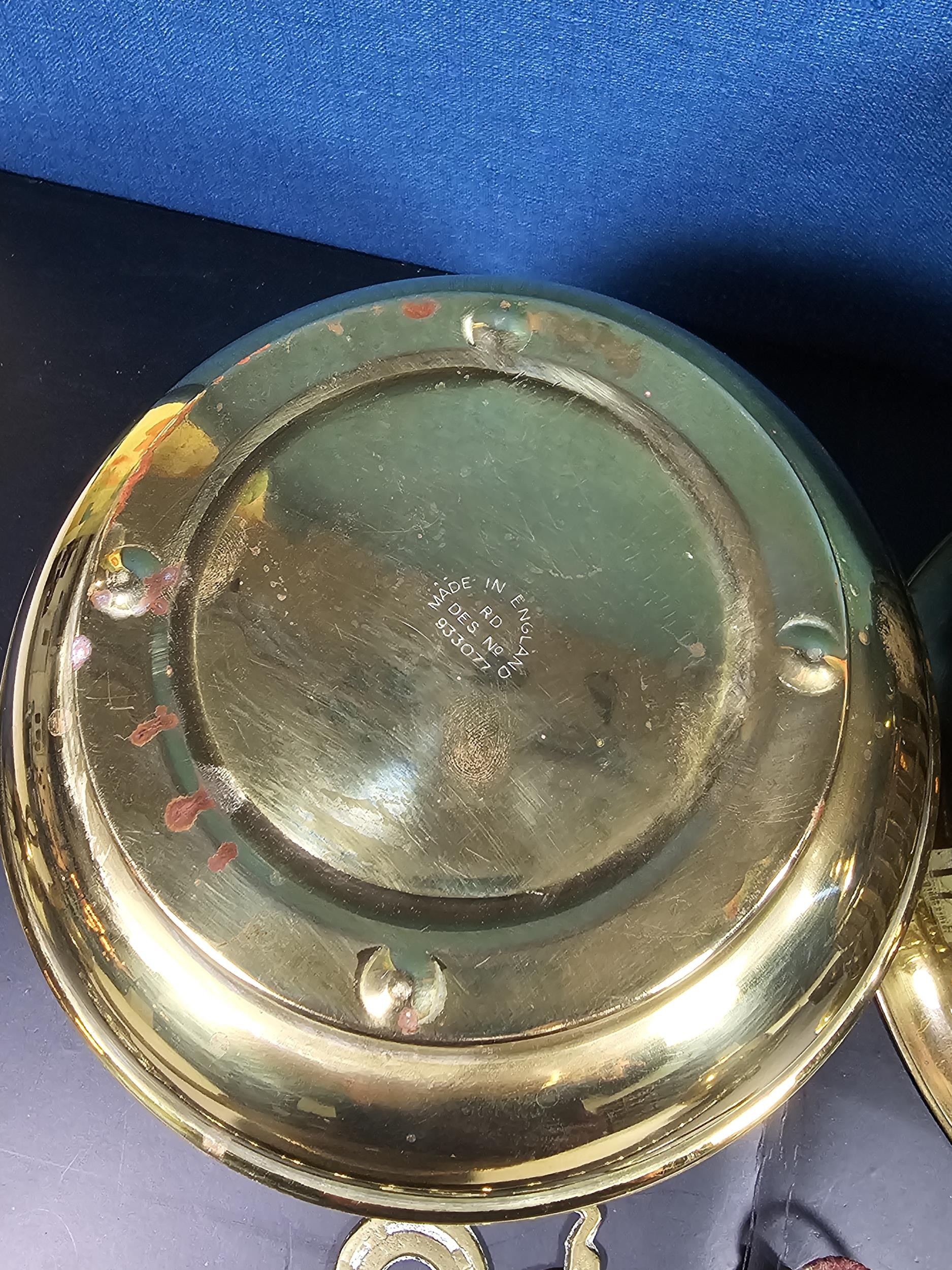 A quantity of collectable brassware to include a Lipton tea orb shaped tea caddie with a lion symbol to the front, 2 brass geometric patterned planters, a small brass topped crumb brush, a toasting fork with a face to the top labelled Kia Ora, along with a small quantity of horse brasses, etc. The largest planter has a height of 20cm and a diameter of 24cm.