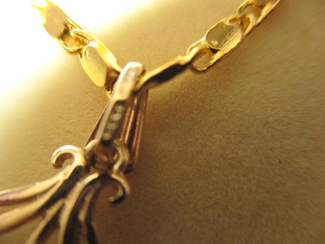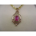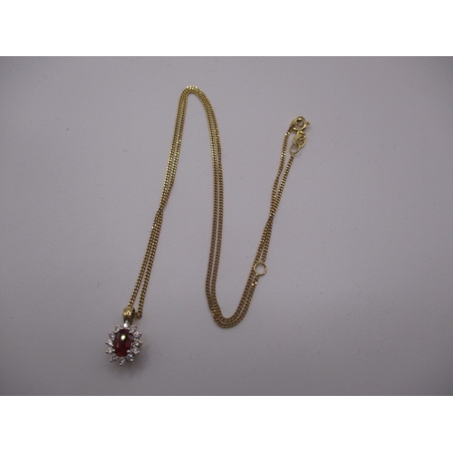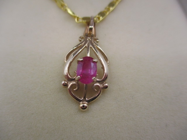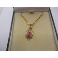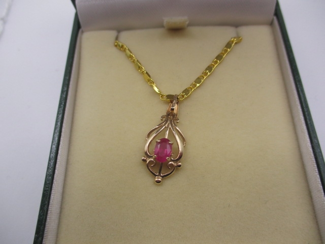 A 9ct gold necklace pendant with central ruby on plated chain, in good useable pre-owned condition
