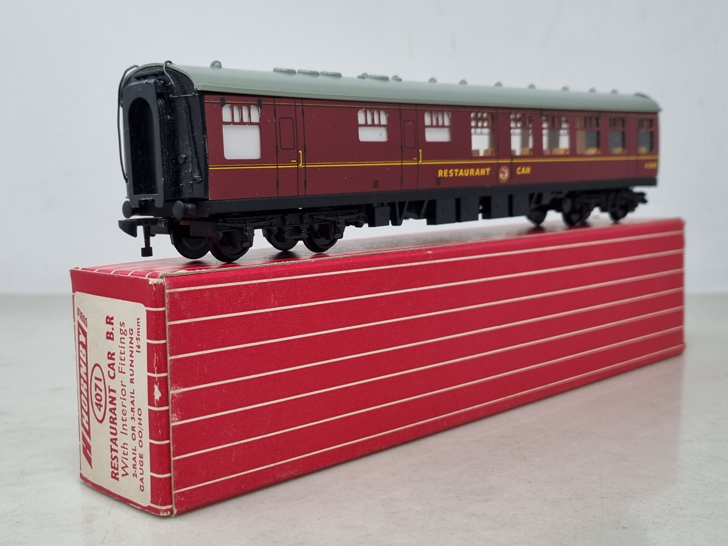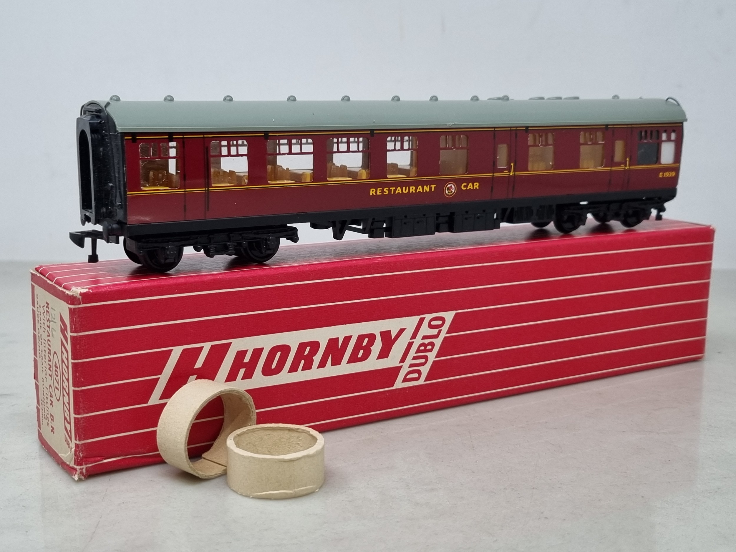 A boxed Hornby Dublo 4071 BR Restaurant Car, unused in mint condition, box superb, late type with NPC couplings and white type packing rings