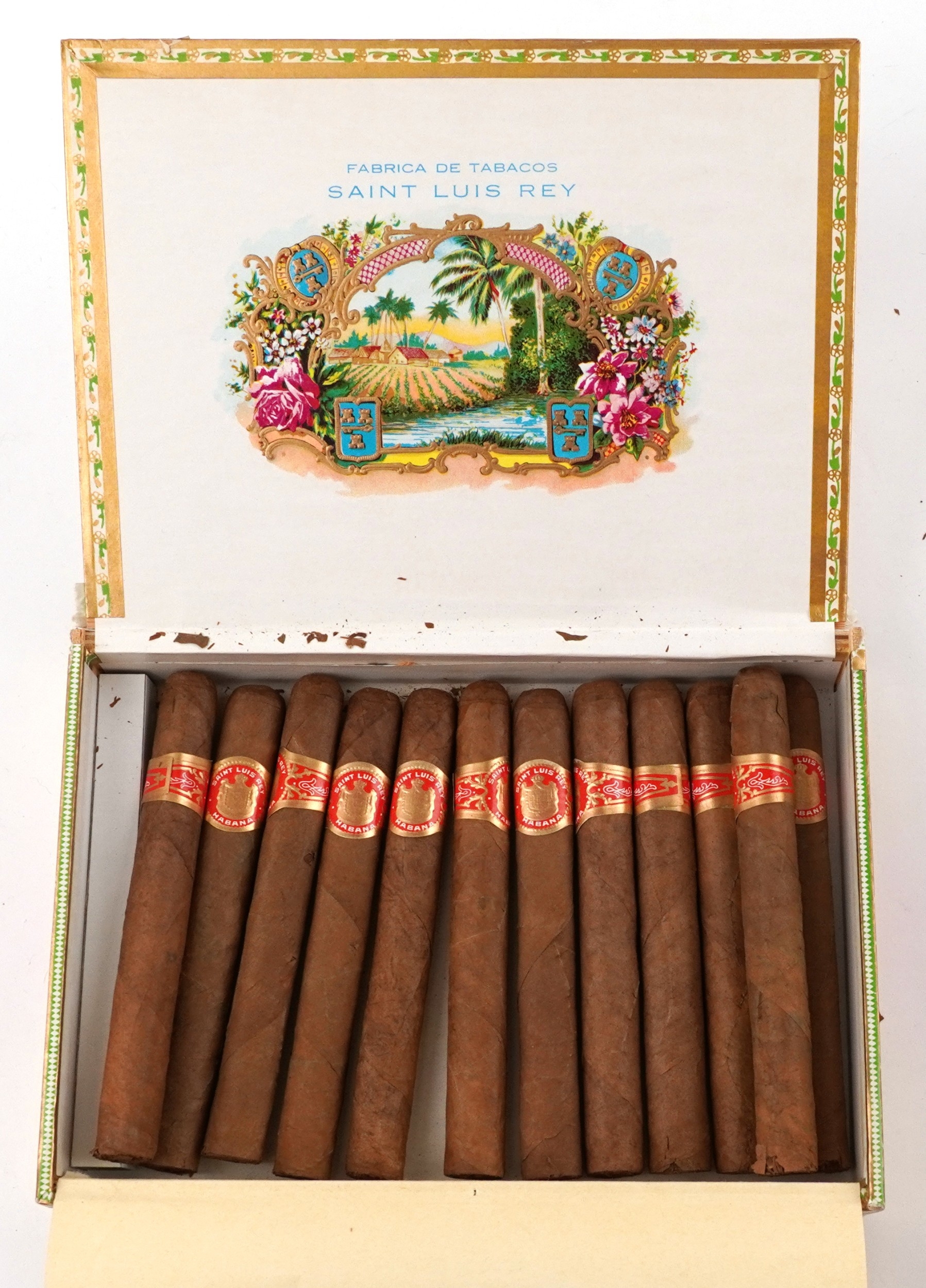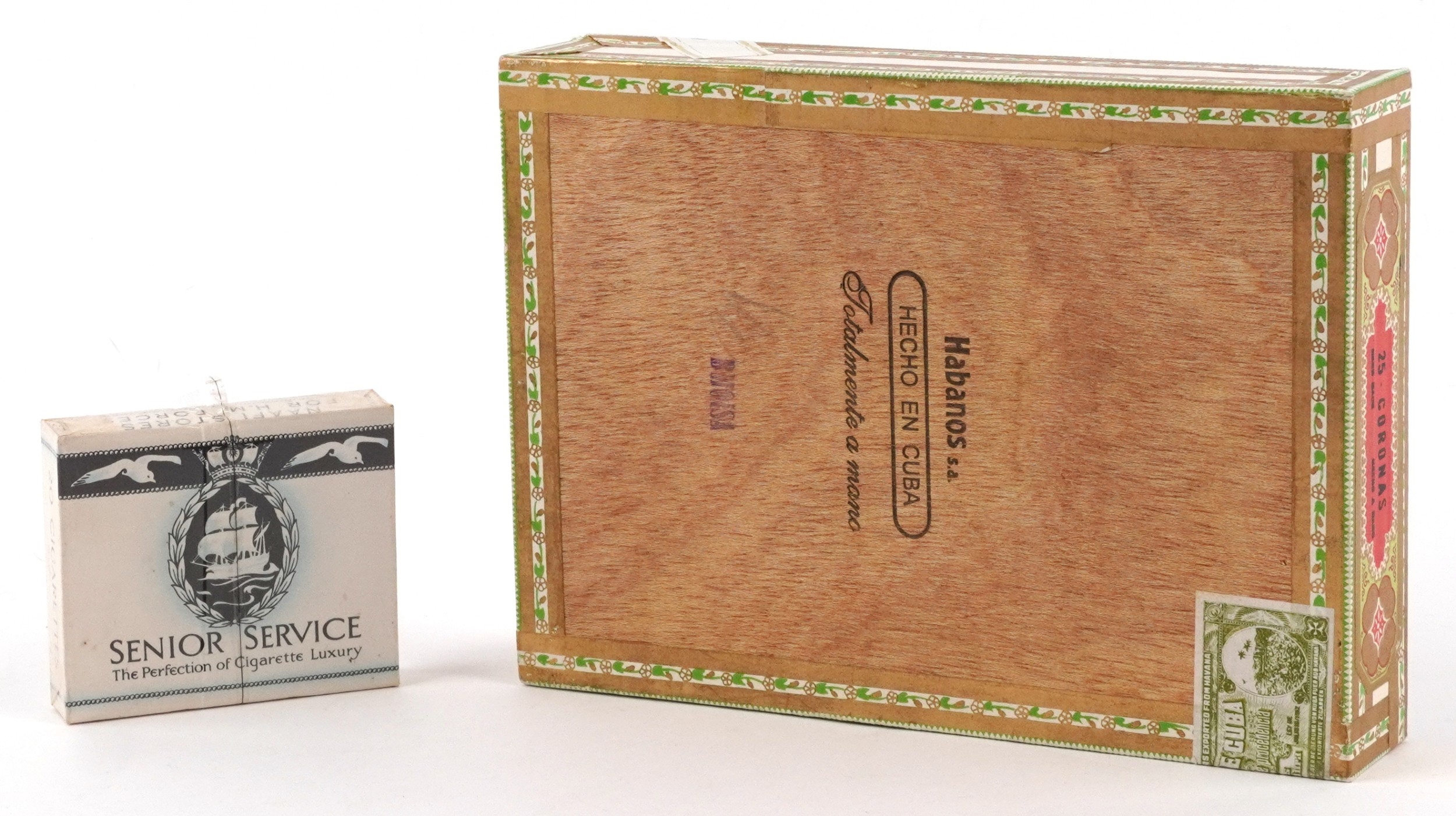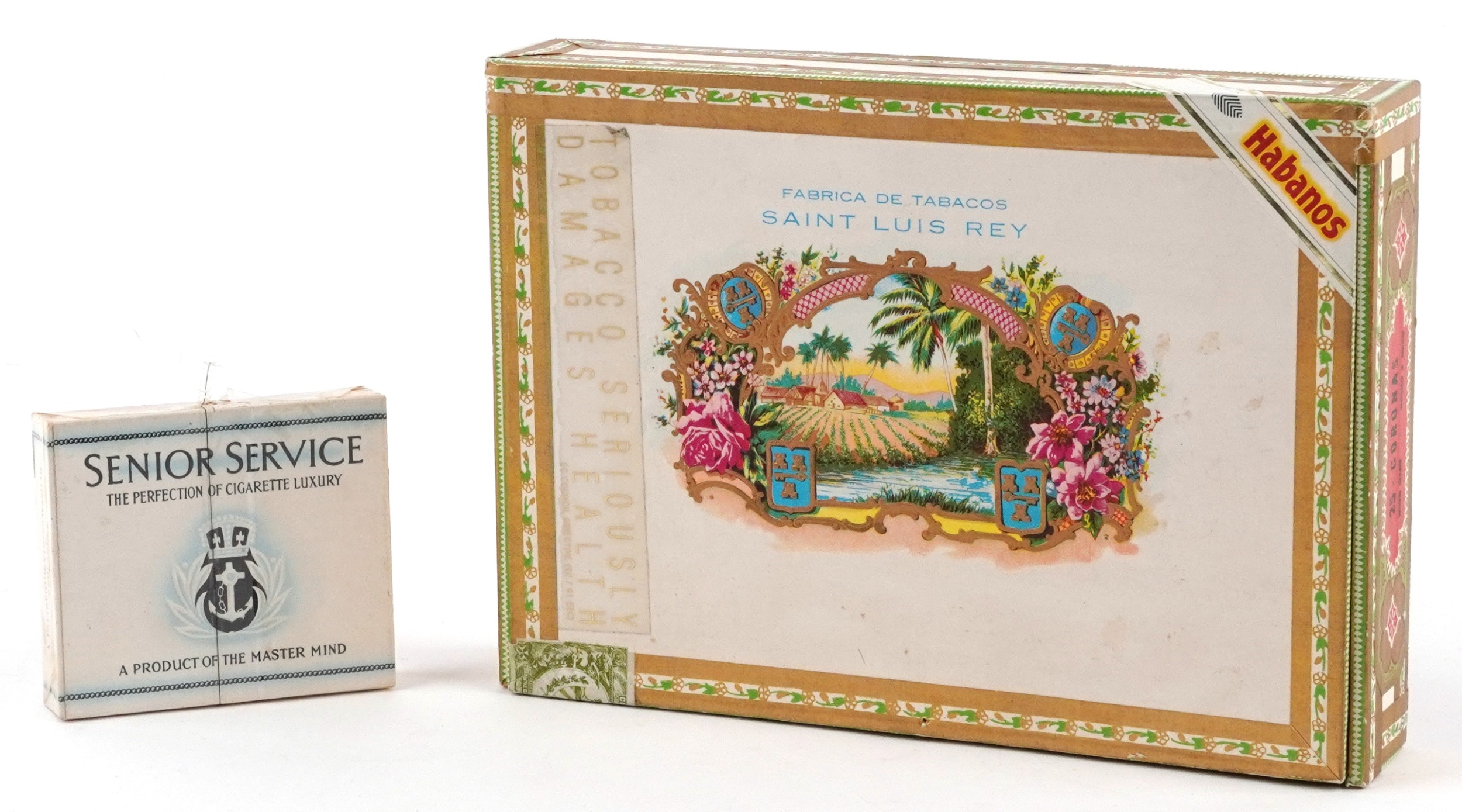 Twelve Saint Luis Rey Habana cigars with box and a sealed packet of Senior Service cigarettes.