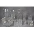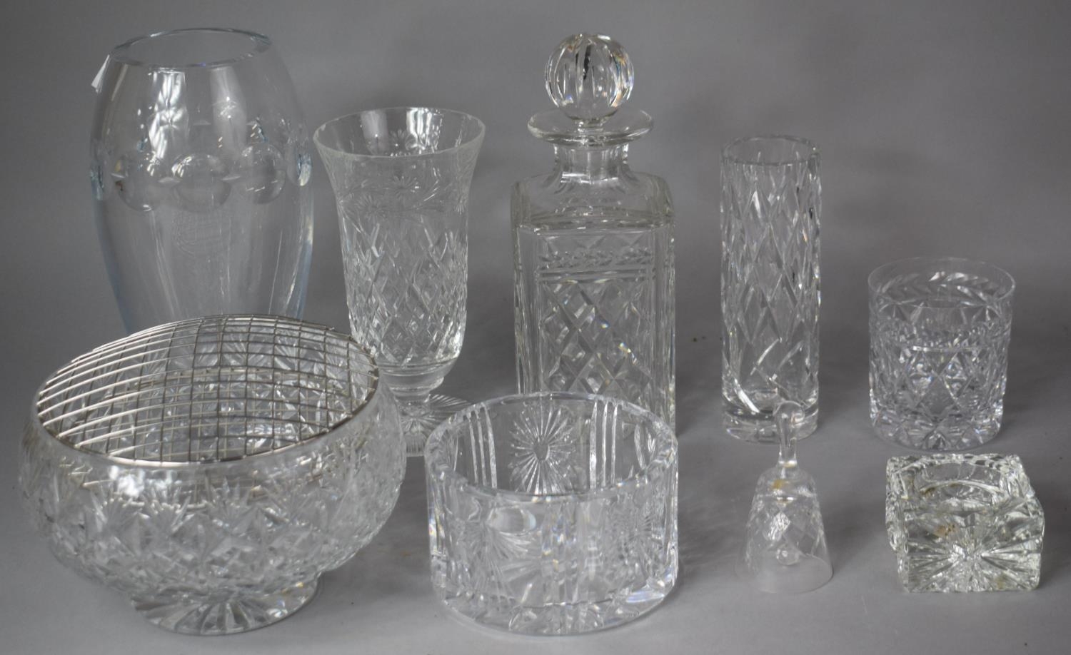 A Collection of Various Cut Glass Items to Include Heavy Thumb Cut Vase, Waterford Cut Glass Bowl, Rose Bowl Etc
