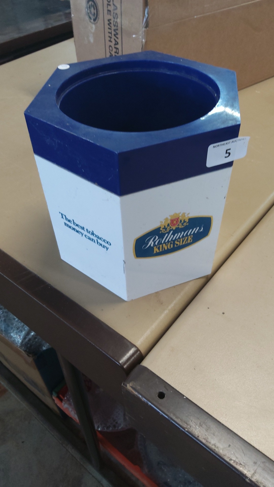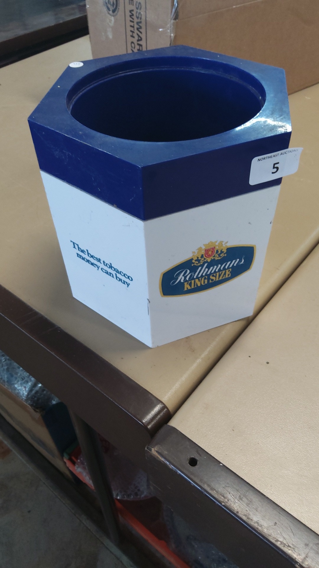 Rothmans ‘King Size’ promotional counter-top ice bucket of hexagonal tapering form, the white body printed with the brand cartouche and slogan, beneath a dark-blue moulded rim with circular opening.