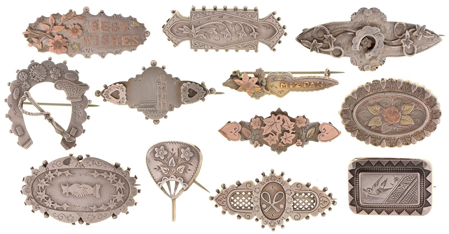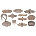 Twelve Victorian and Edwardian silver brooches, including round, oval, horseshoe shaped and other examples, on engraved with a view of Boston Stump, various sizes, makers and dates, 46.5g