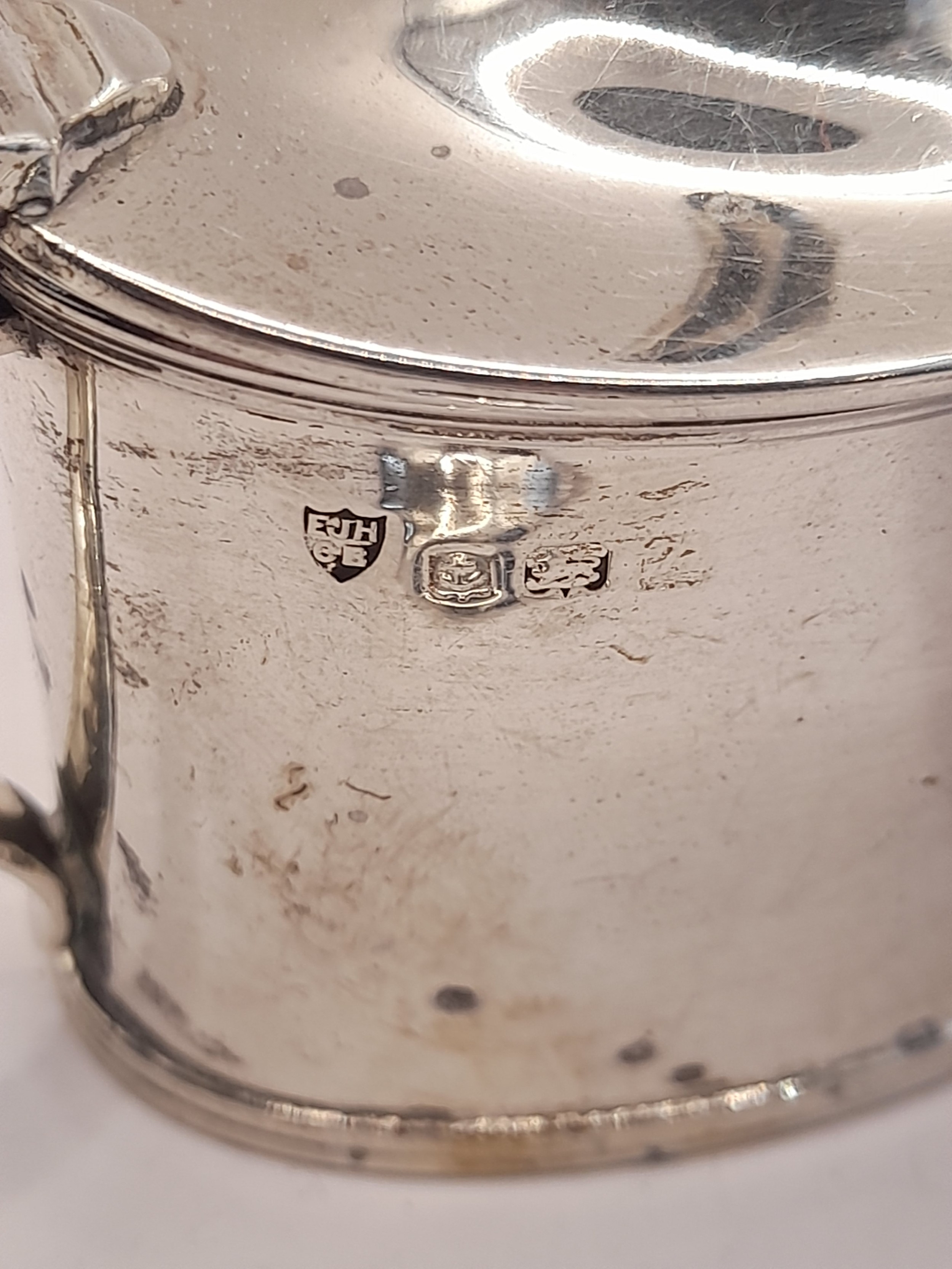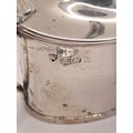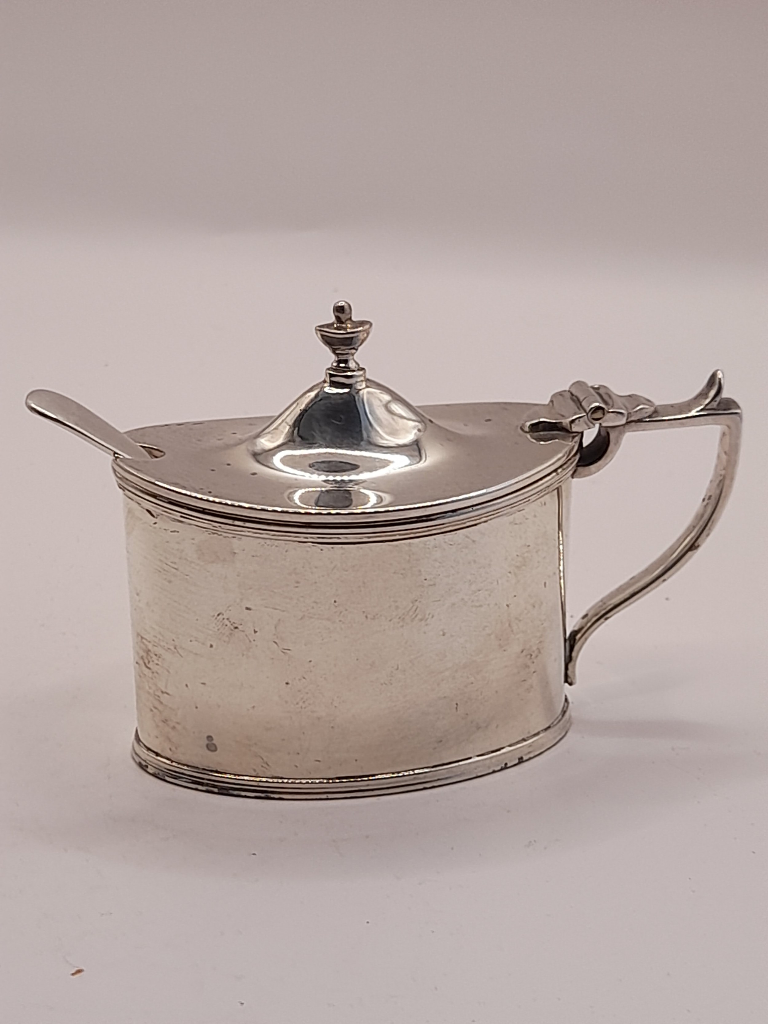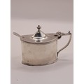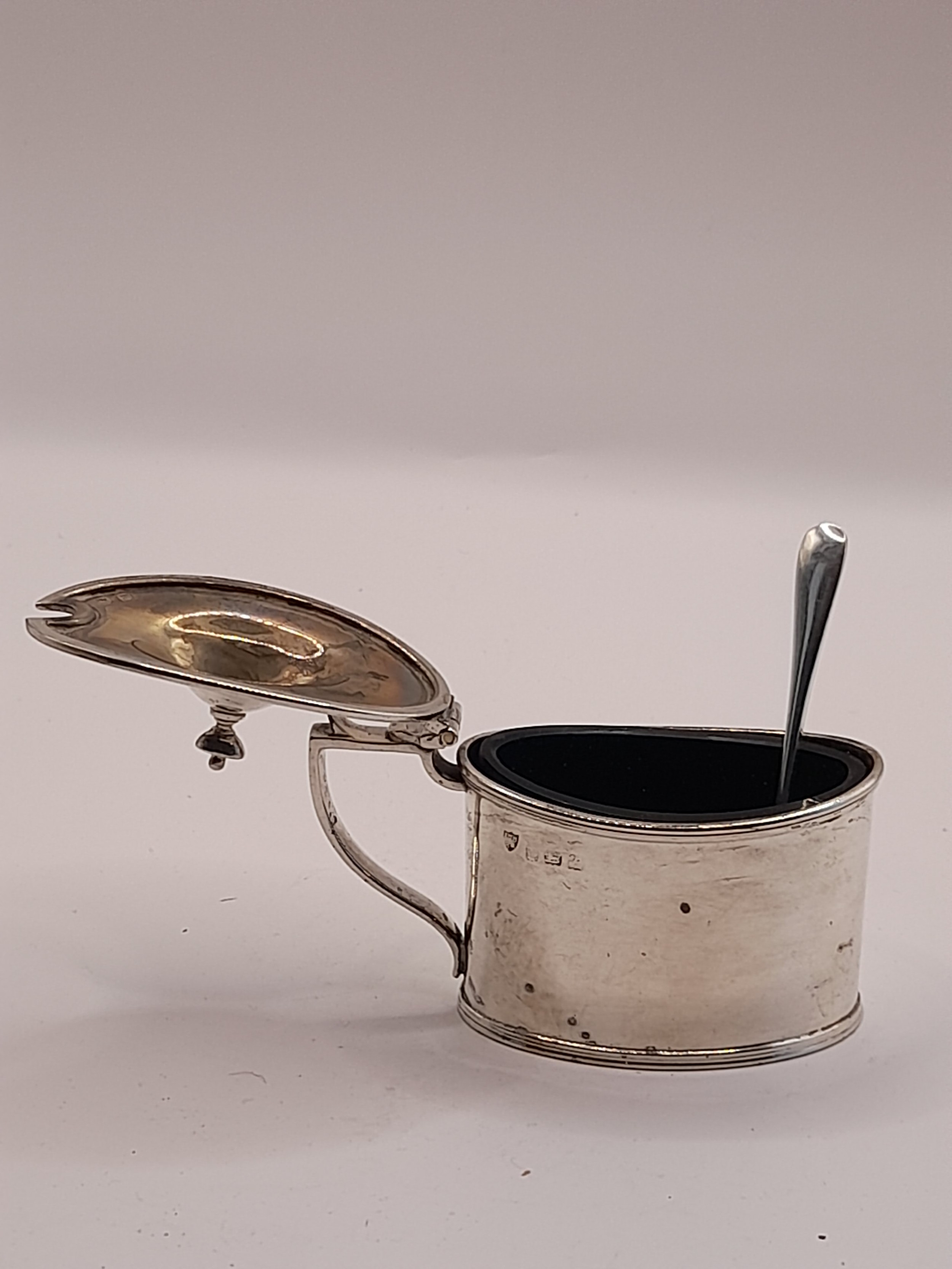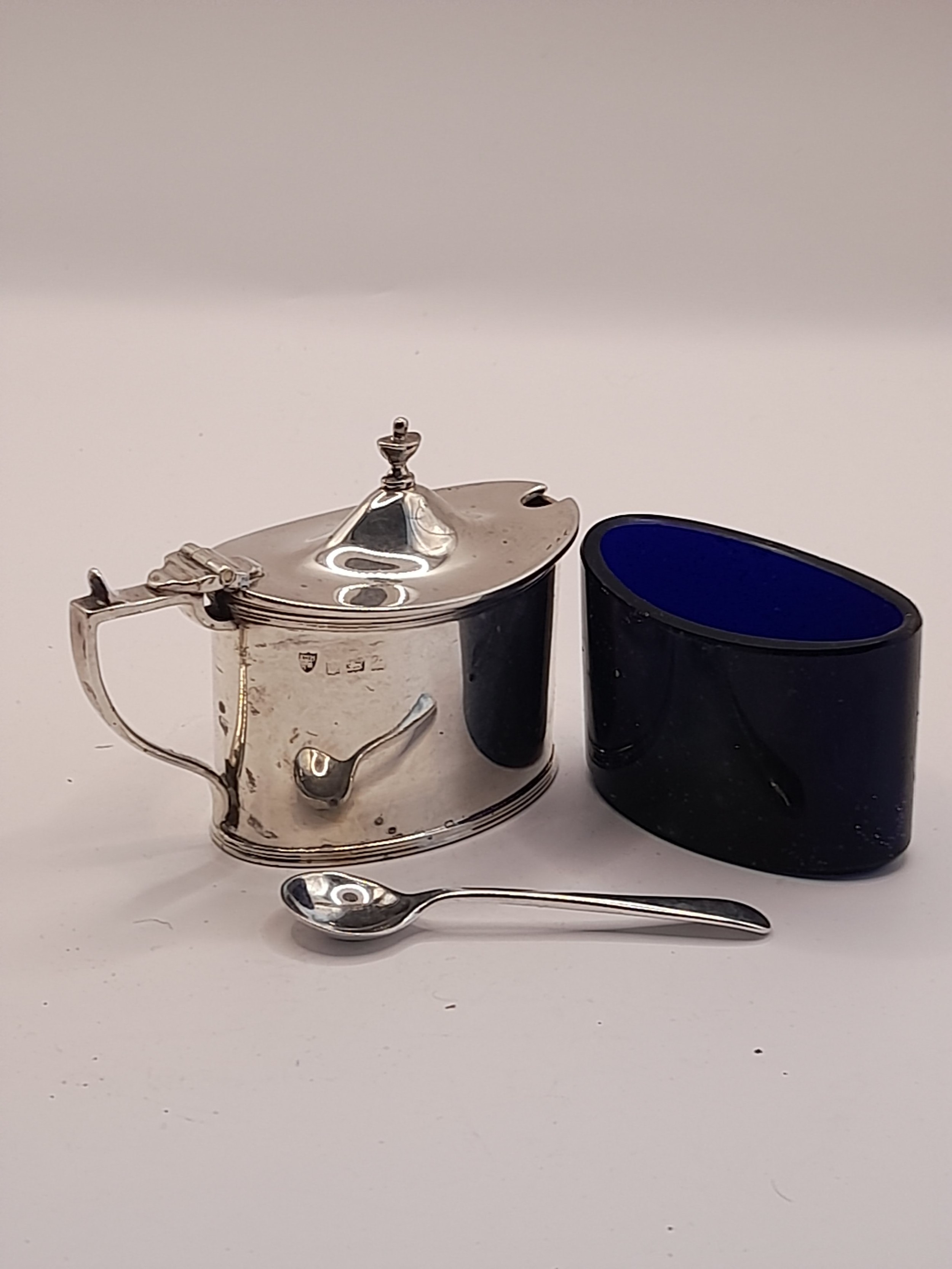 Hallmarked Silver Mustard Pot with silver hallmarked spoon and blue glass liner. 6.5cm high x 9cm wide