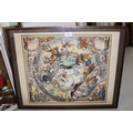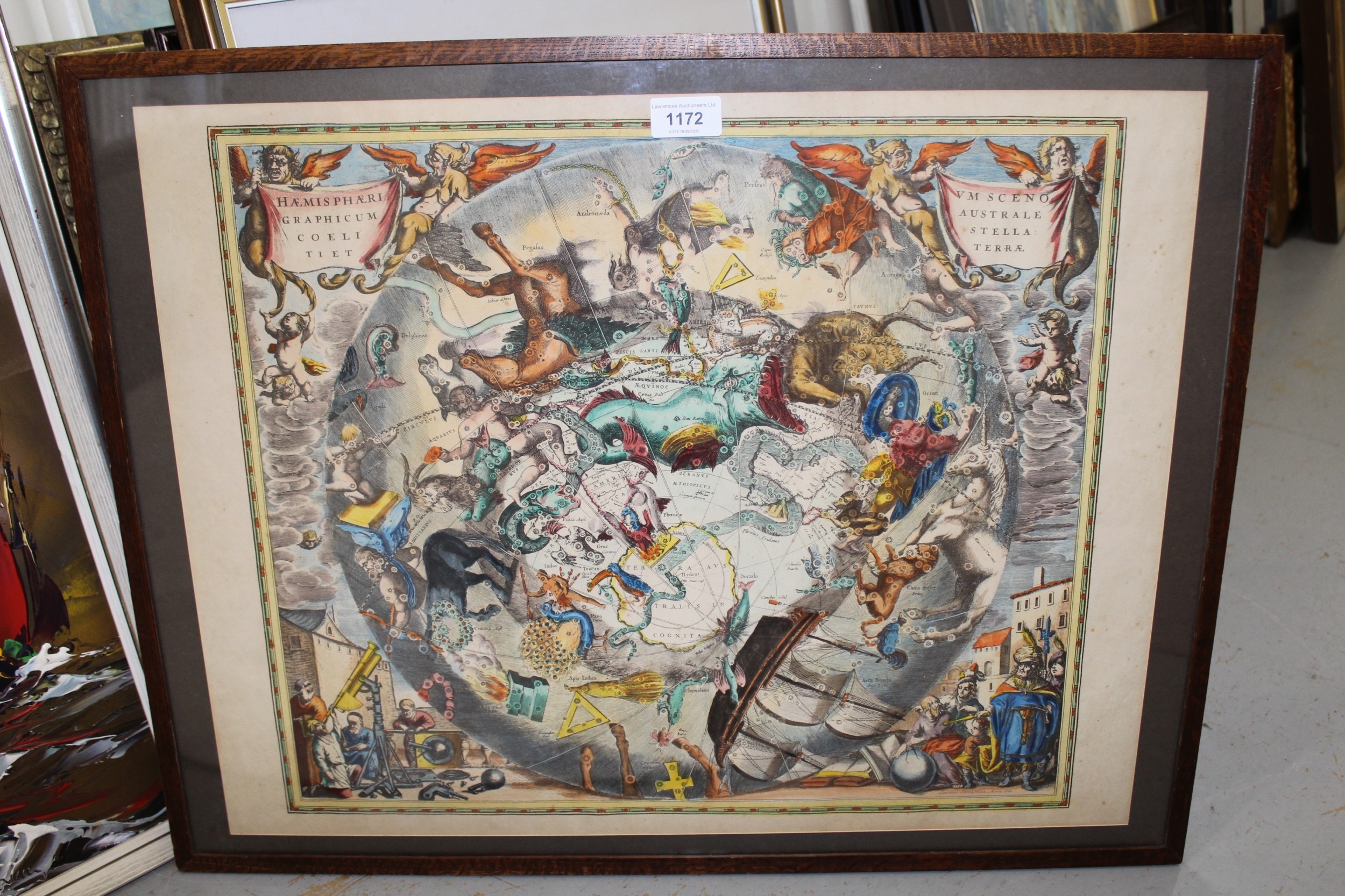 Antique hand coloured reprint of the celestial chart of the Southern Hemisphere after Joannes Janssonius with hand coloured decoration, 44 x 51cm, oak framed
