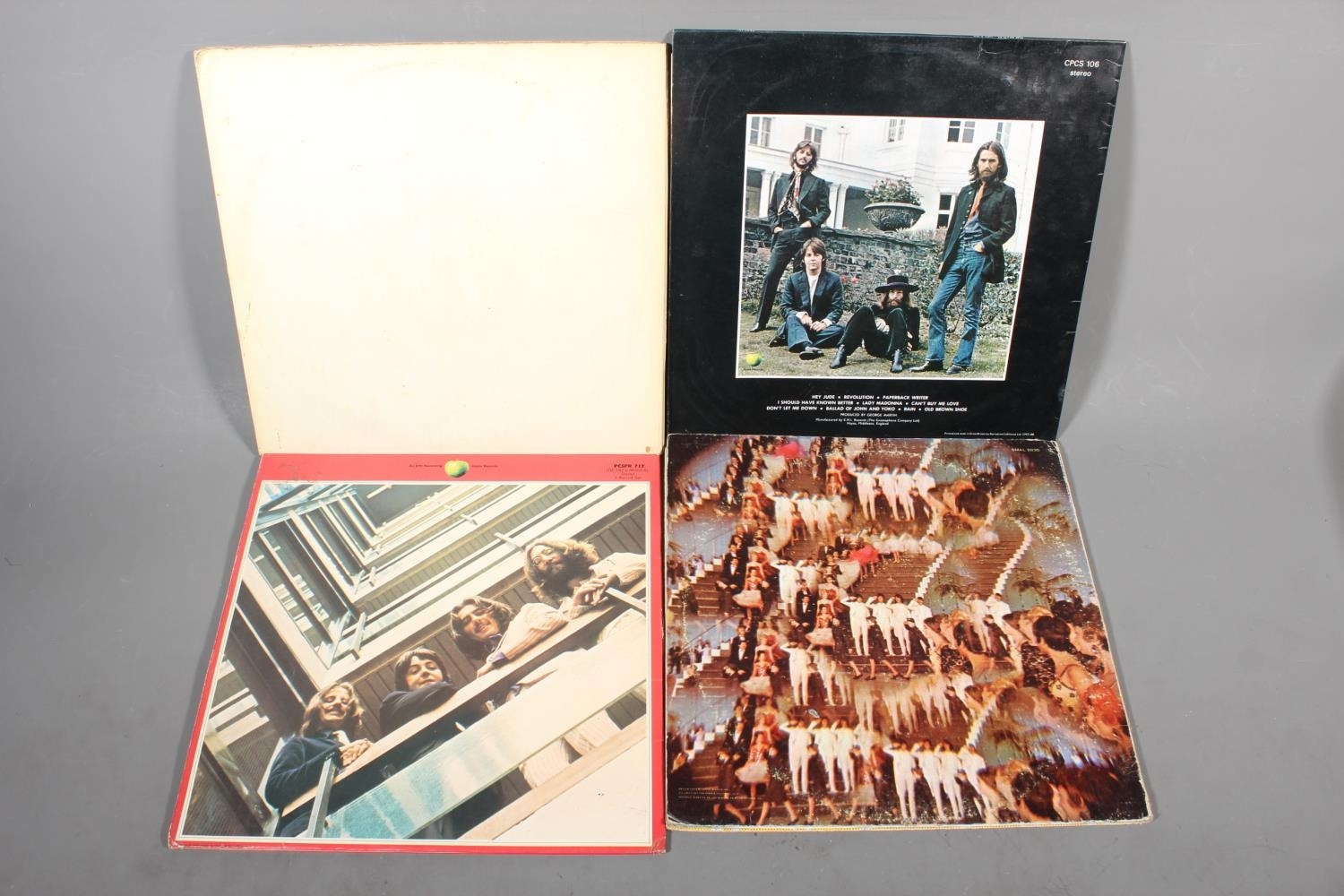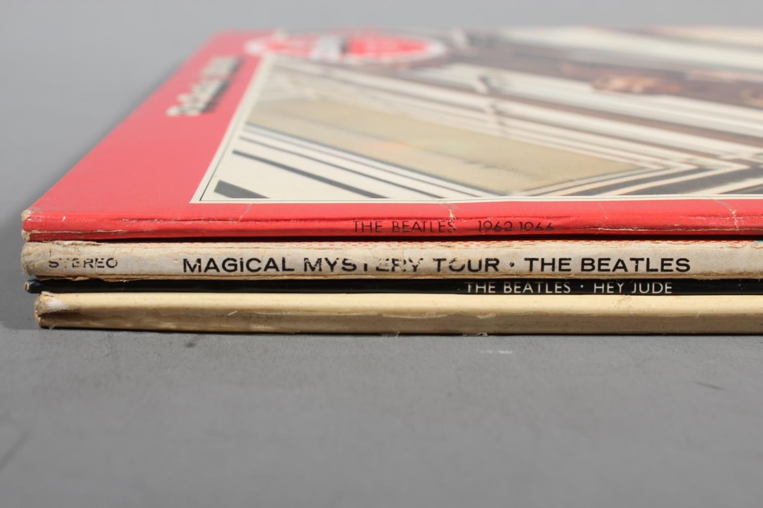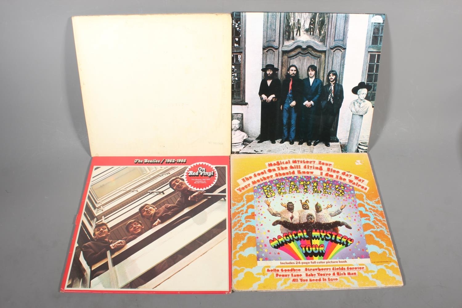 Beatles vinyl records to include Hey Jude UK export cover, Magical Mystery Tour with 24 page colour book, The Beatles White Album and The Beatles 1962-1966 on double red vinyl.