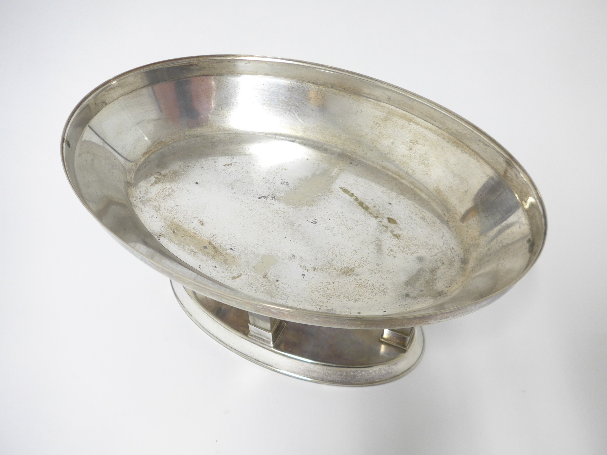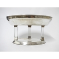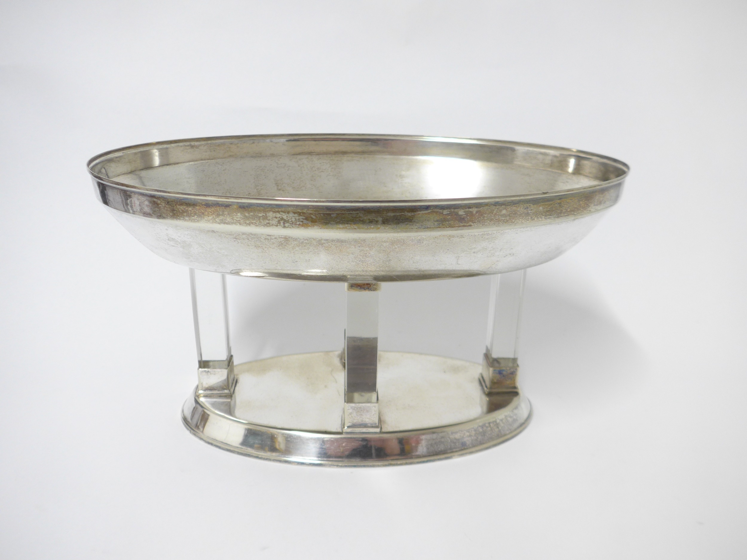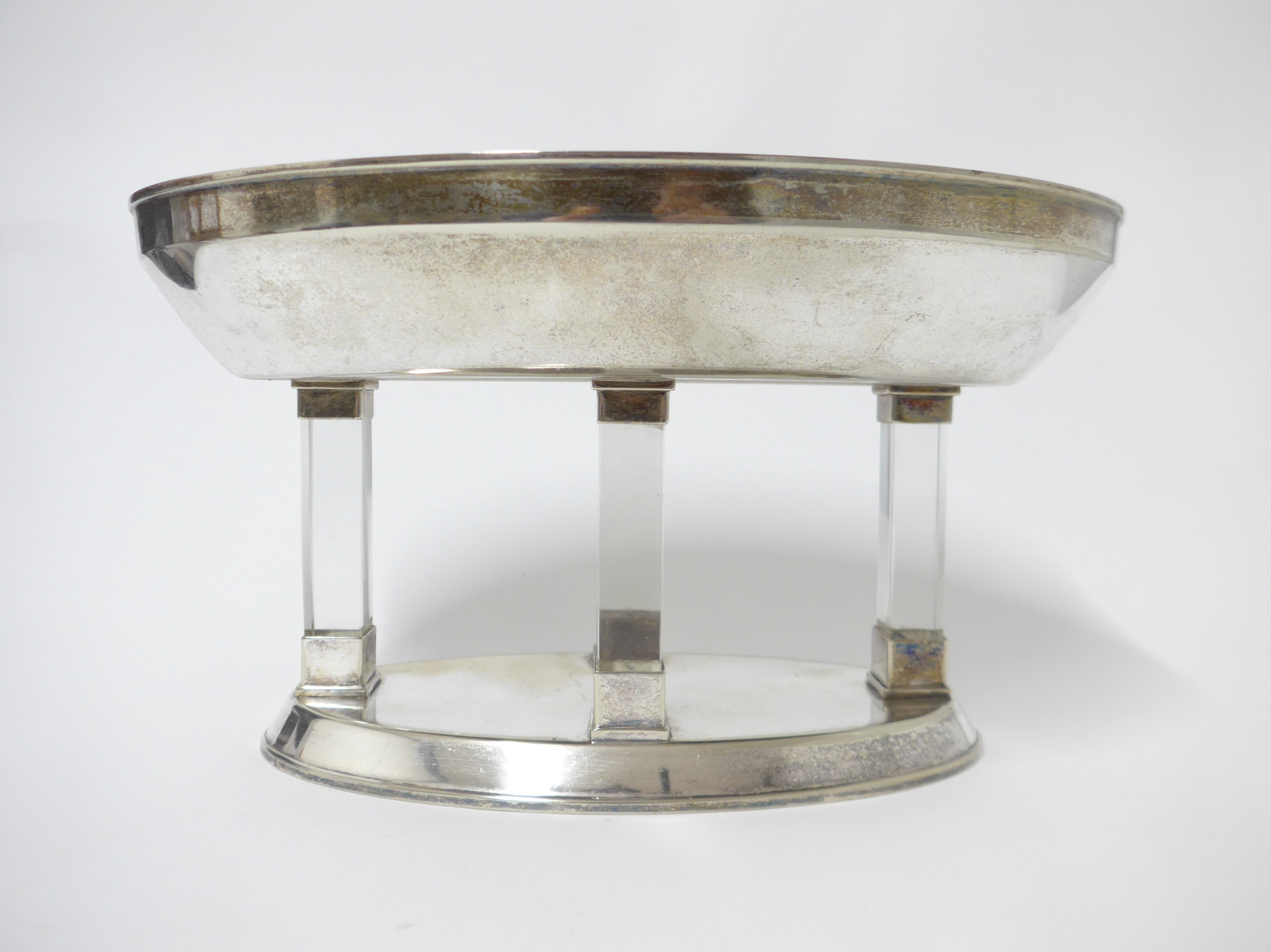A German Art Deco Orivit Nickel Silver Oval Centrepiece On Crystal Glass Angular Columns Circa 1930, marks to base. 18.5cm high x 33.5cm x 22cm