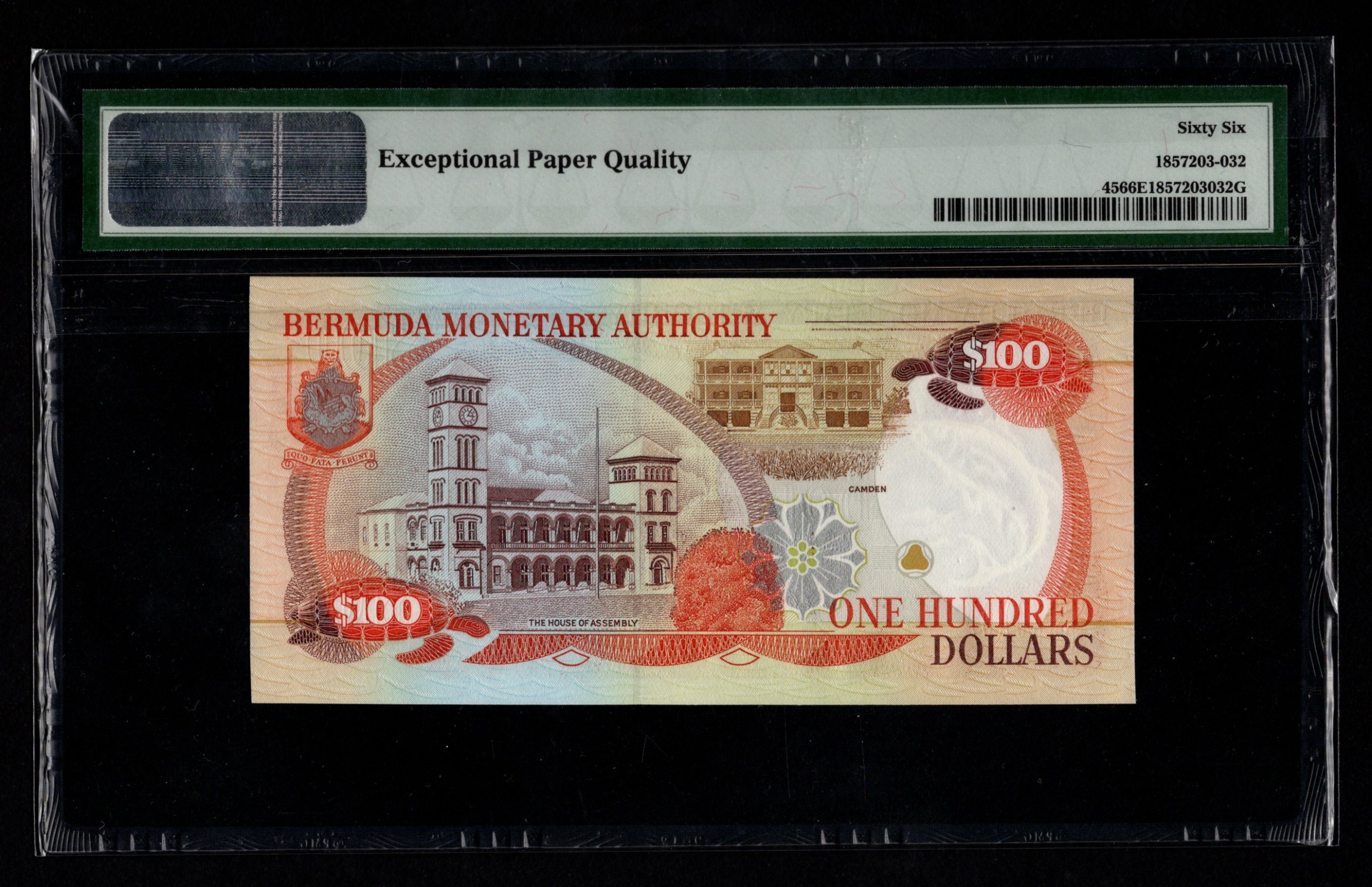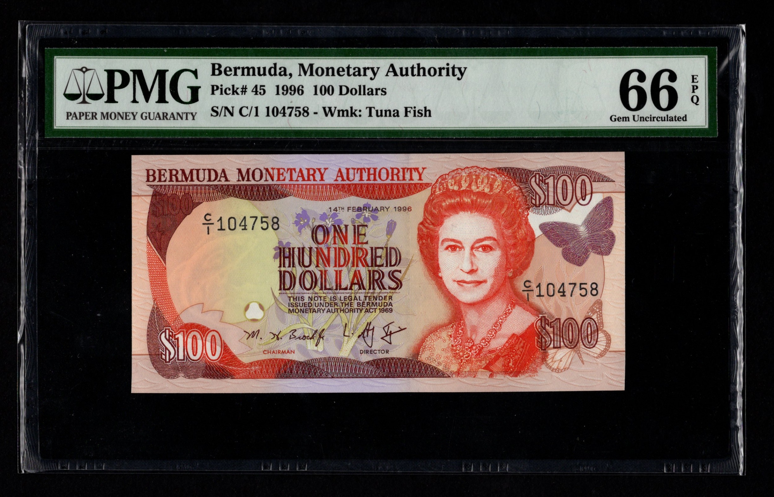 Bermuda 100 Dollars dated 14th February 1996, serial C/1 104758 (BNB B221a, Pick45) in PMG holder graded 66 EPQ Gem Uncirculated