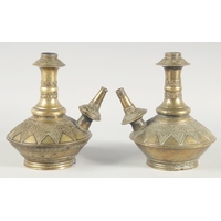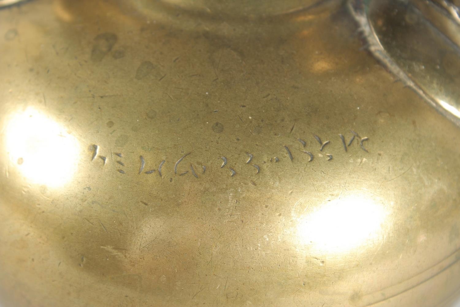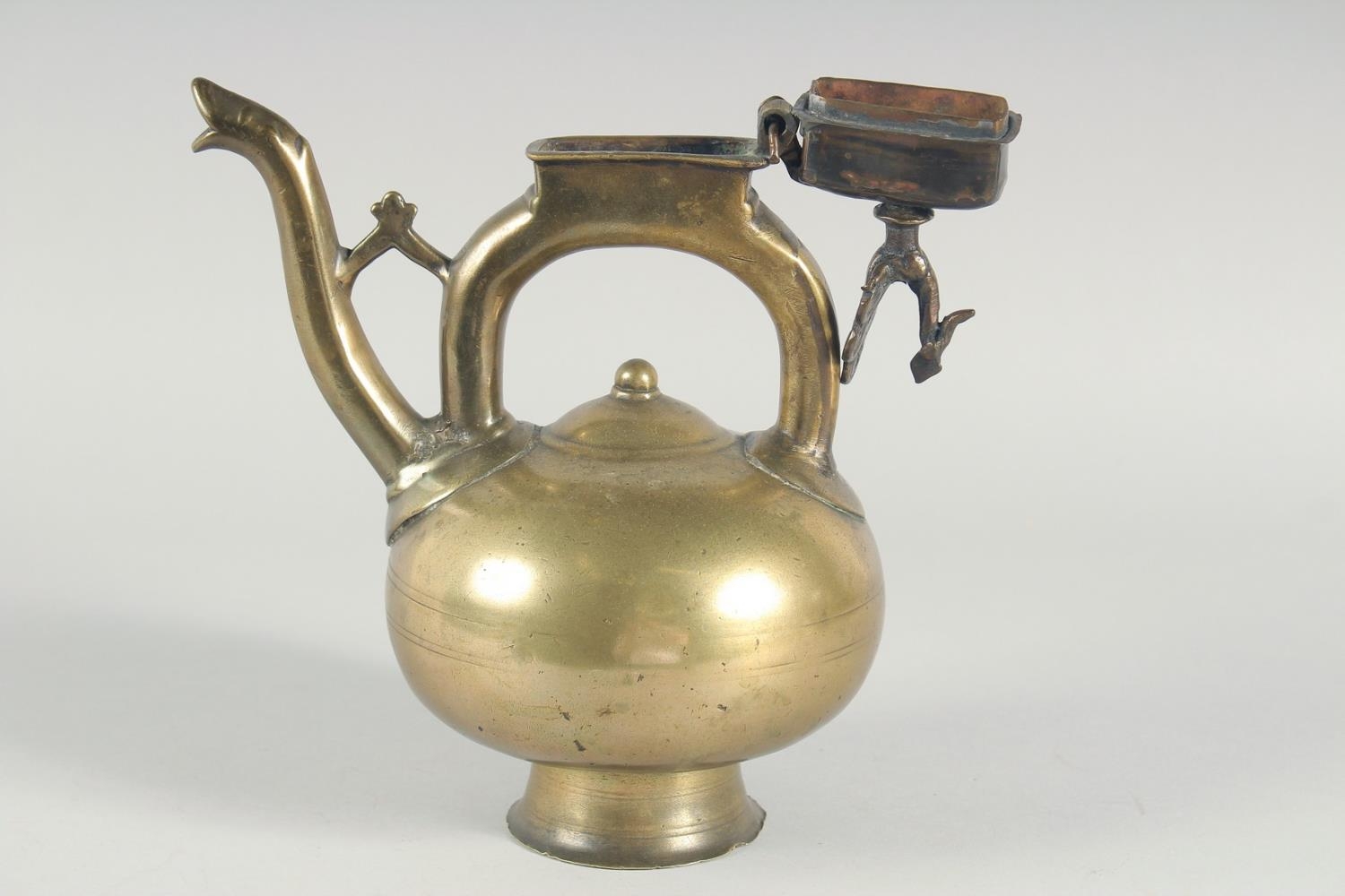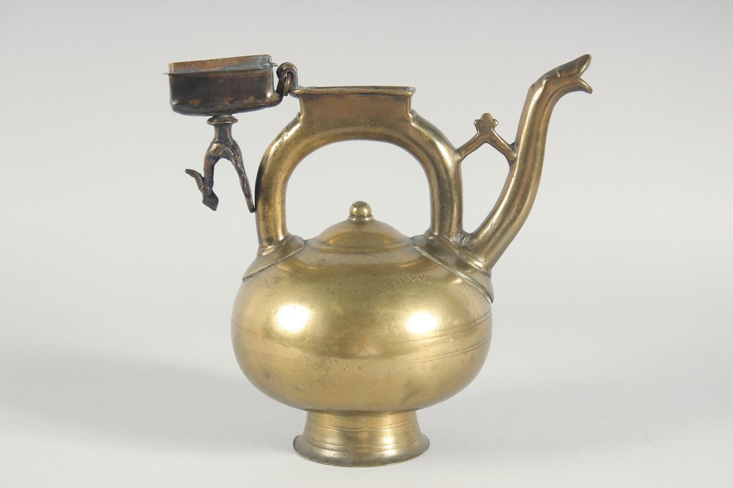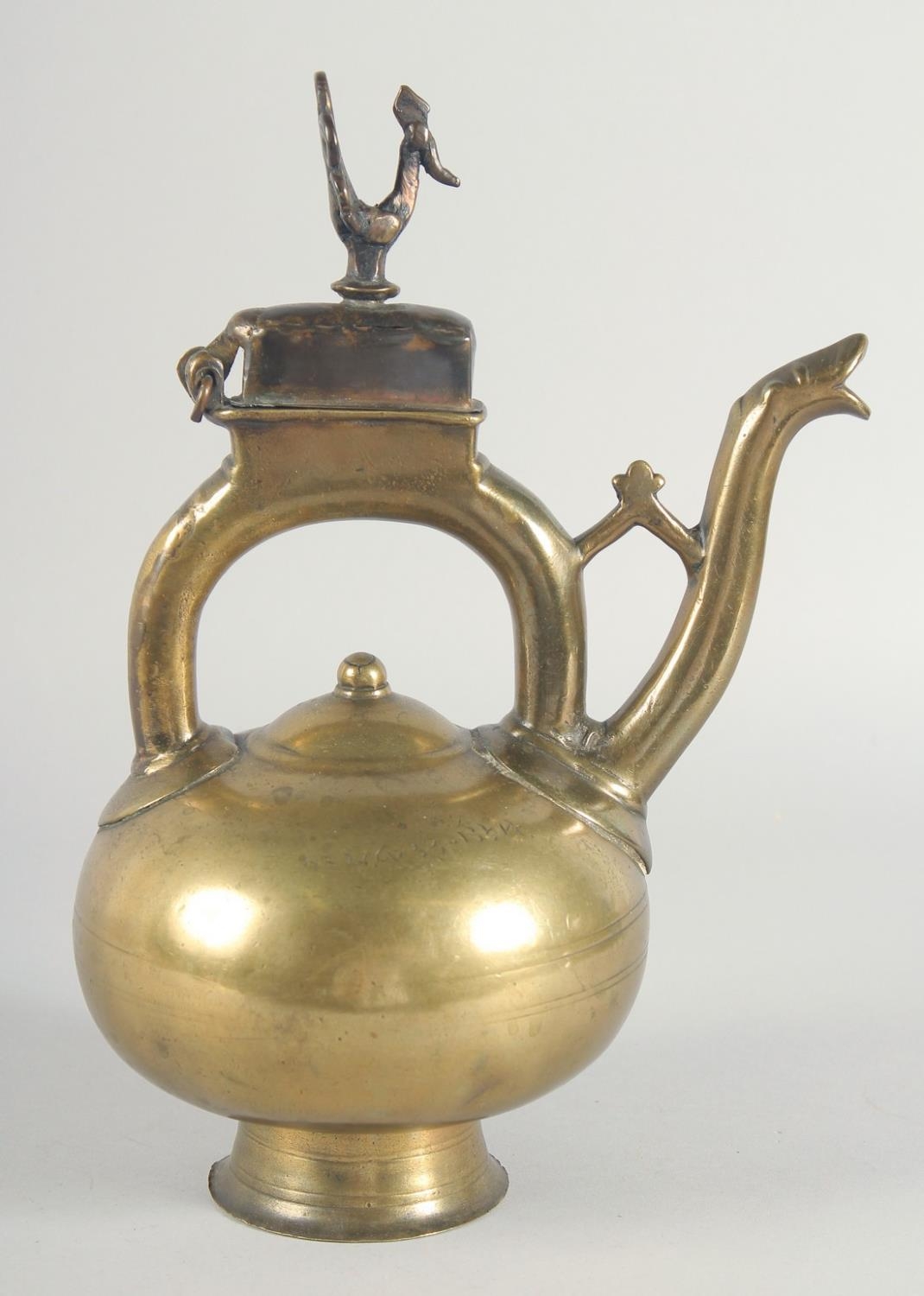 AN ISLAMIC BRONZE EWER, the handle with peacock finial, inscribed, 31cm high.