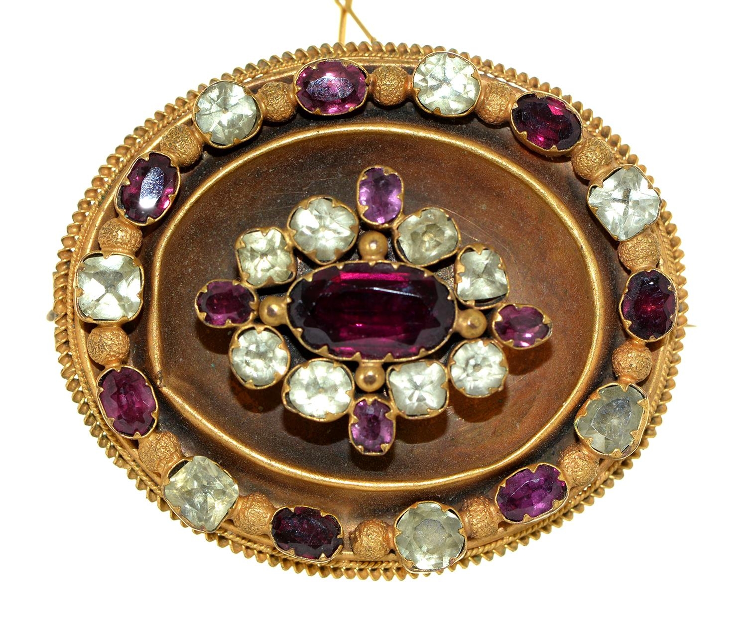 A Victorian garnet and chrysoprase brooch, c1870, in gold, locket back 44mm, 18g