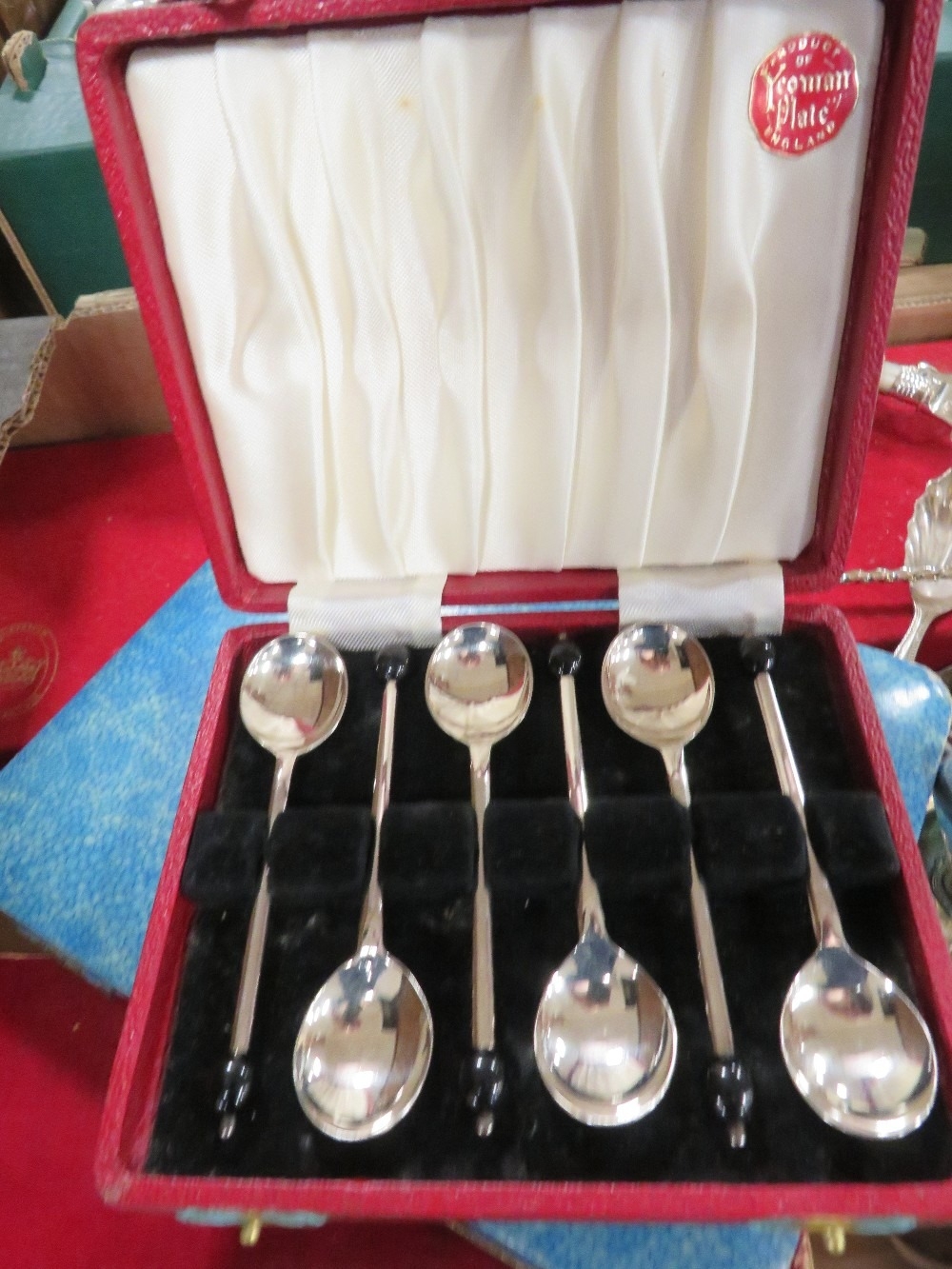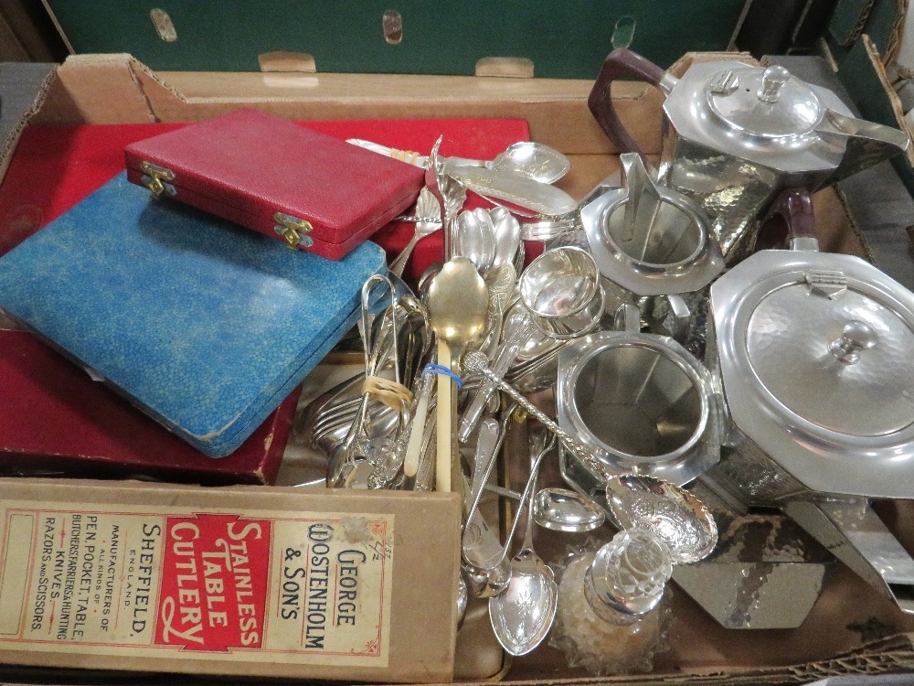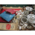 A tray of assorted silver plated ware etc to include a four piece hammered finish coffee service on tray, flatware etc