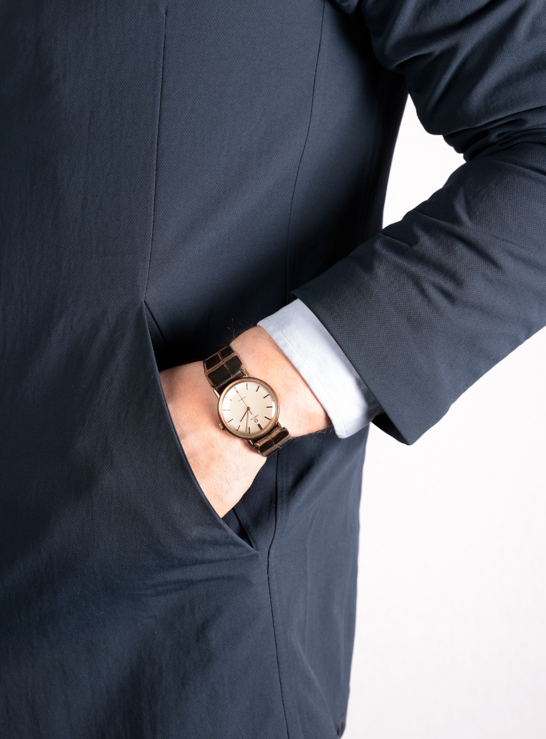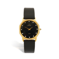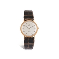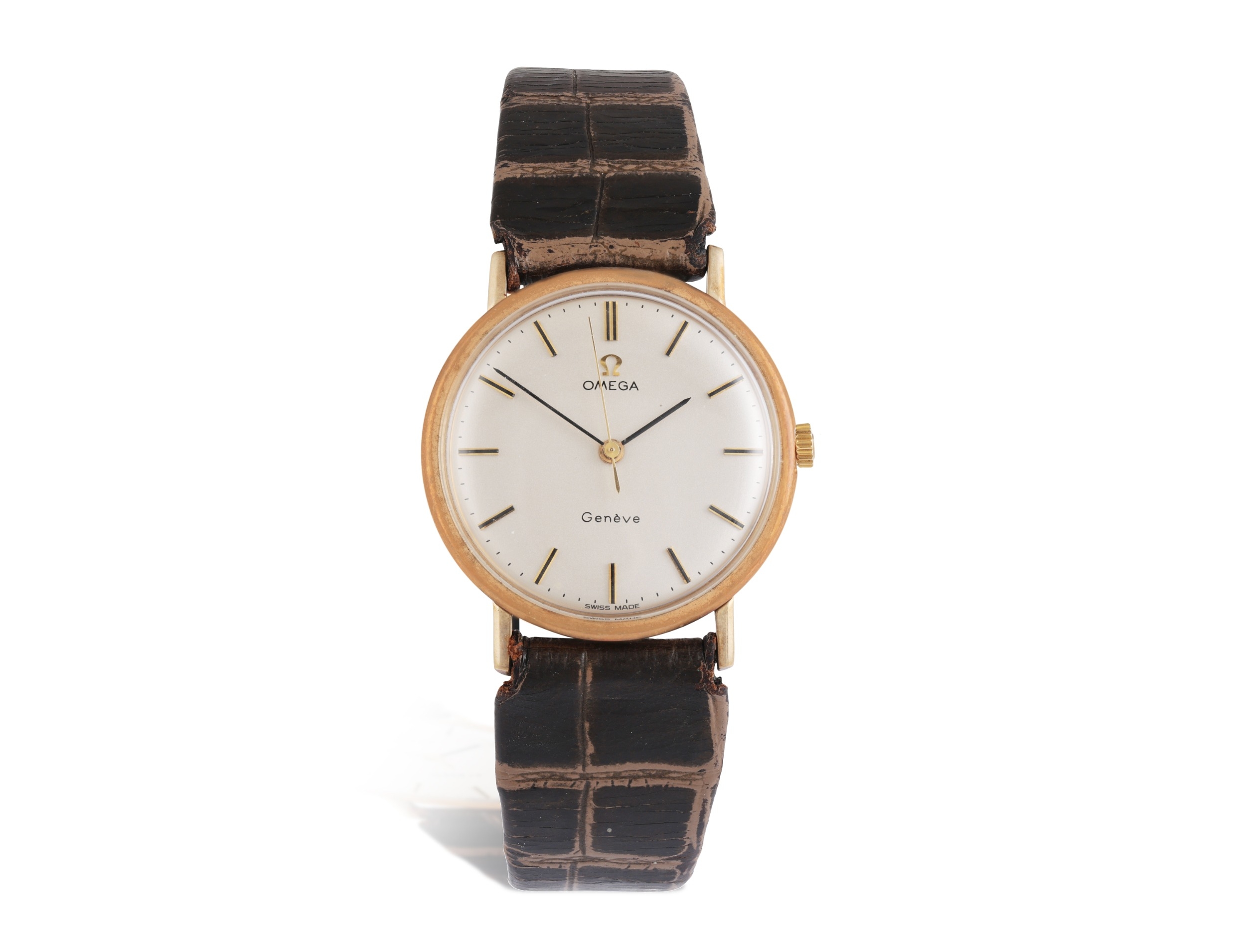 OMEGA: A MECHANICAL ‘GENÉVE’ BRACELET WATCH Mechanical movement, the circular silver dial with baton hour indicators, minute rail and knife-edge hands, within a polished case, crown with logo, to a leather-strap bracelet and buckle clasp, dial signed Omega, case engraved to reverse ‘Presented to N.Caulfield by F.W. Woolworth & Co Ltd for 21 years of service’, case 33mm * This lot is sold without a reserve