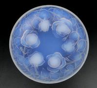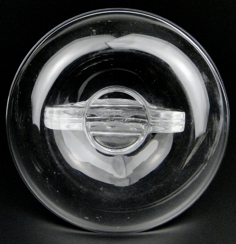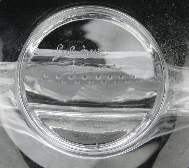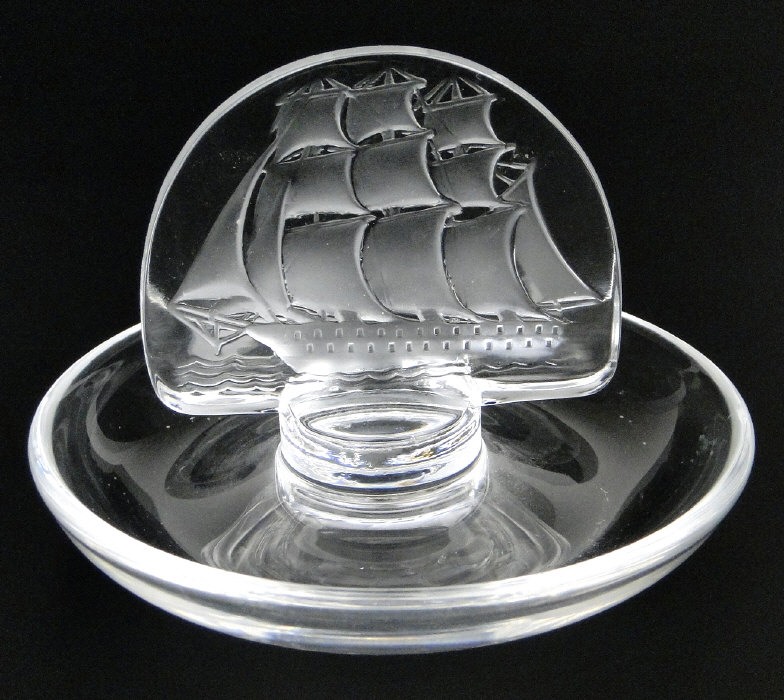 Lalique glass dish moulded with a central rigged sailing ship, engraved factory mark to the base, 9cm diameter