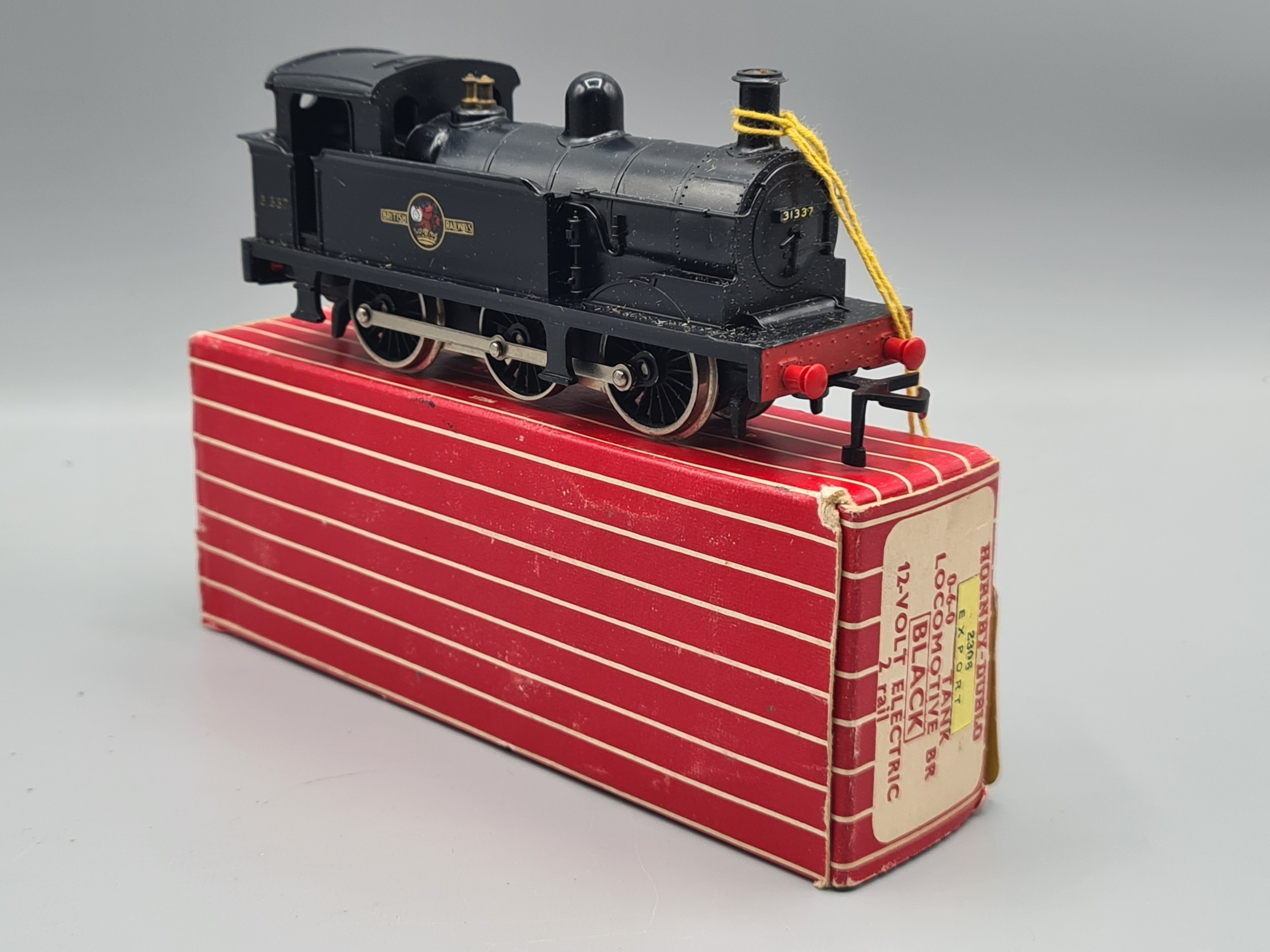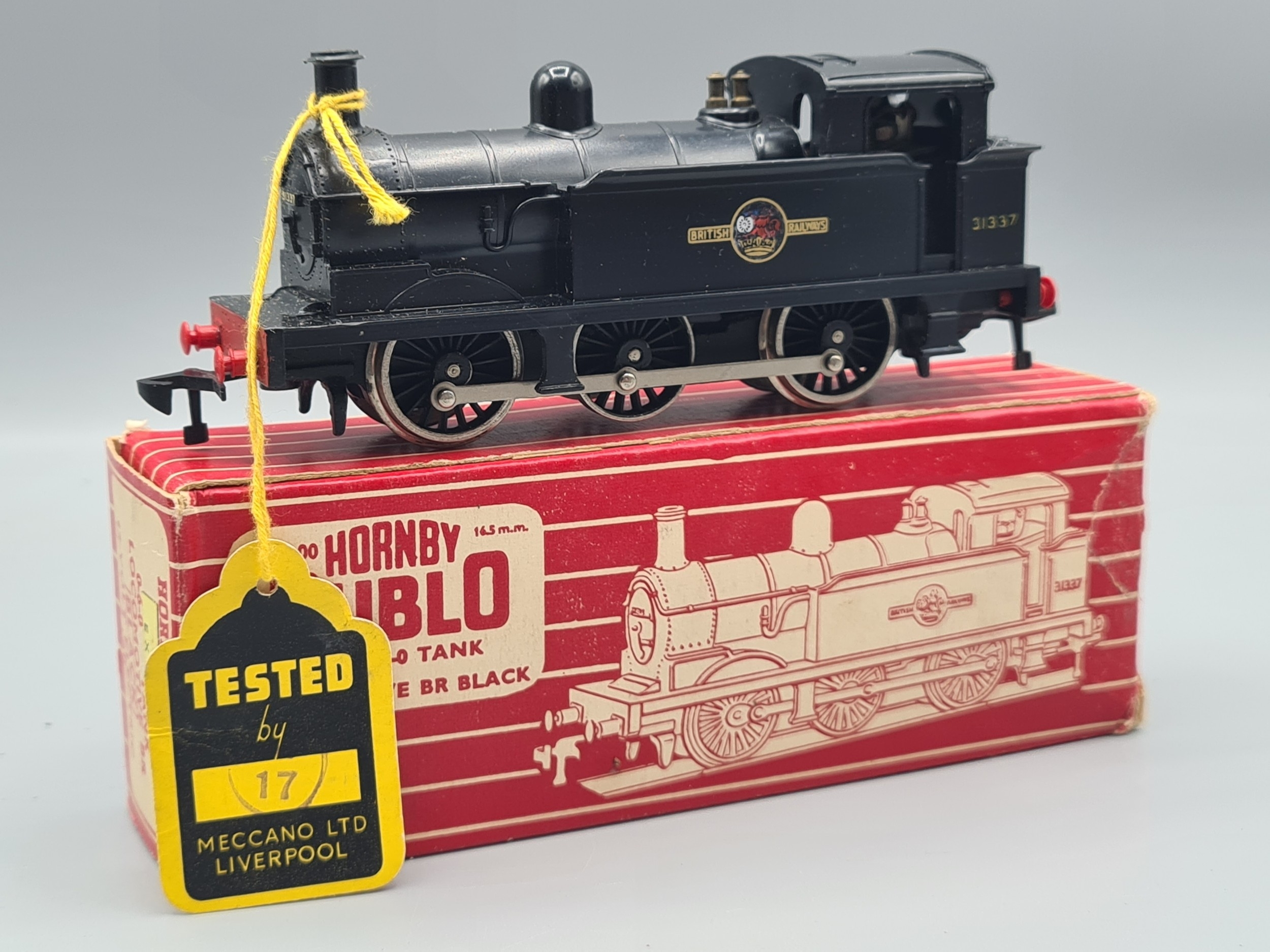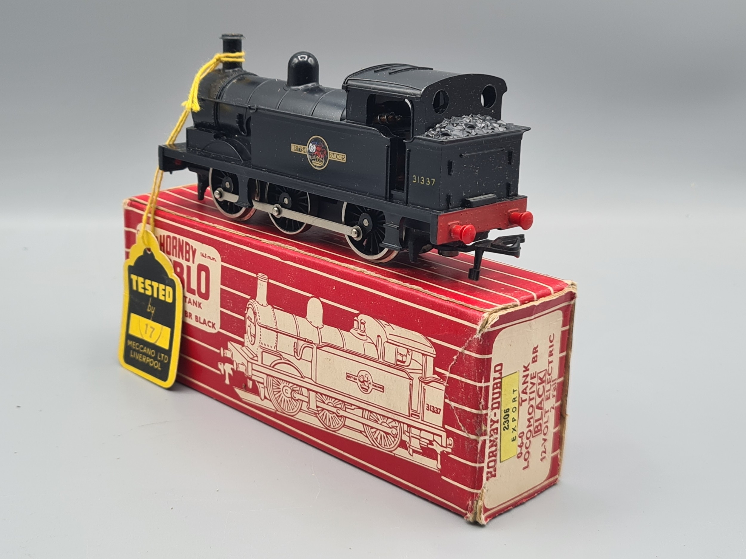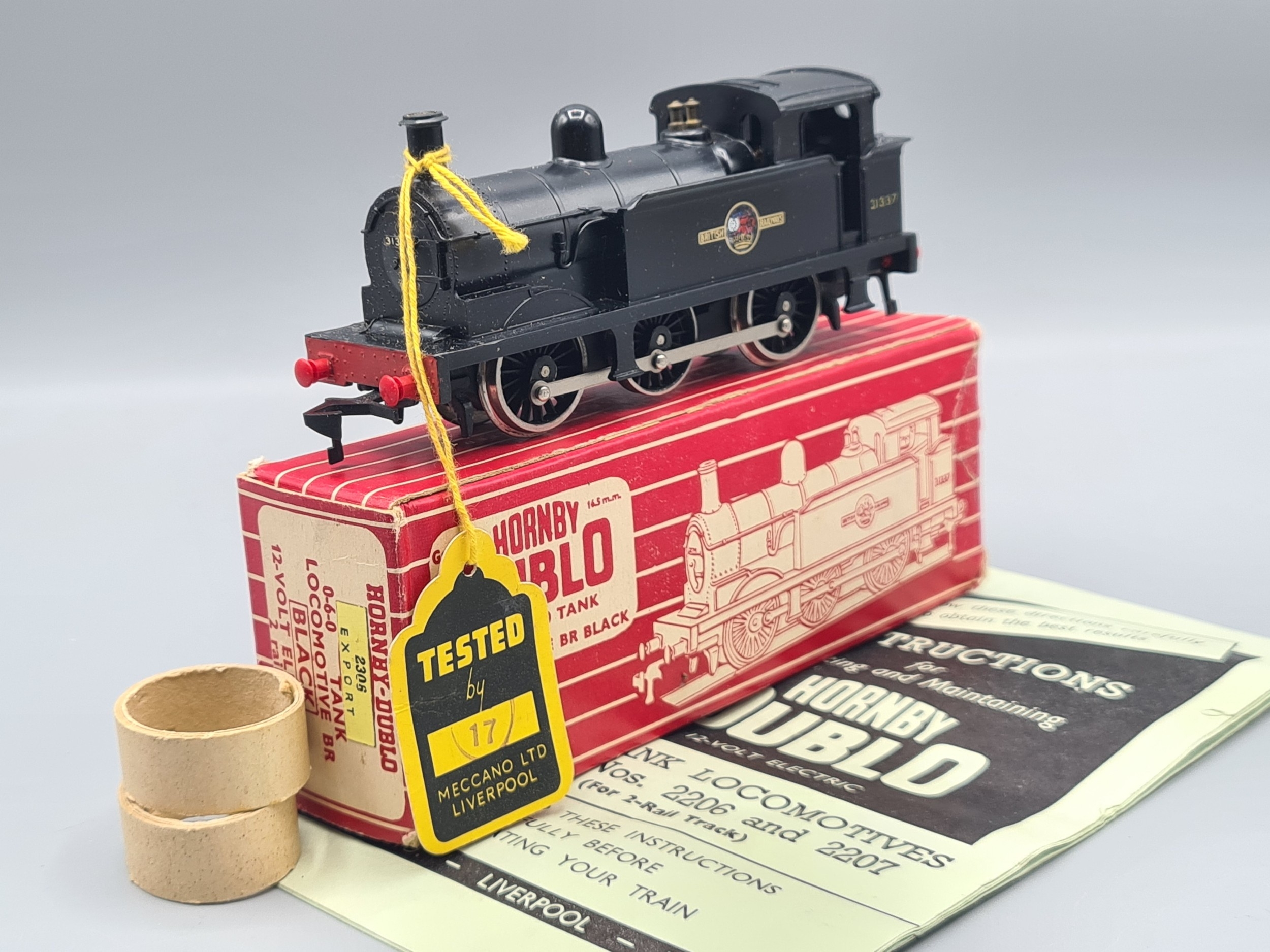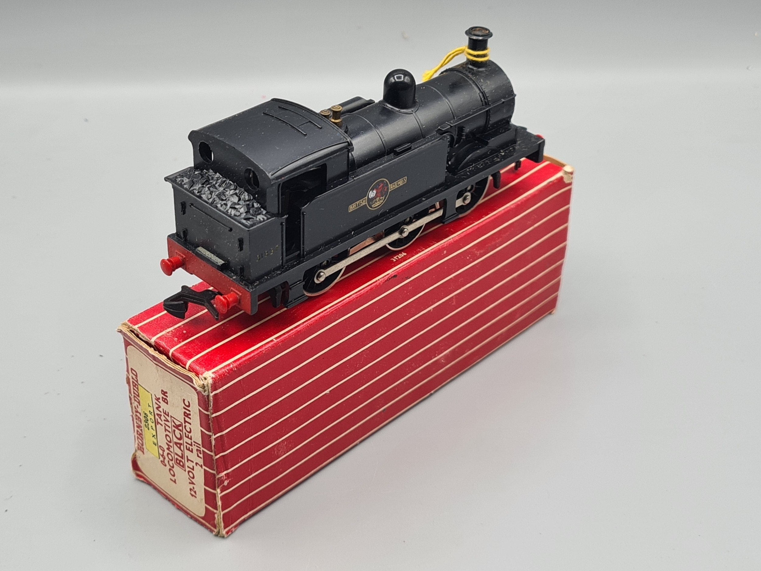 A boxed Hornby Dublo Export 2306 black 0-6-0T with NPC couplings and red plastic buffers, M. Box Ex-Ex plus, slight repair at one end