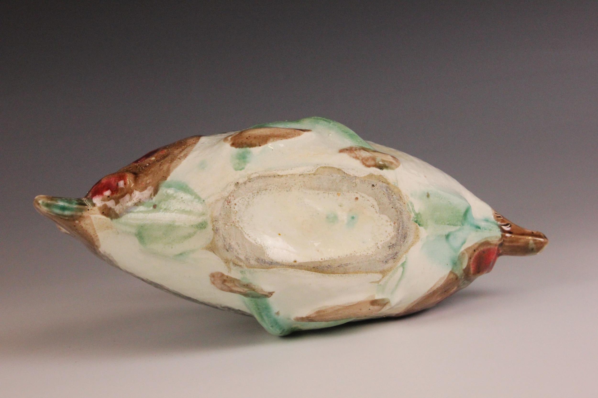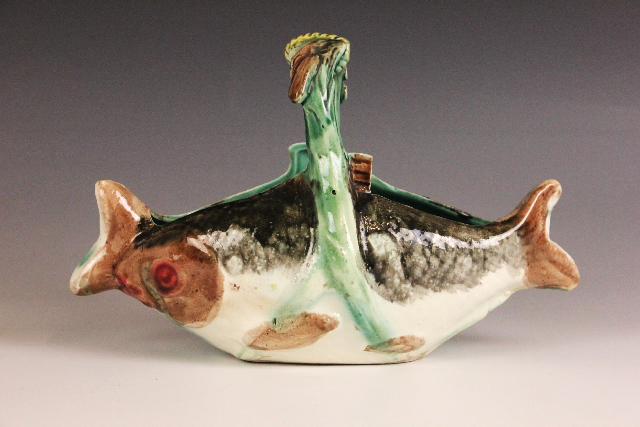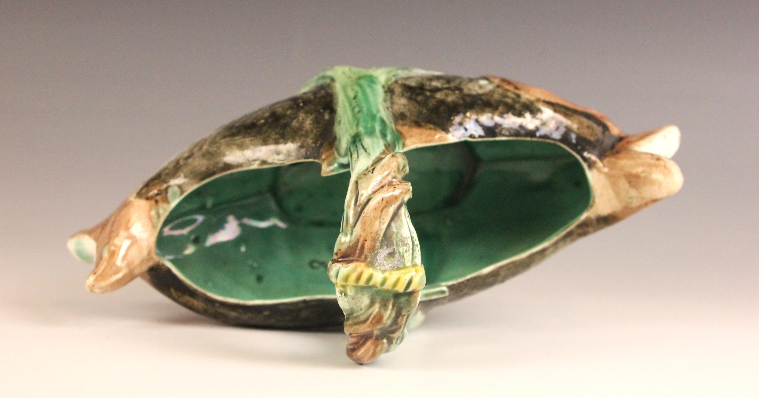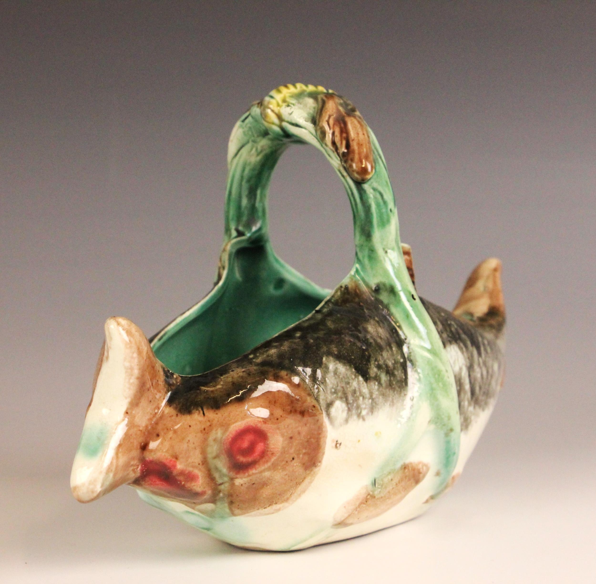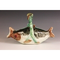 An English Majolica fish basket, 19th century, modelled as two fish joined by a seaweed handle, 23cm long, 14cm high