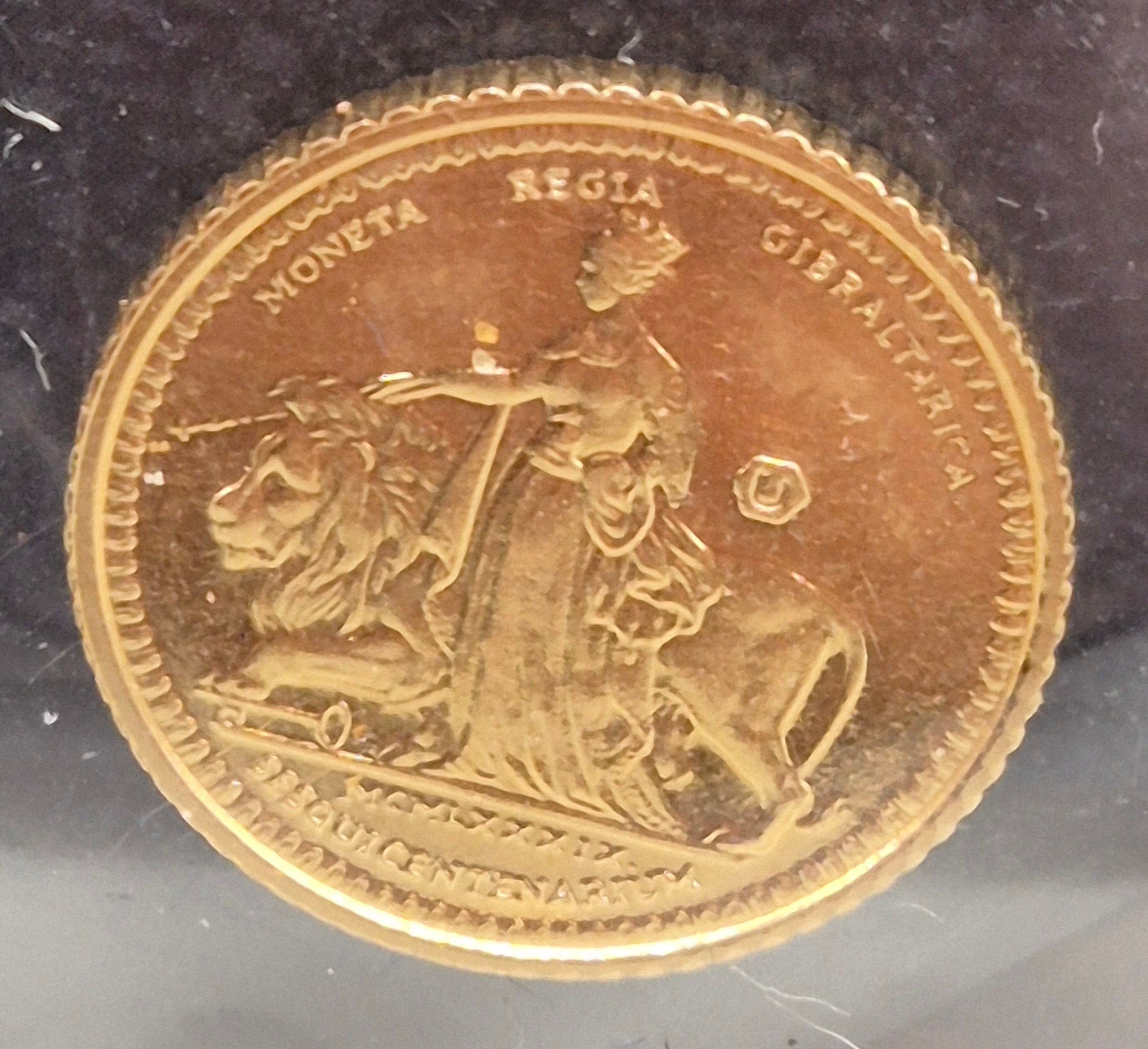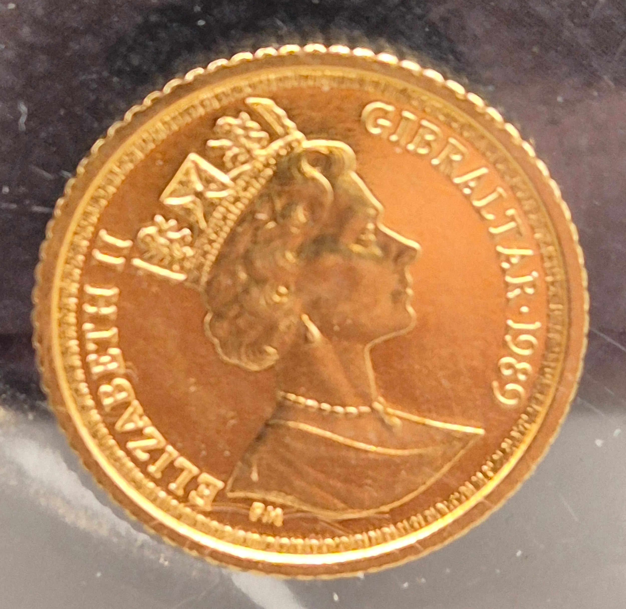 Pobjoy Mint yellow gold 1989 Elizabeth II Gibraltar quarter Sovereign coin. 2.12grams