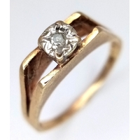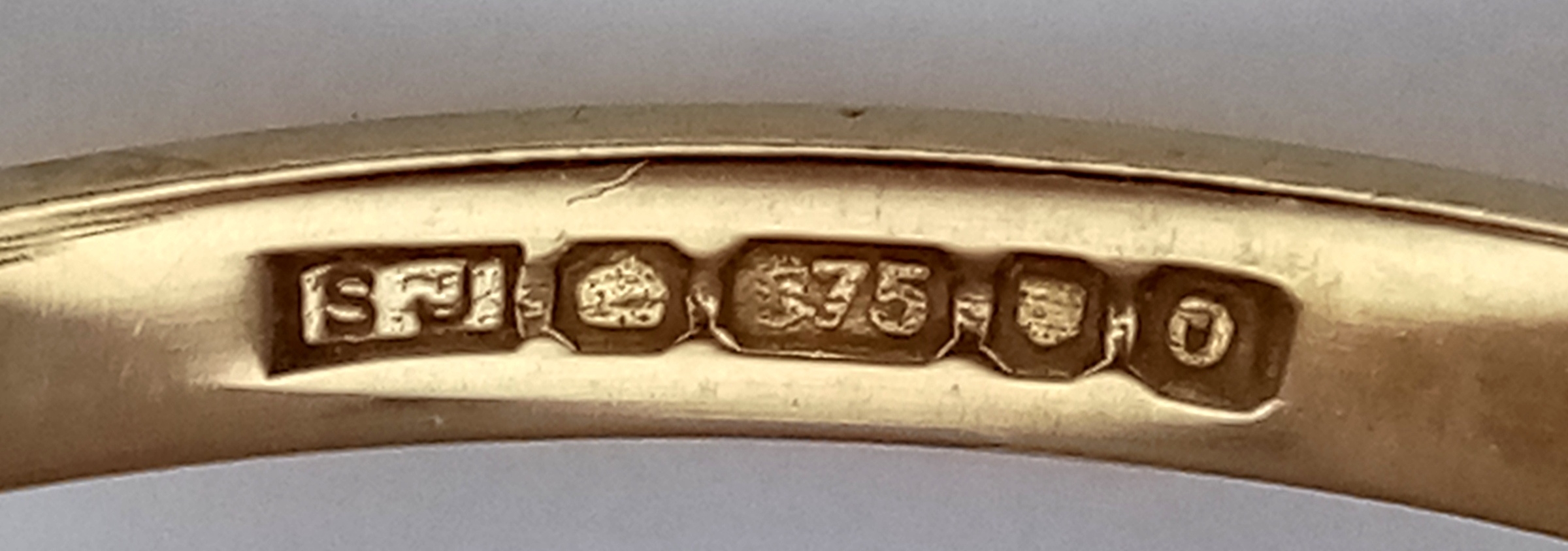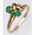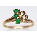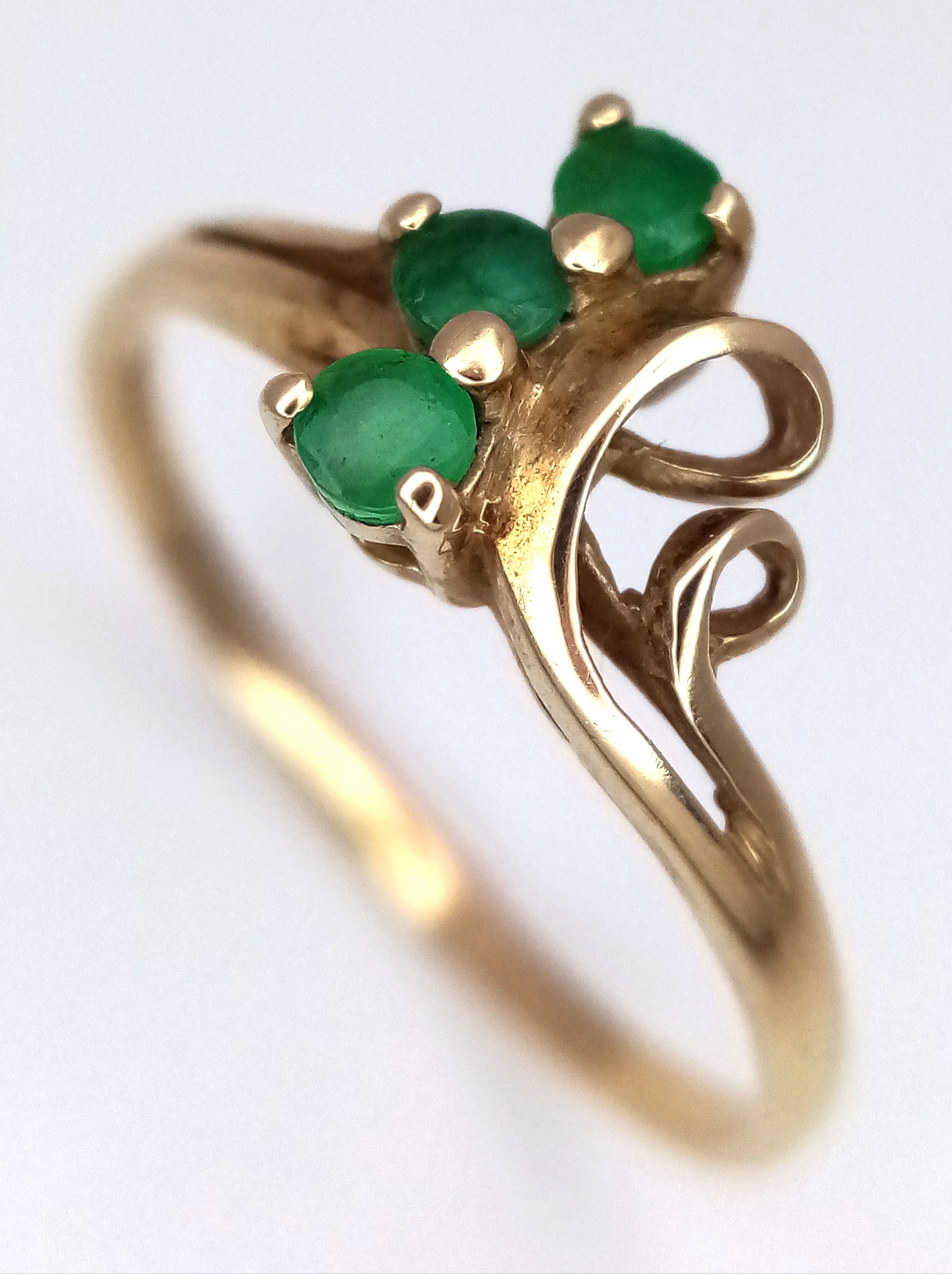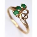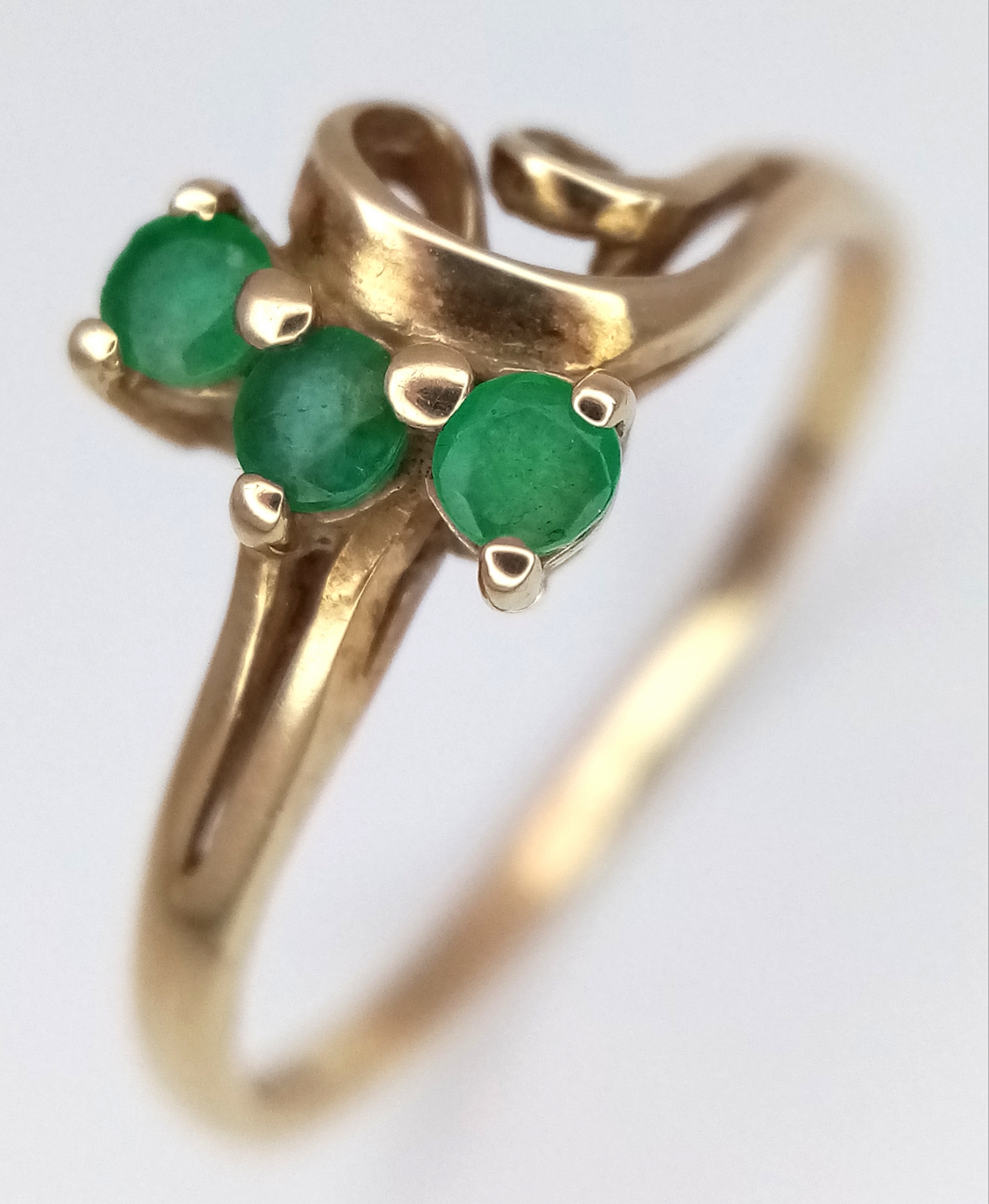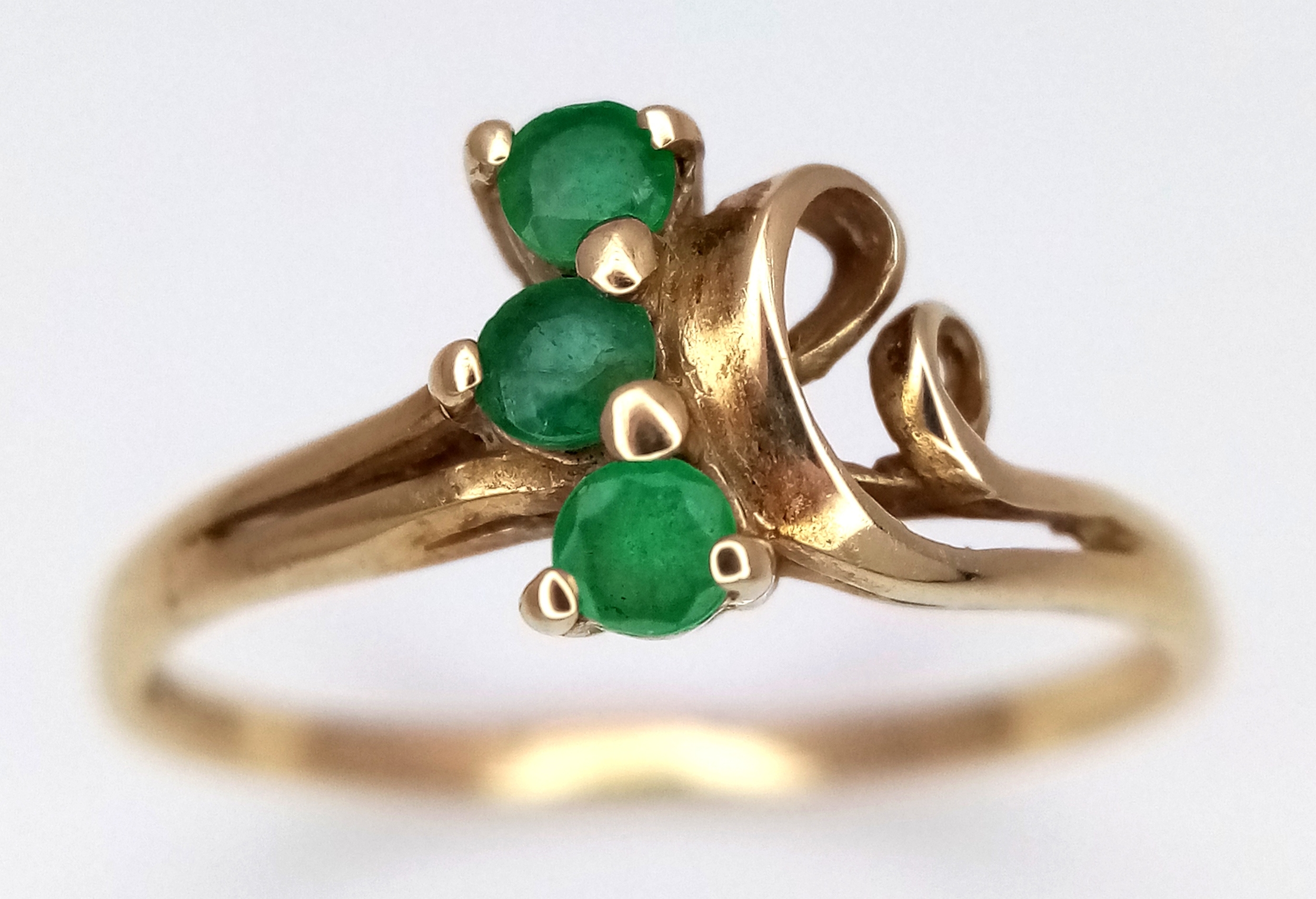 A 9K Yellow Gold Three Stone Emerald Ring. Size M. 1.2g.
